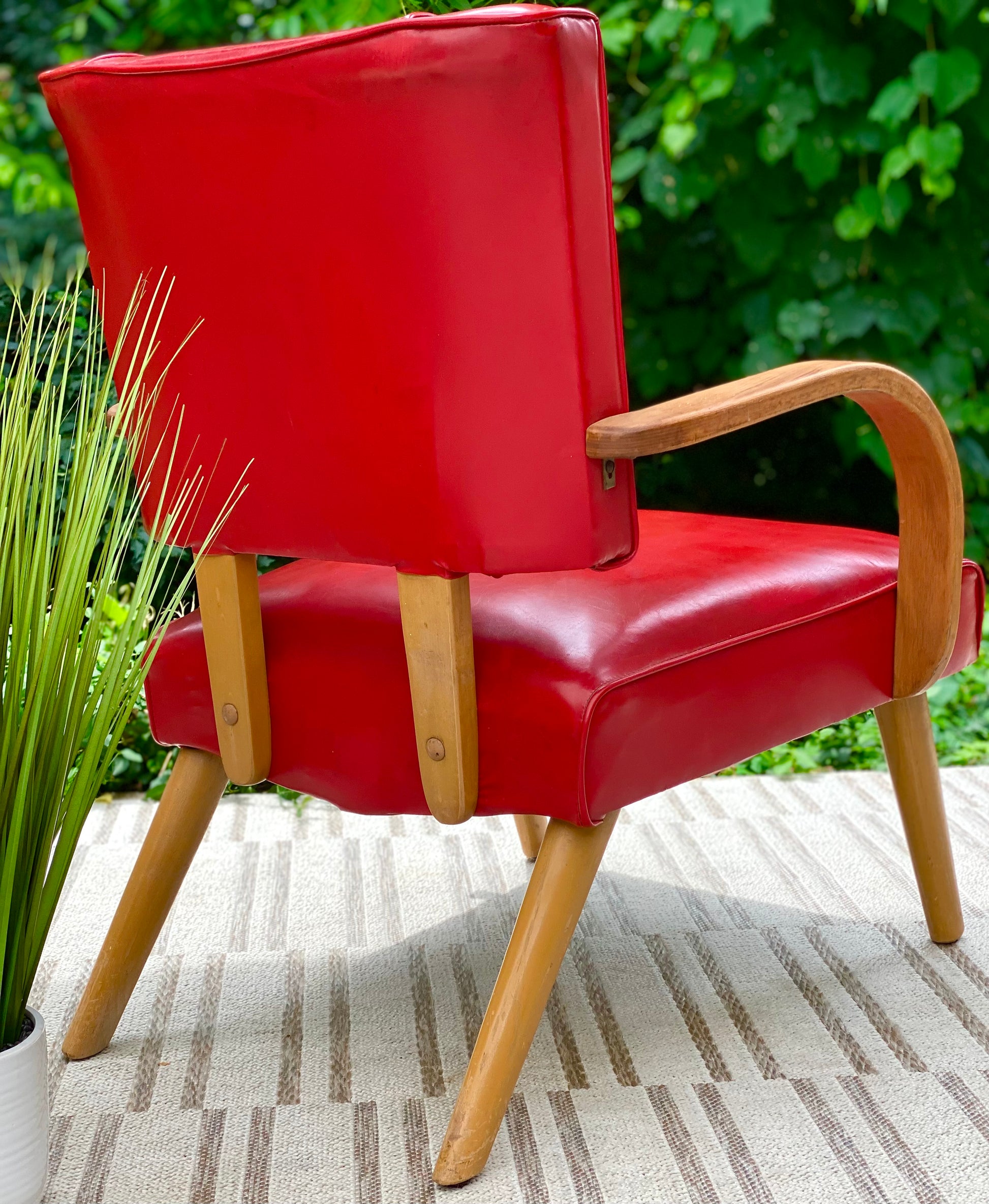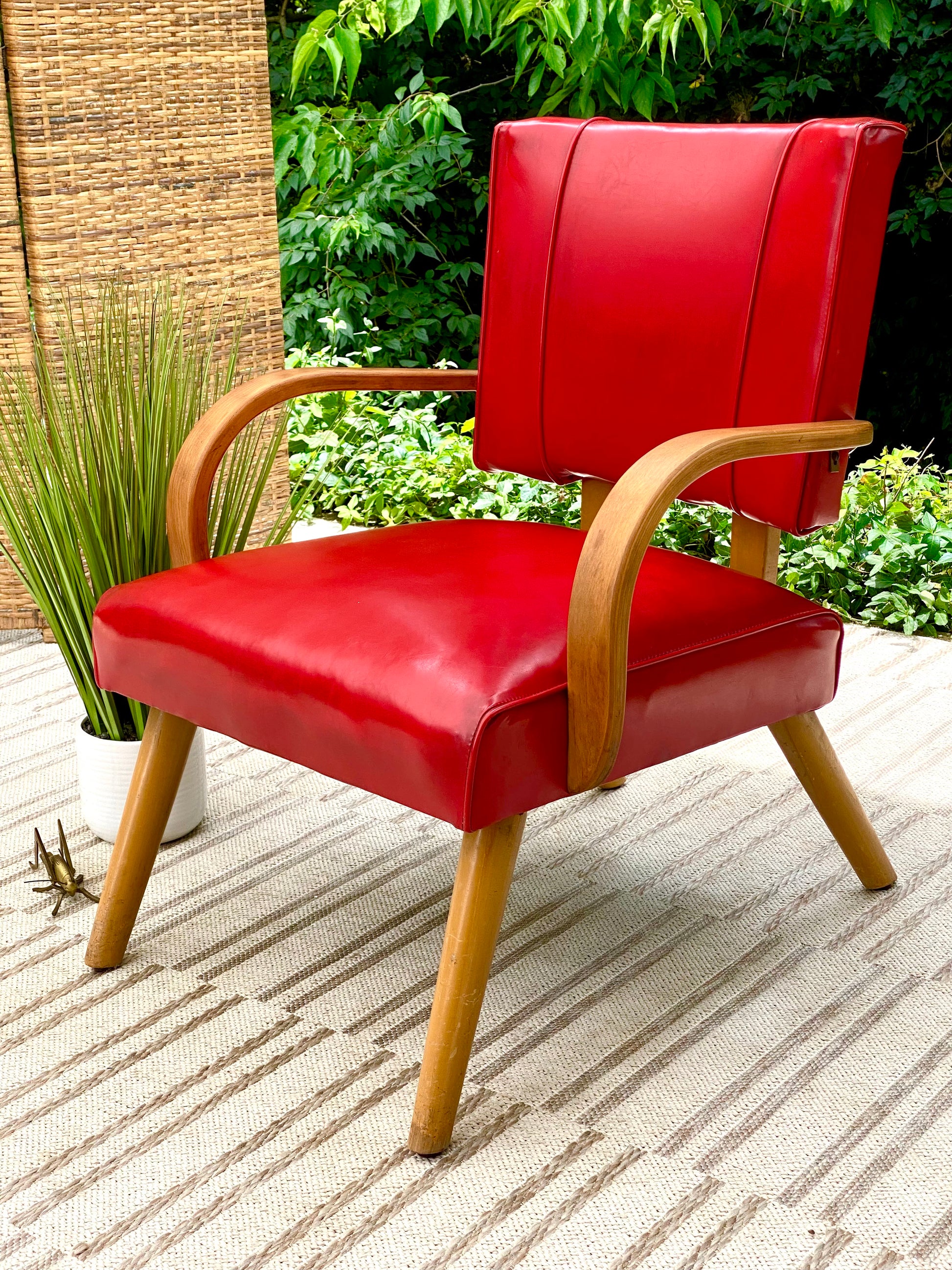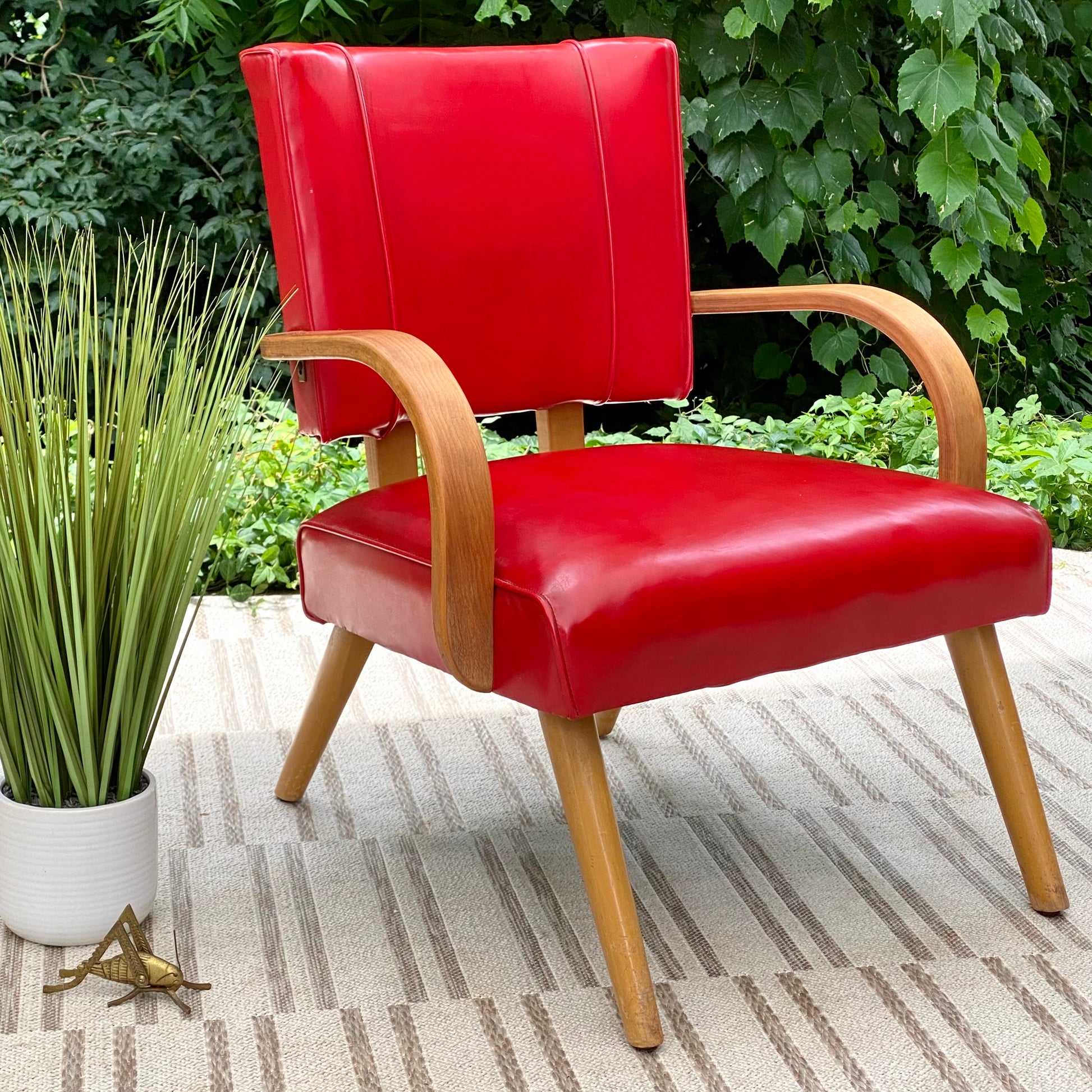 SOLD - Vintage MCM Viking Vito Baumritter red vinyl bentwood accent armchair. All original. 32" x 23" x 28" Good condition.
