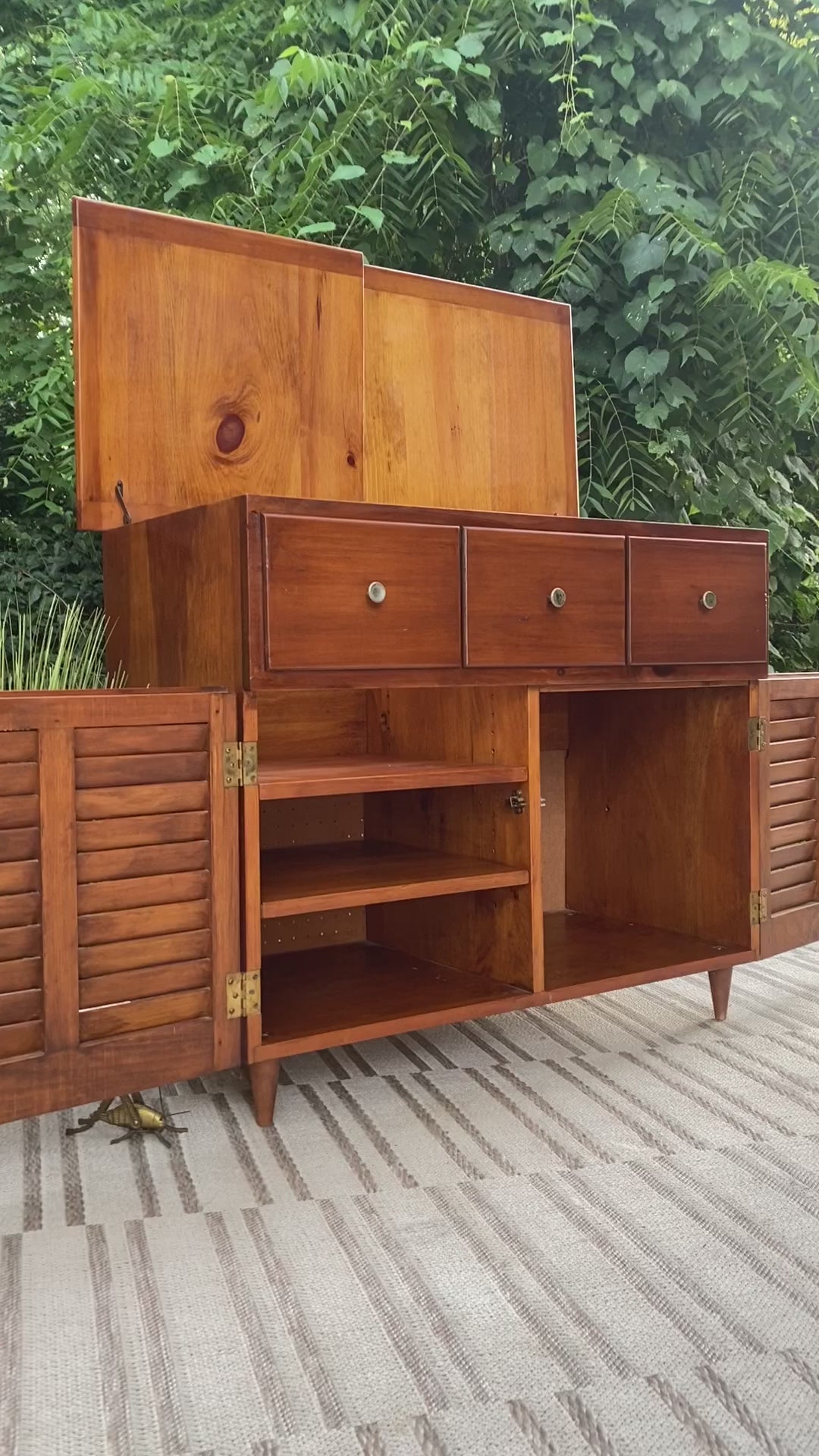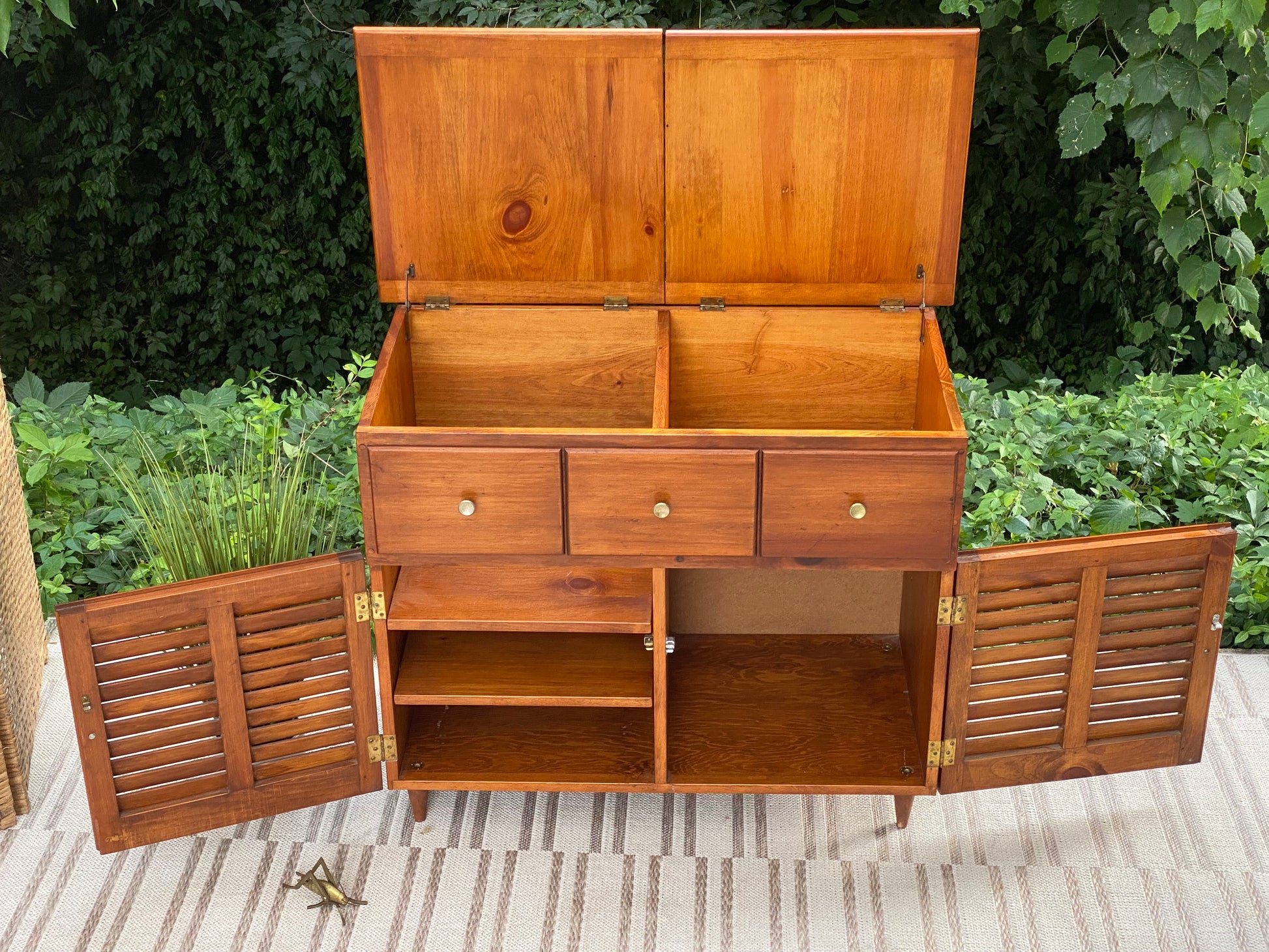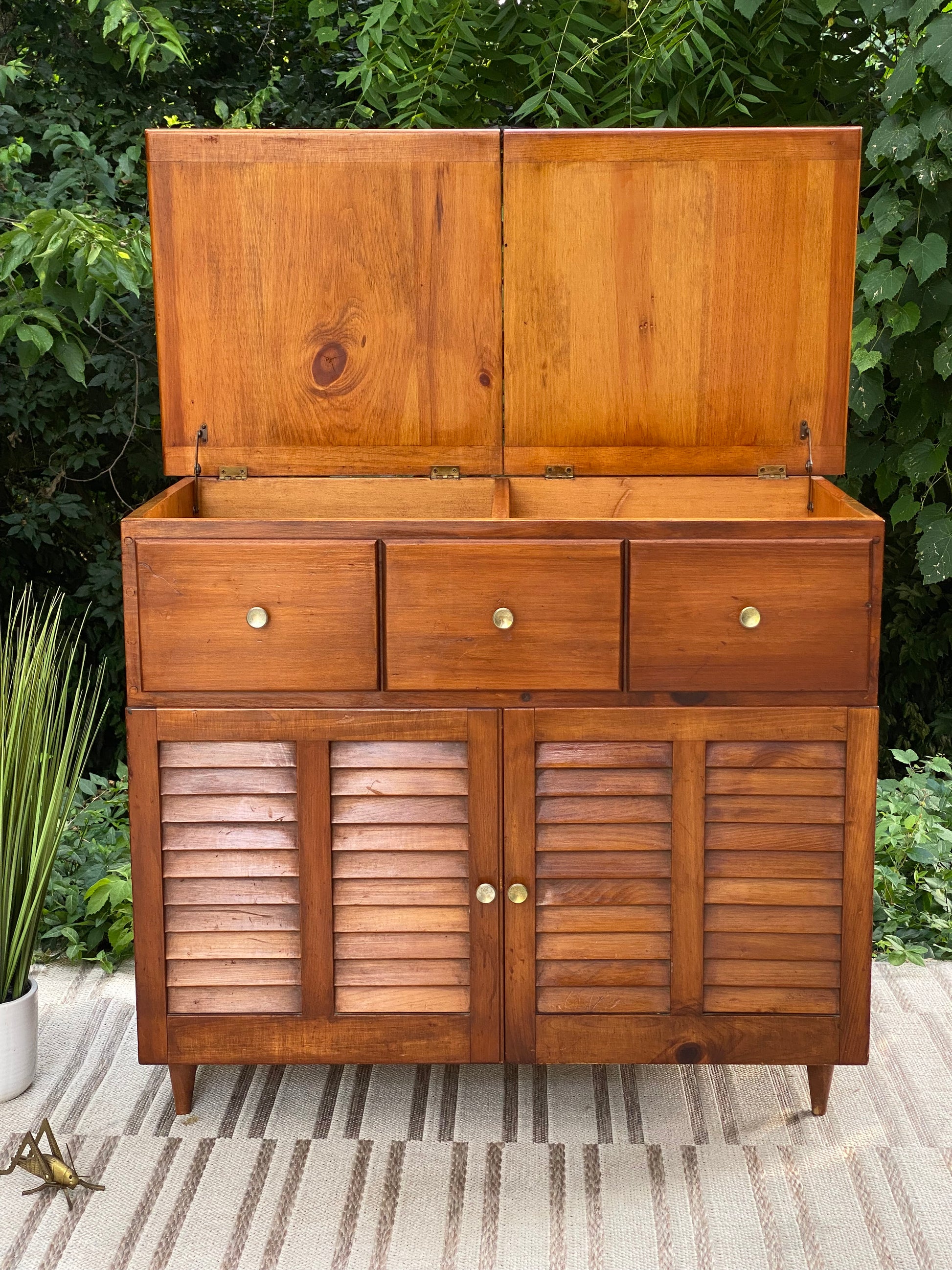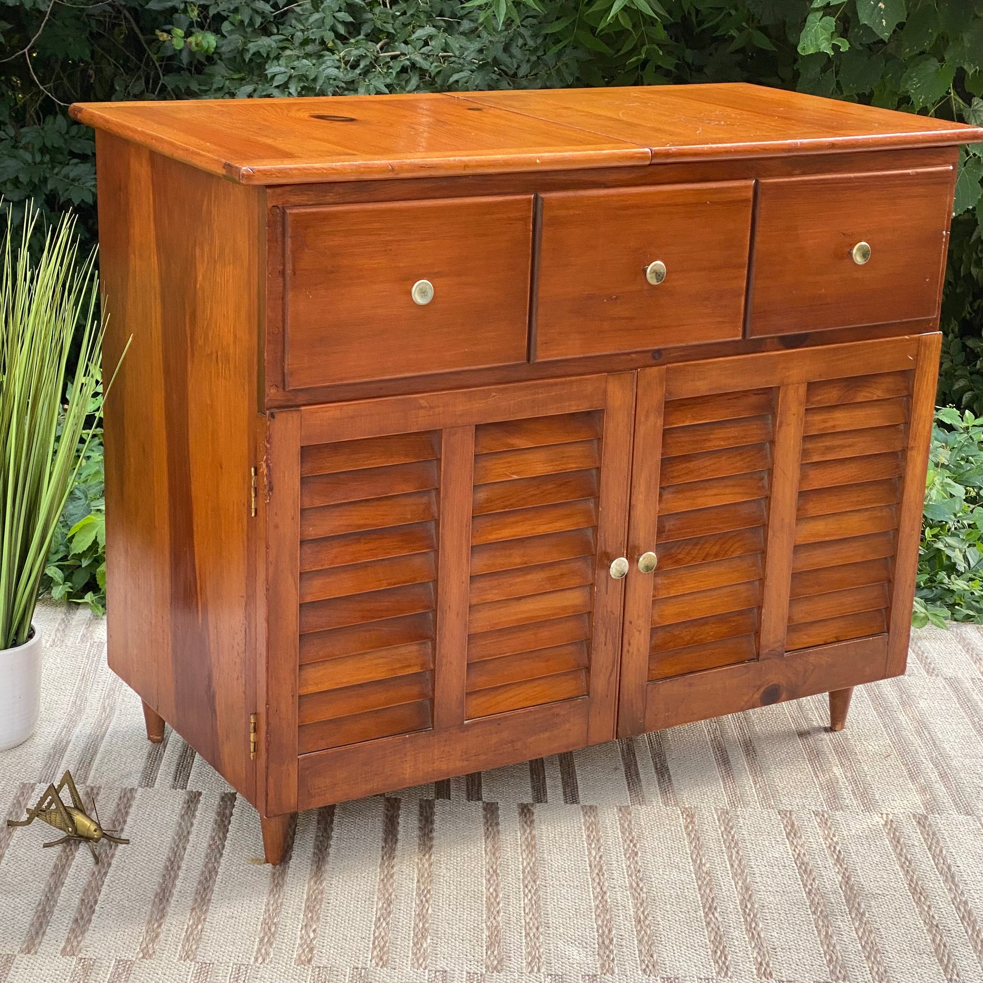 SOLD - Check out this retro MCM pine bar cabinet. Great for storage and a classic design. 30" x 36" x 20". Good condition