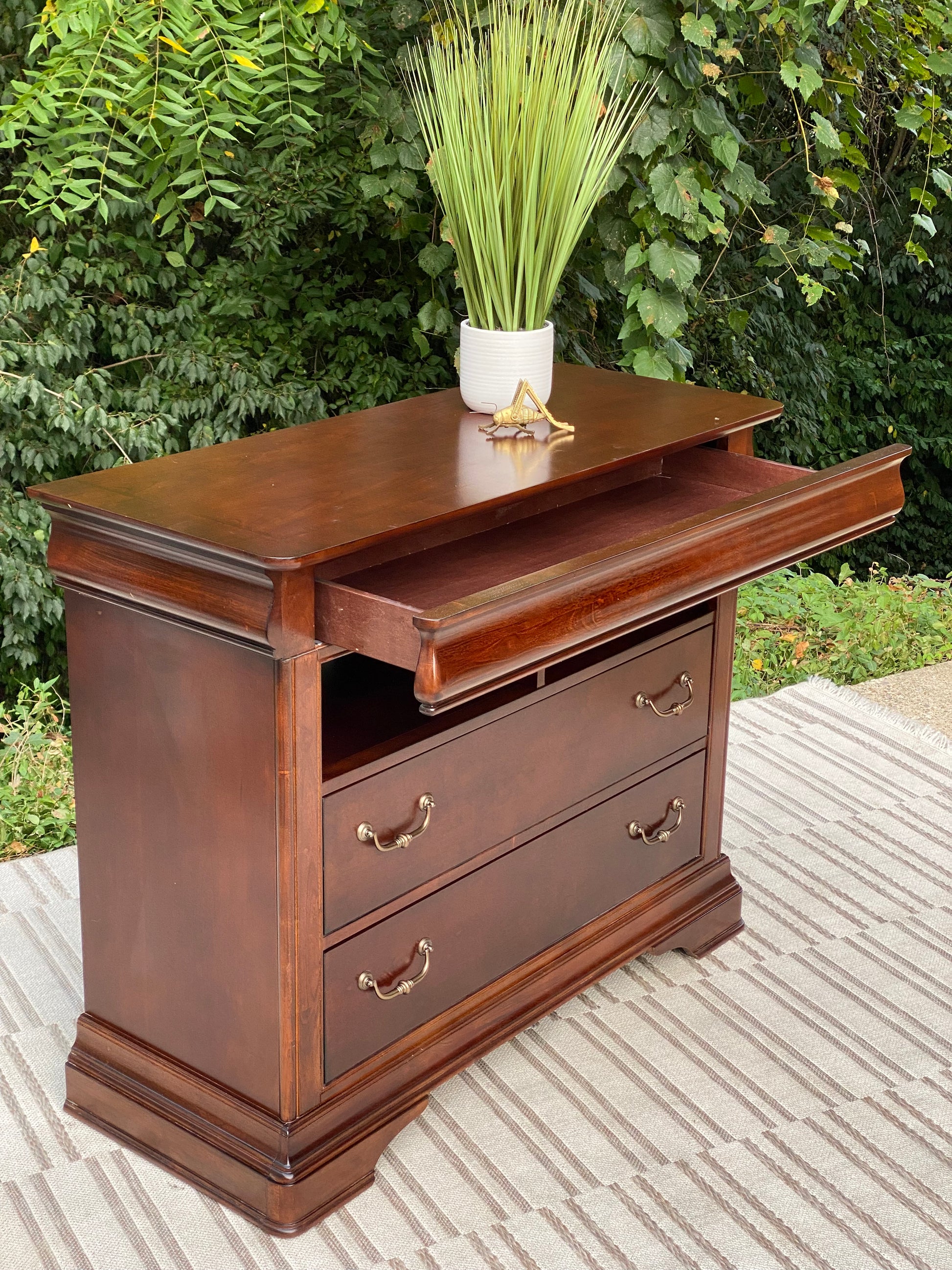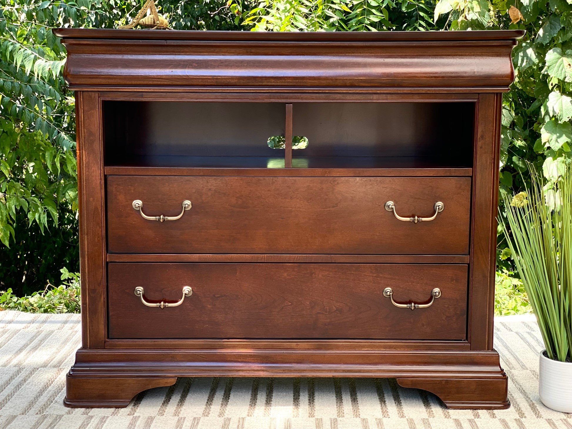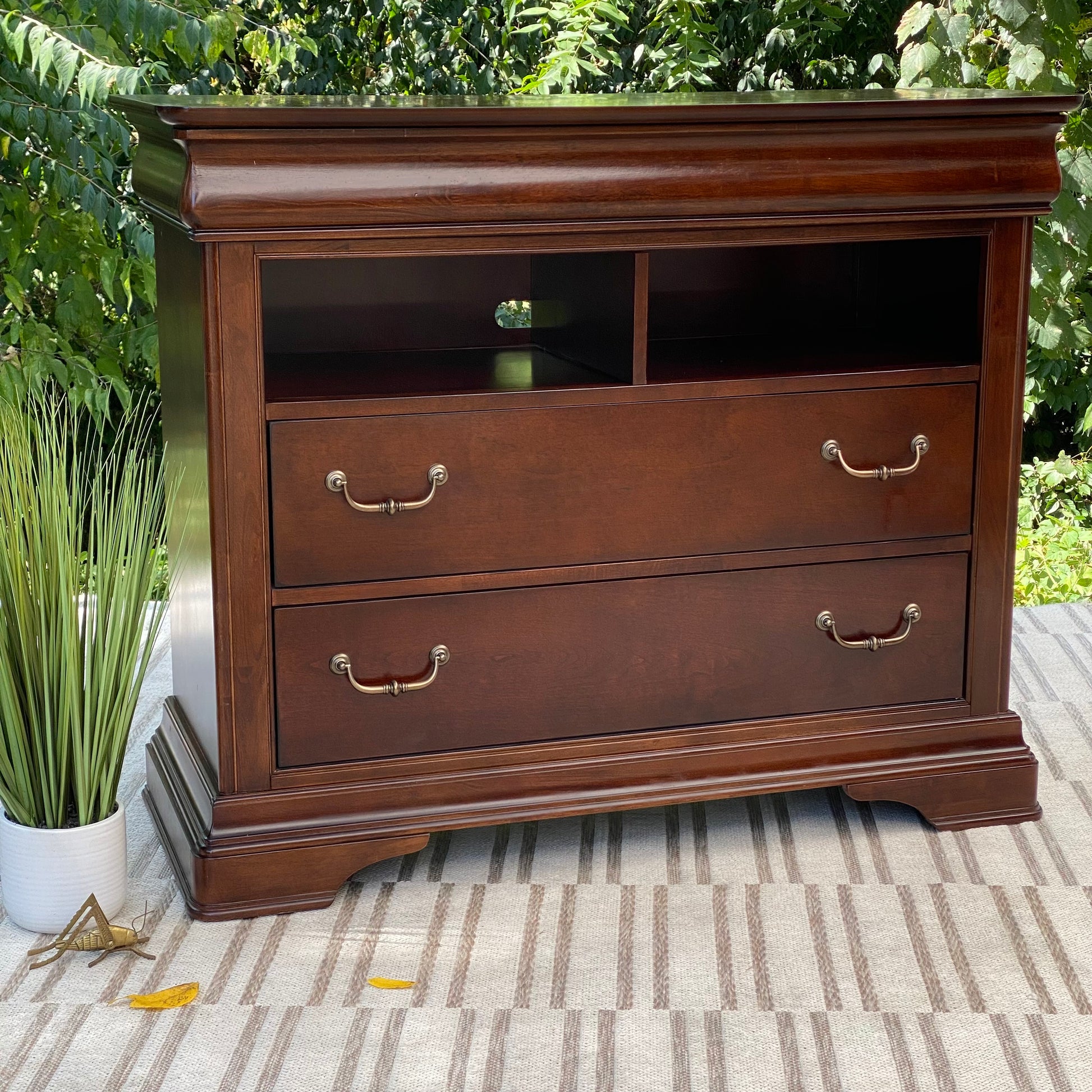 SOLD - Newest Arrival! 🧡🍁 Check out this Orleans cherry media cabinet. Two lower drawers for lots of storage and a pull out tray for sorting. Nice piece overall and could be used for many other rooms (and also a small bar area!) 38” x 46” x 19” Good condition