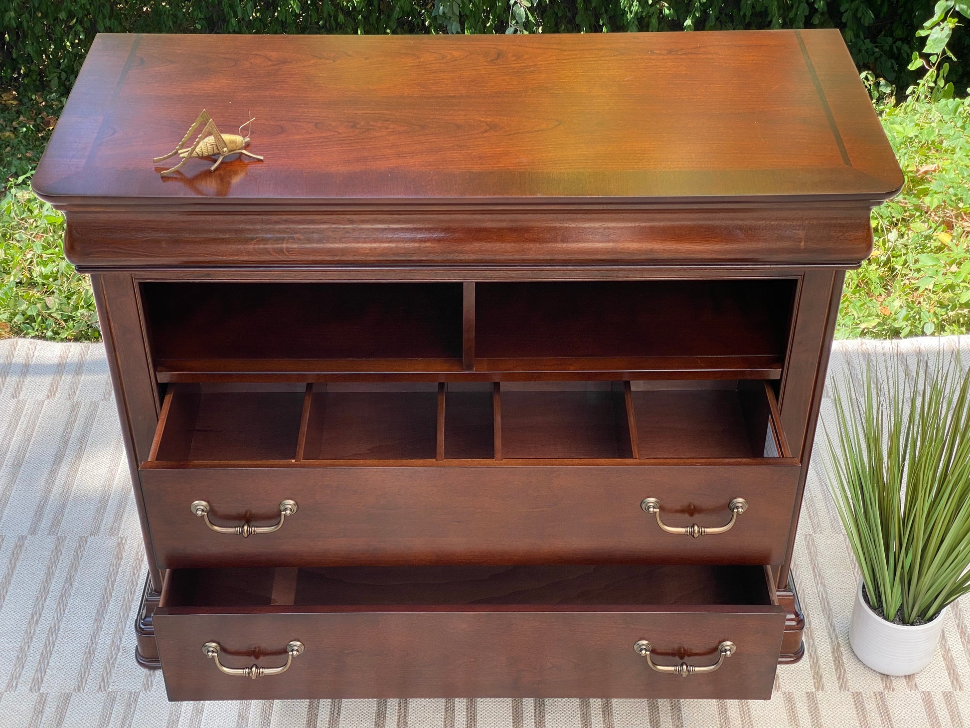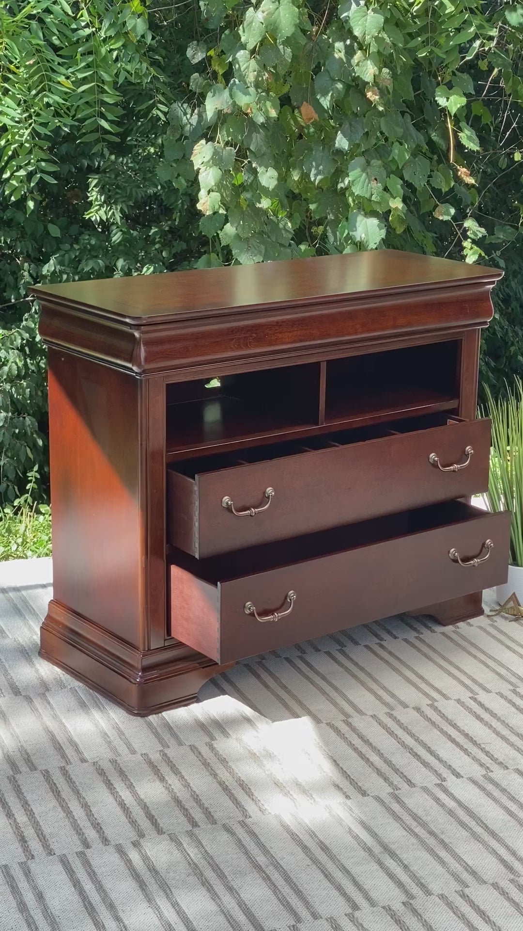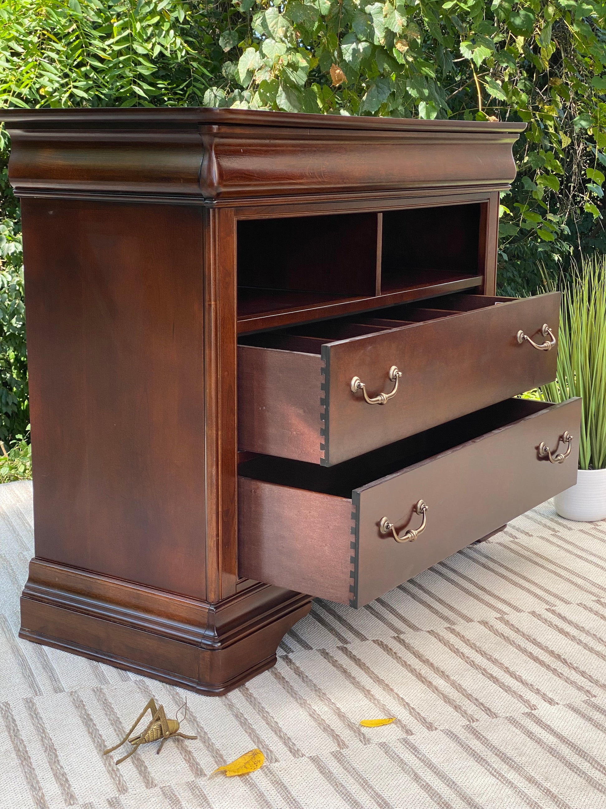 SOLD - Newest Arrival! 🧡🍁 Check out this Orleans cherry media cabinet. Two lower drawers for lots of storage and a pull out tray for sorting. Nice piece overall and could be used for many other rooms (and also a small bar area!) 38” x 46” x 19” Good condition