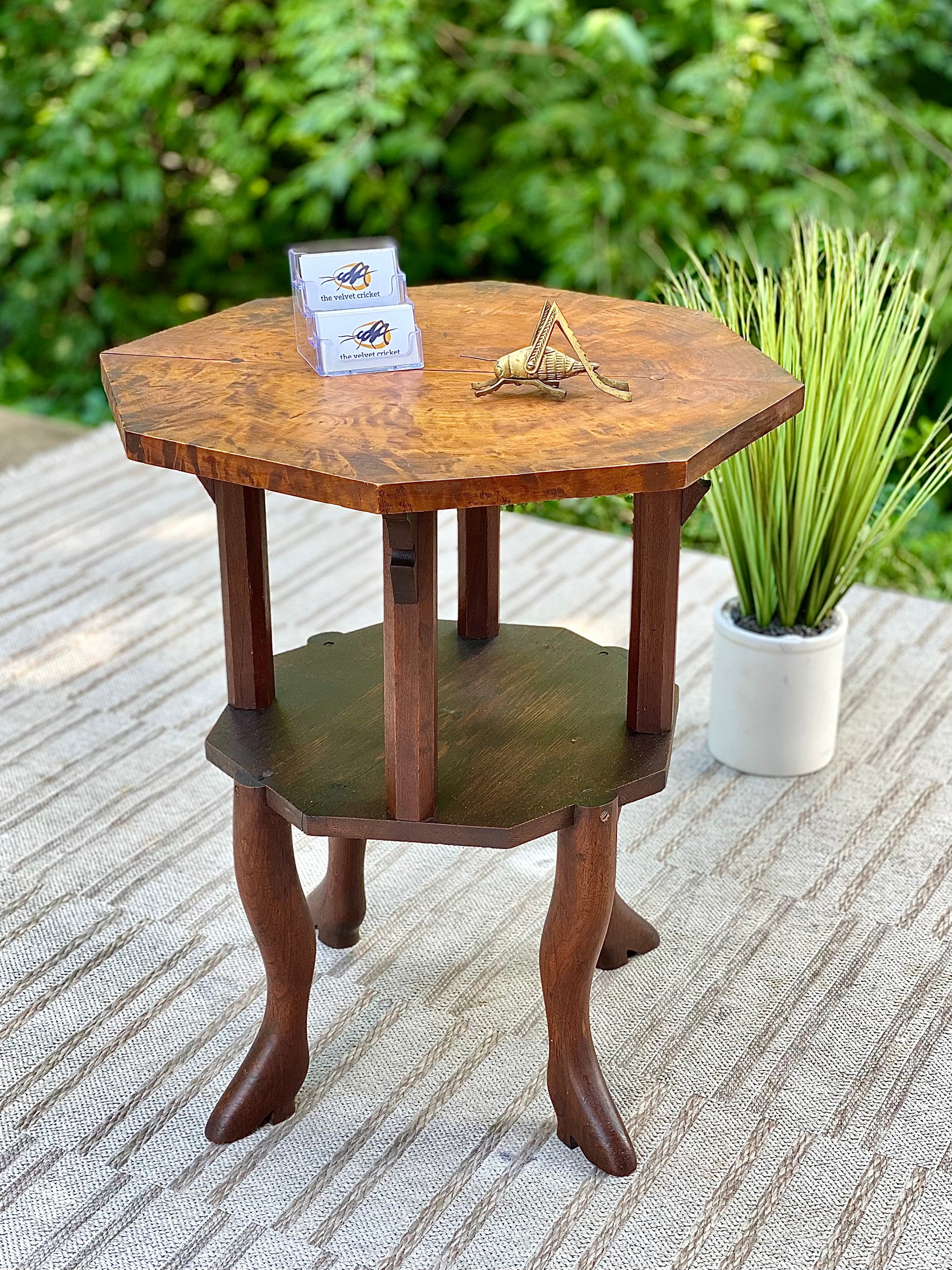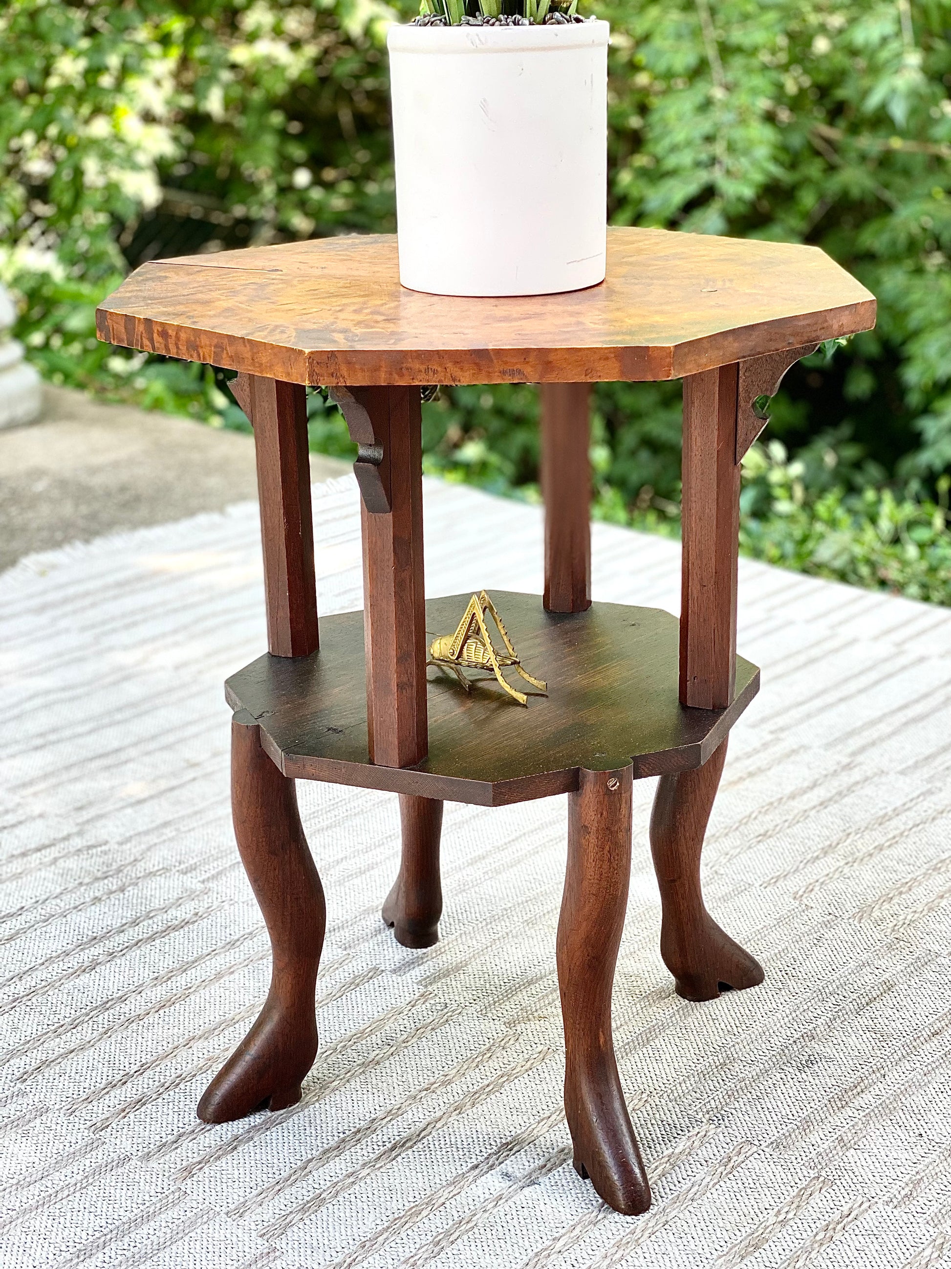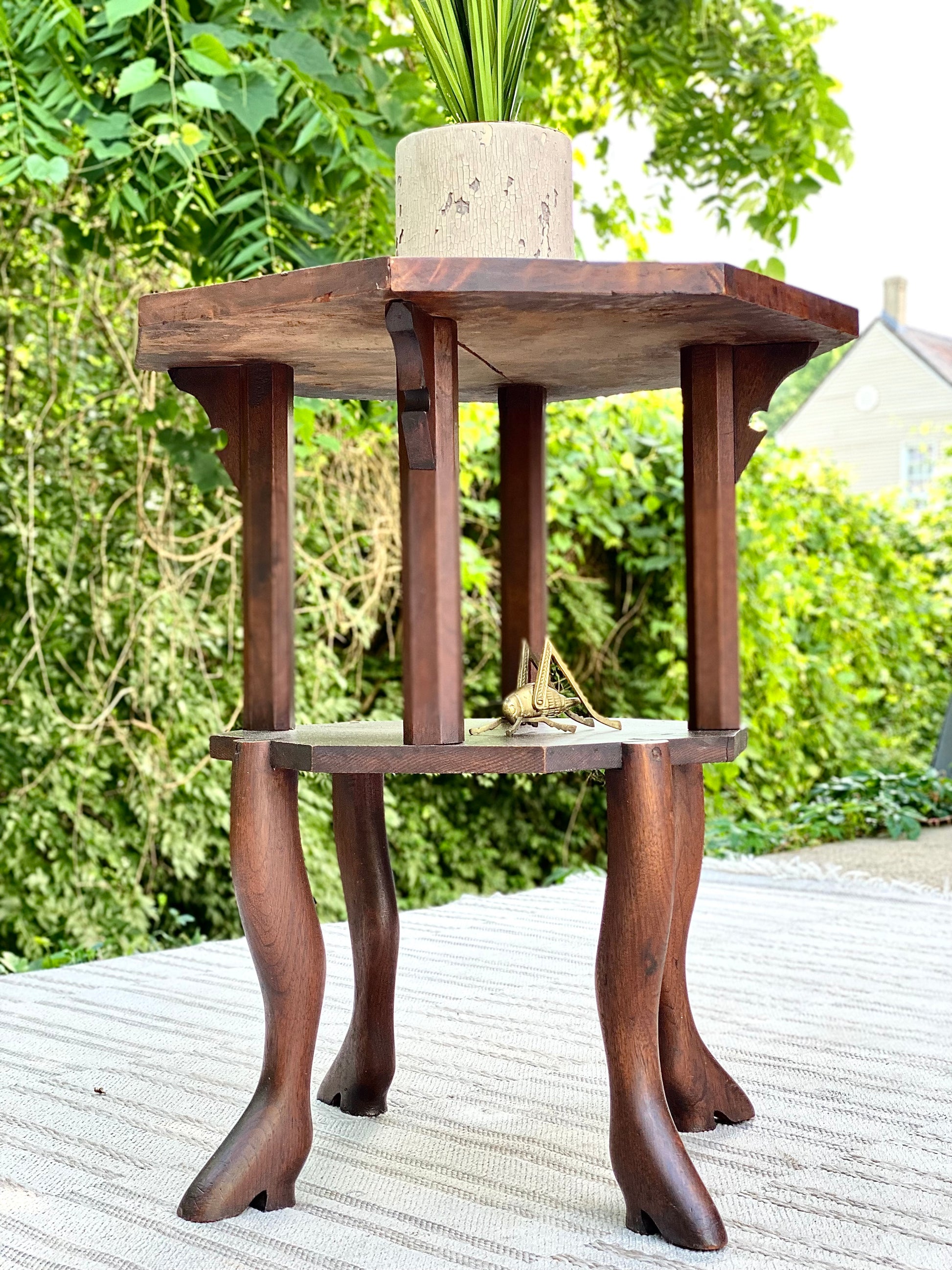 SOLD - Fresh find! 🪴🌱 We love this antique Burwood handmade plant stand side table. Unique design and a perfect piece for a corner with a beautiful plant. 29”h x 26” x 26” Good condition