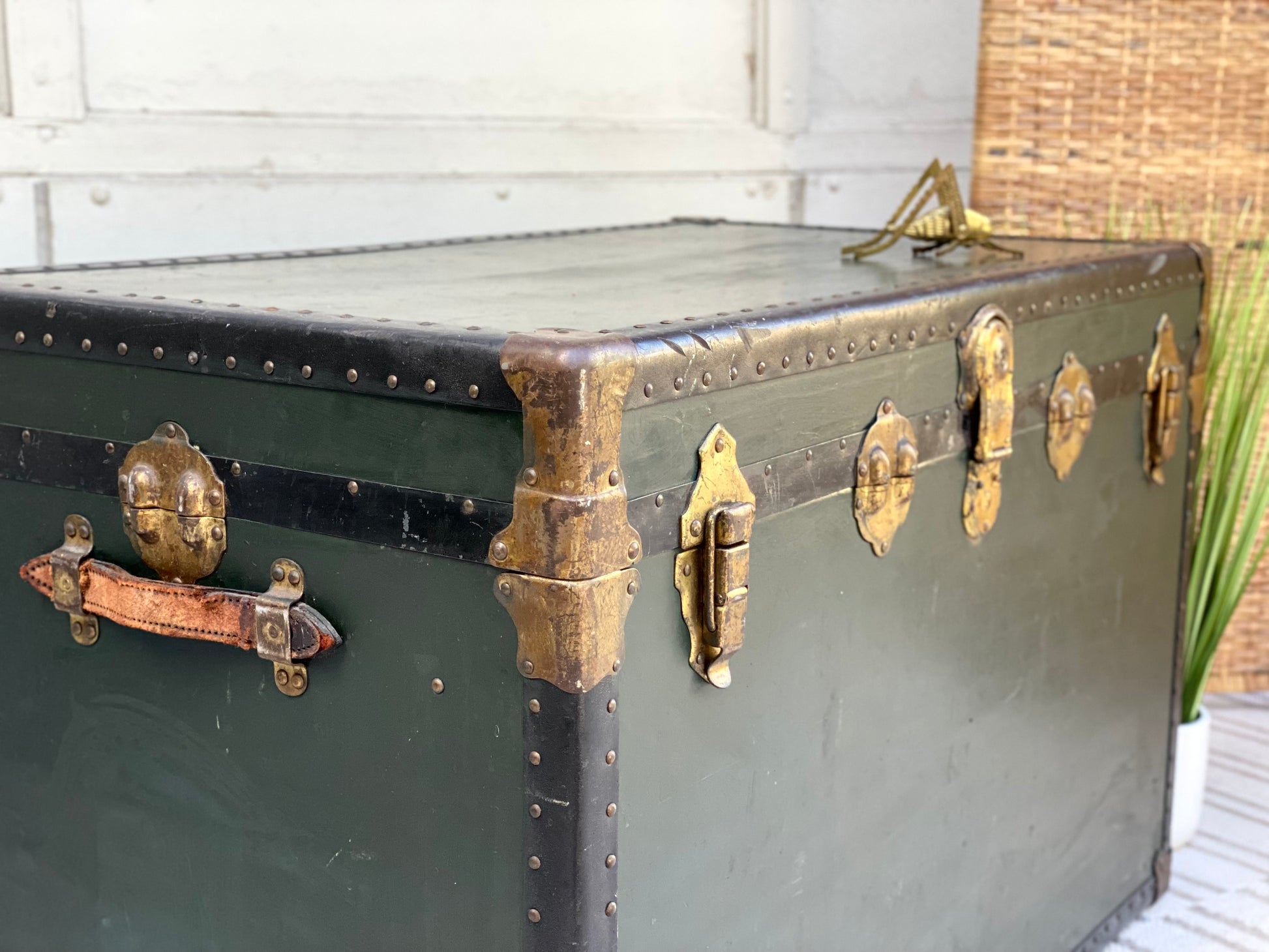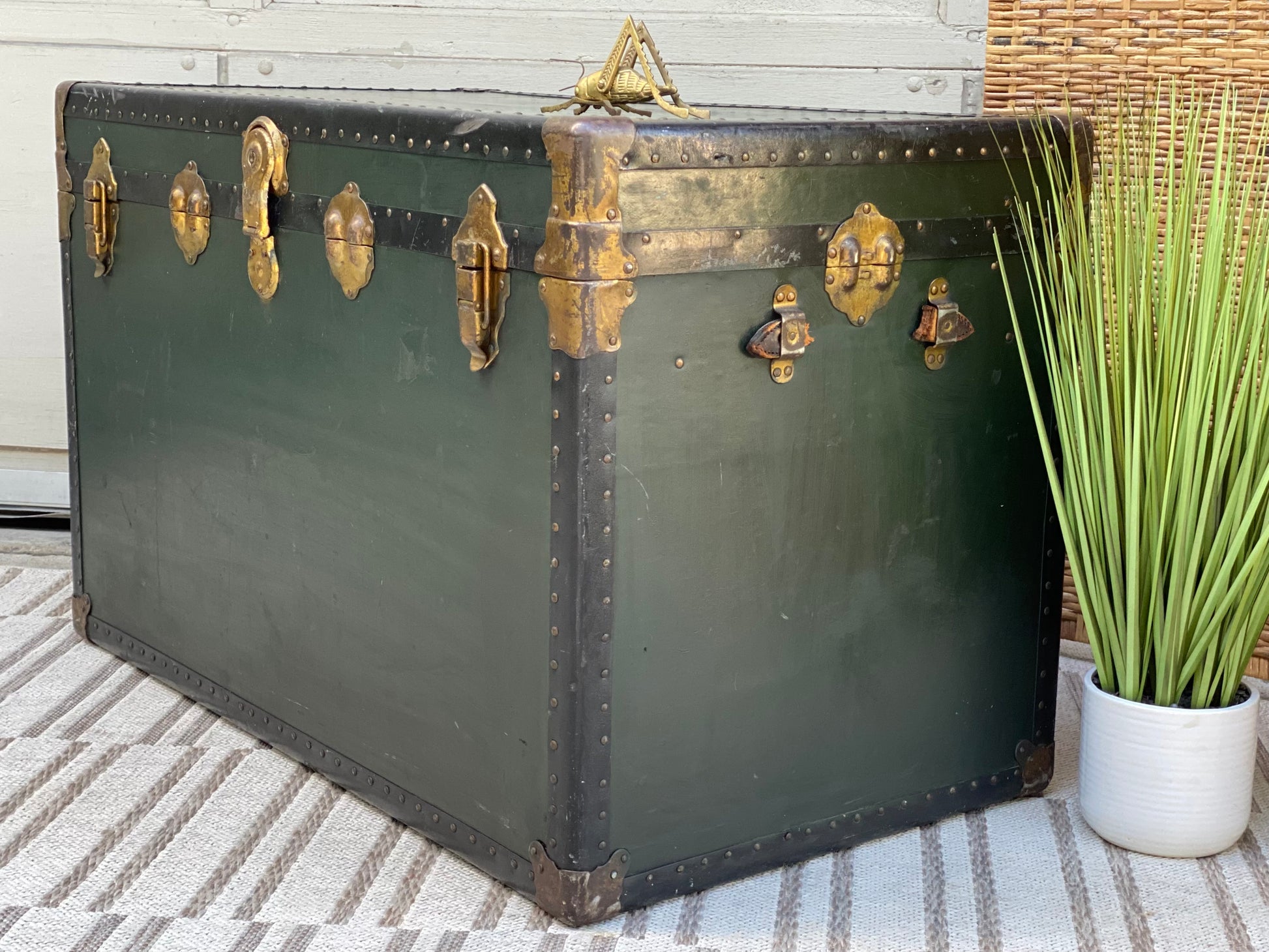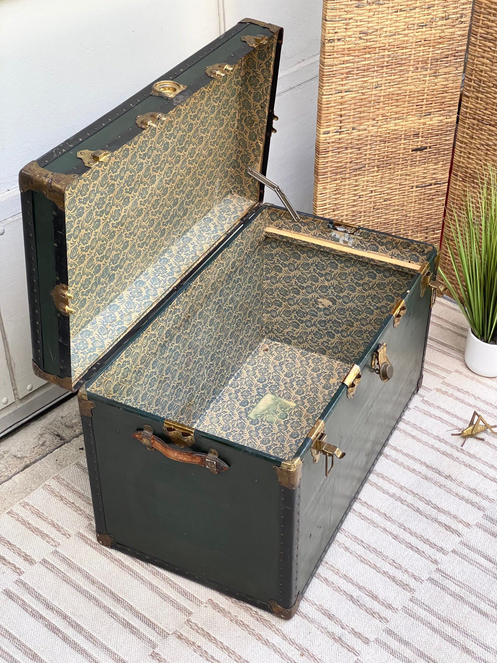 SOLD - What a great piece of decor! Check out this vintage green travel trunk. Lots of storage or would make a great coffee or side table. 24”h x 38” x 21” Good condition