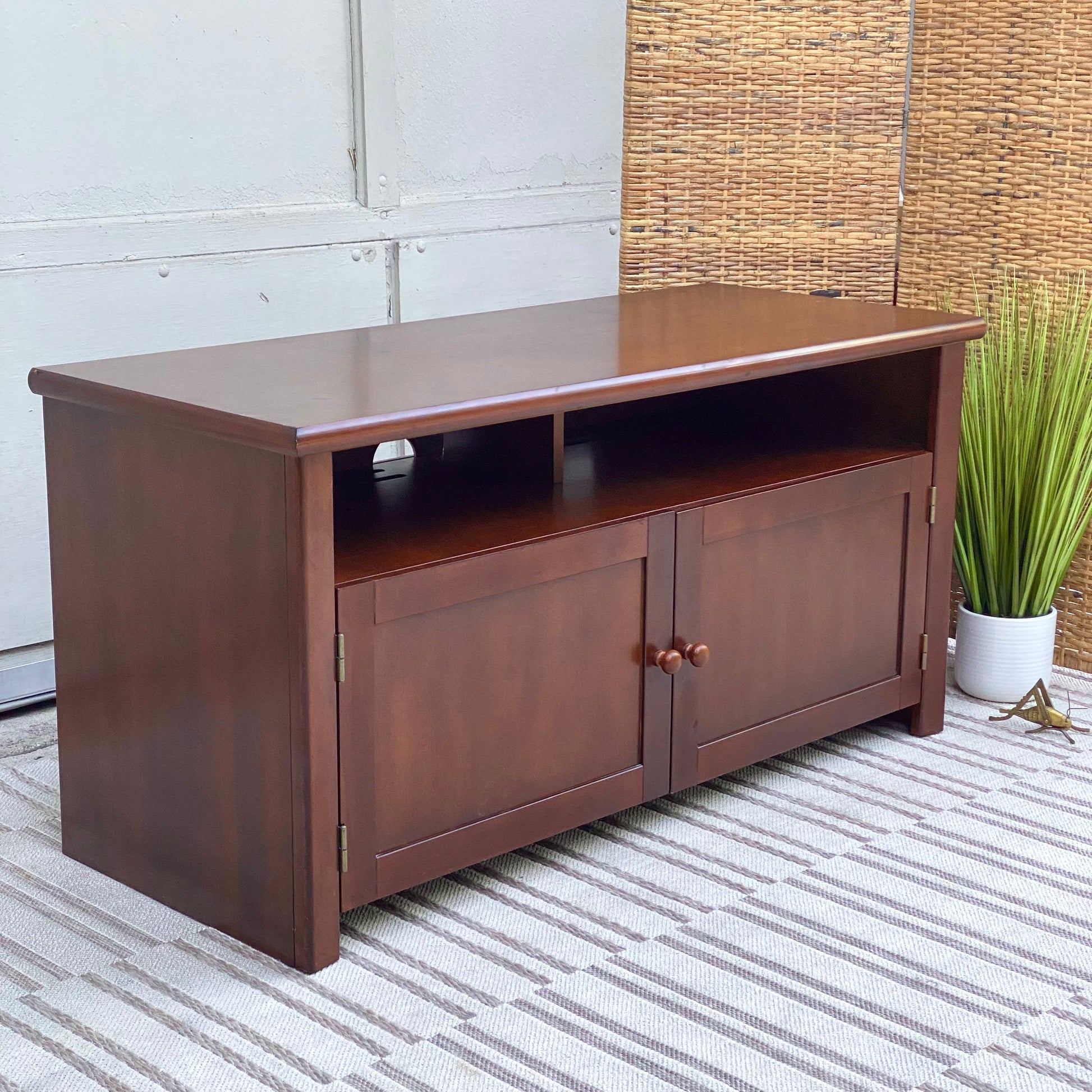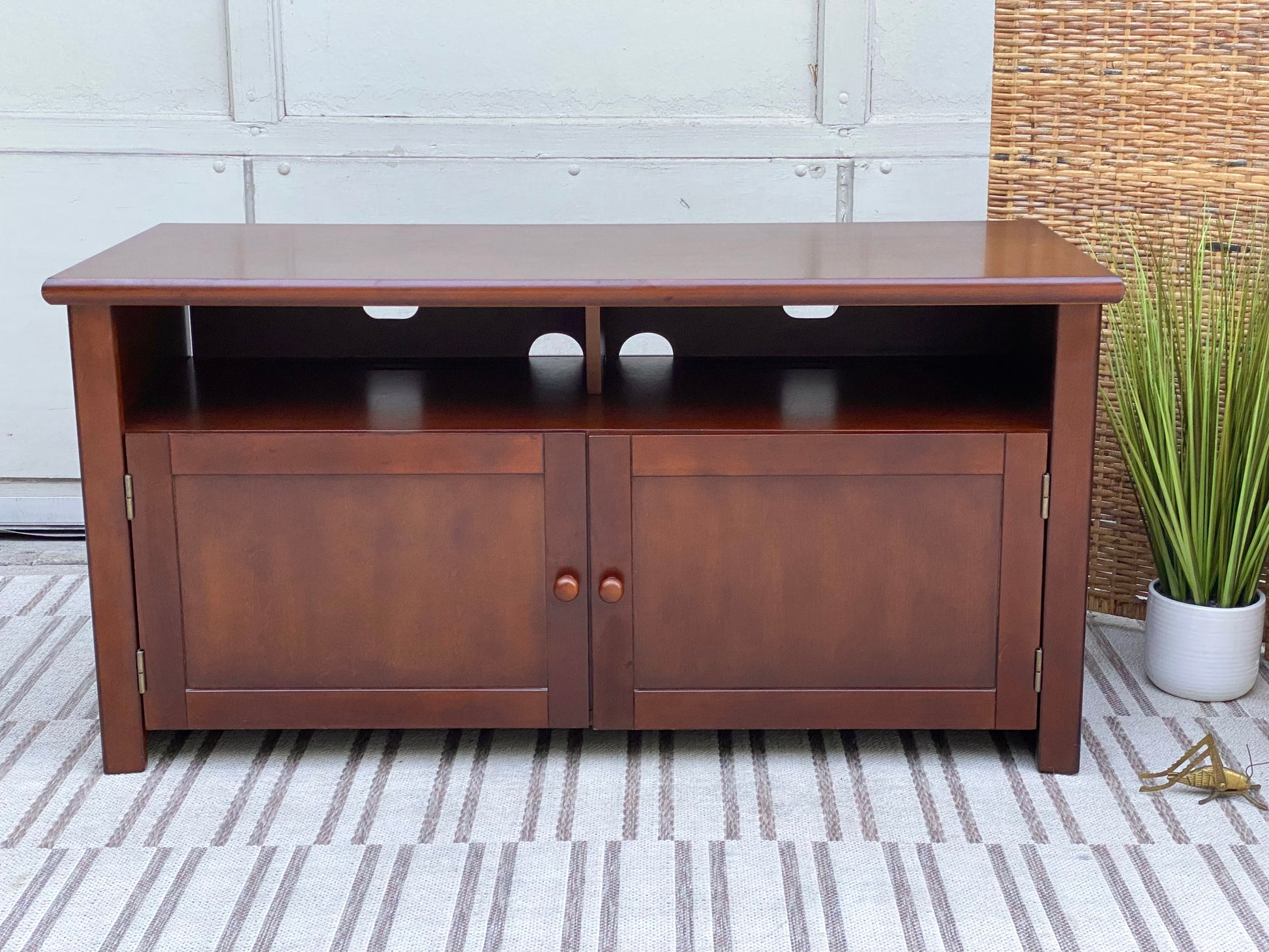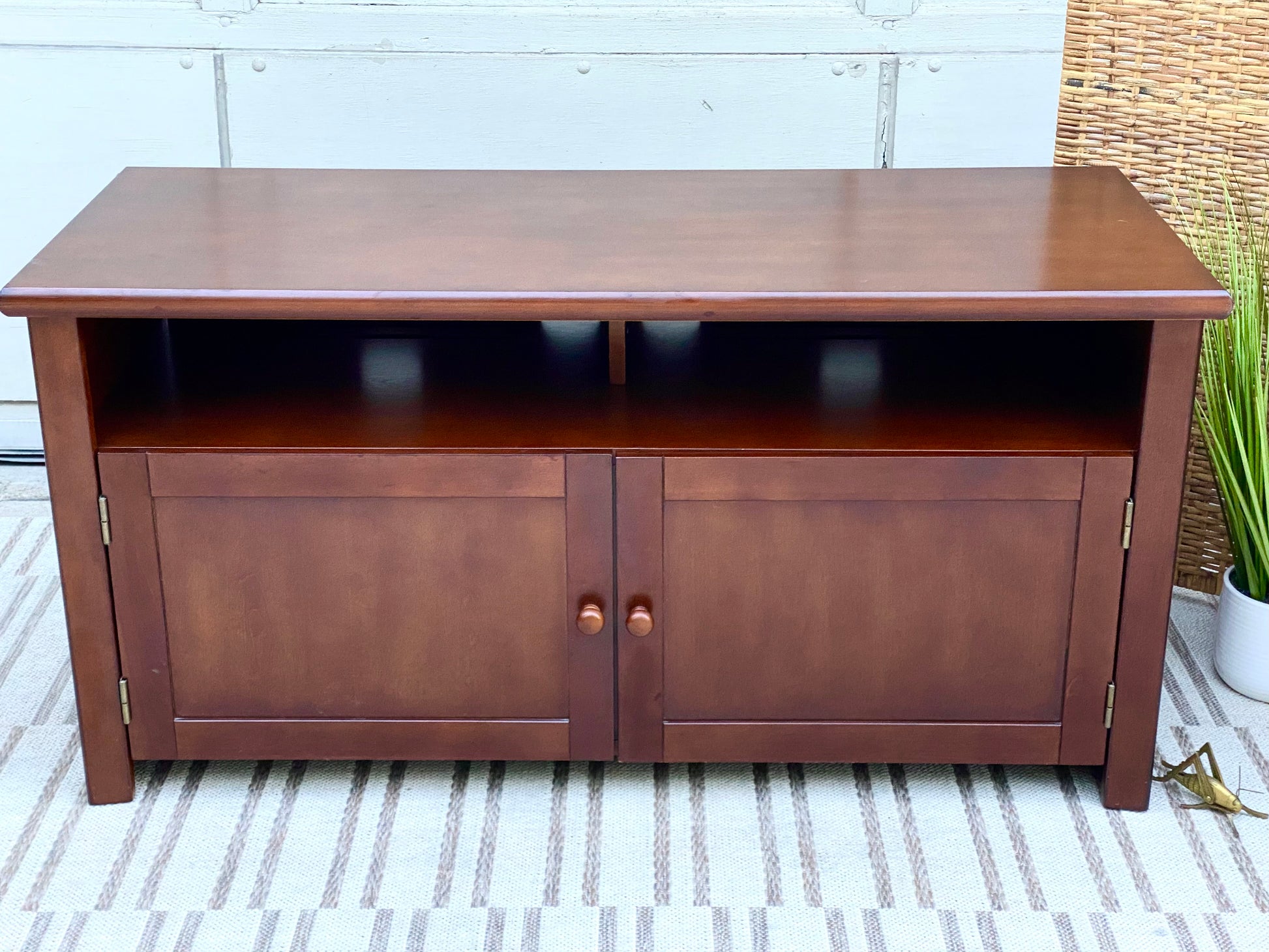SOLD -New arrival! Beautiful dark stained wooden tv stand cabinet. Nice low profile and great underneath storage. 24” x 48” x 20” Good condition