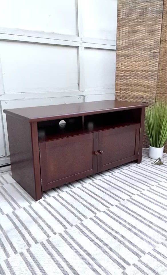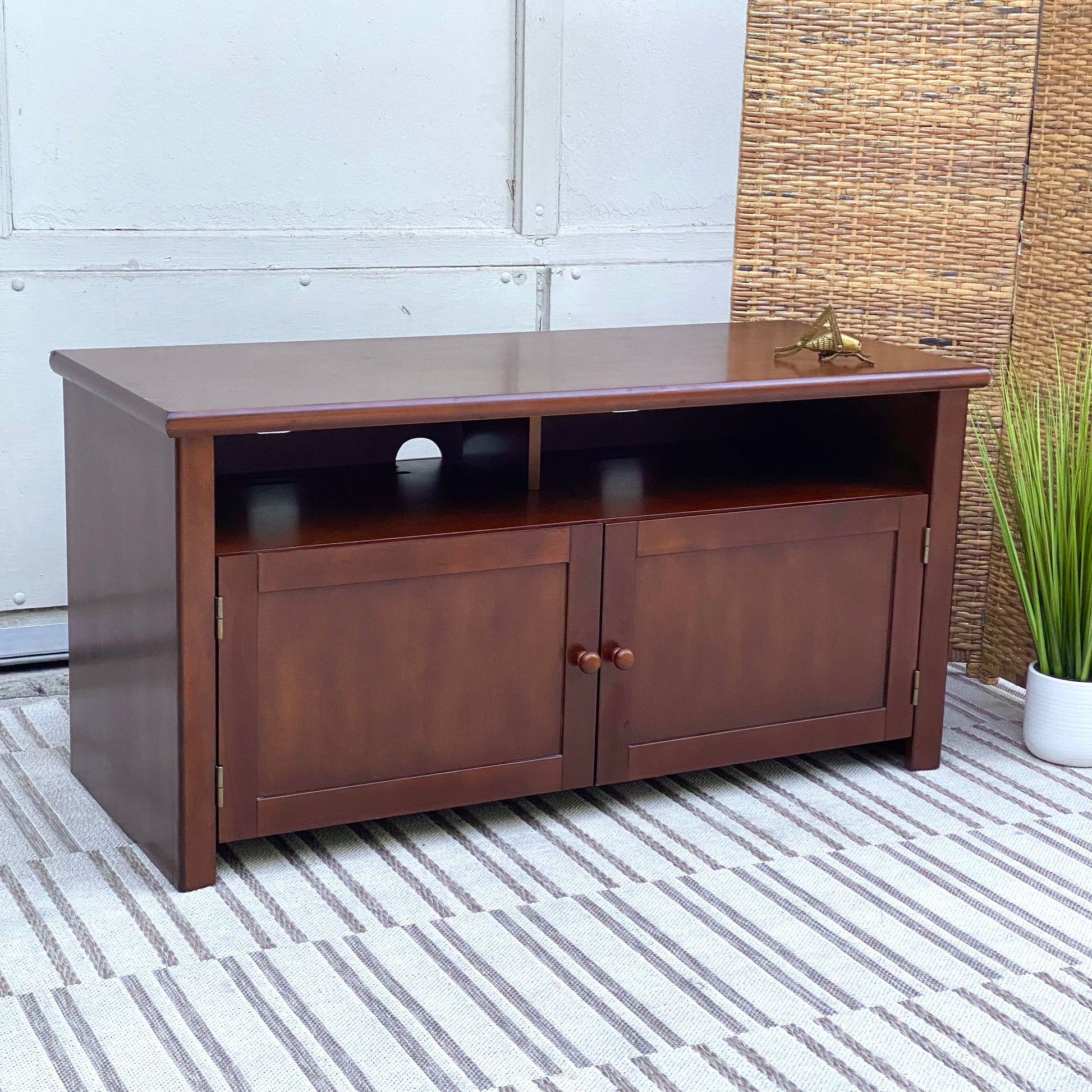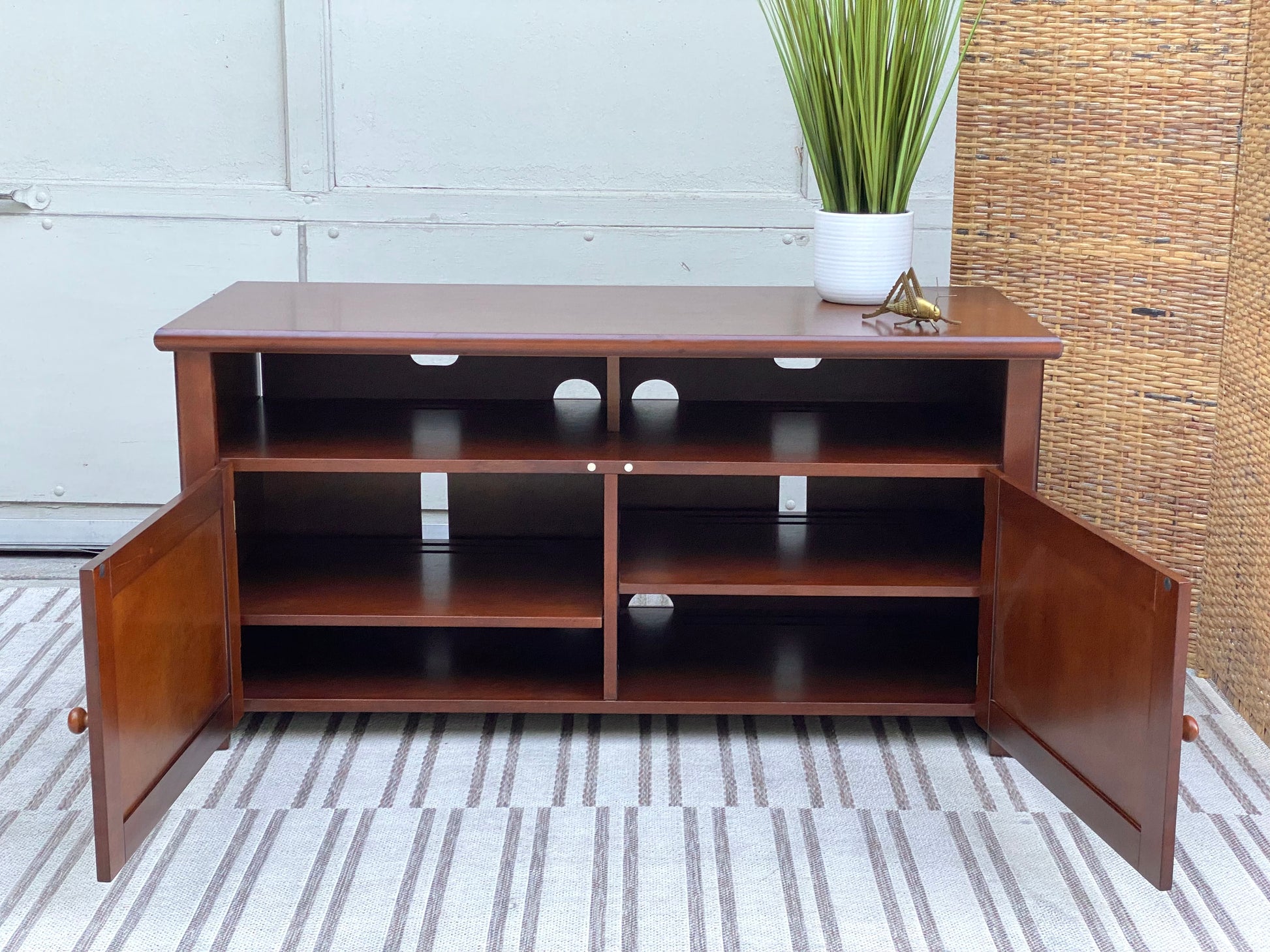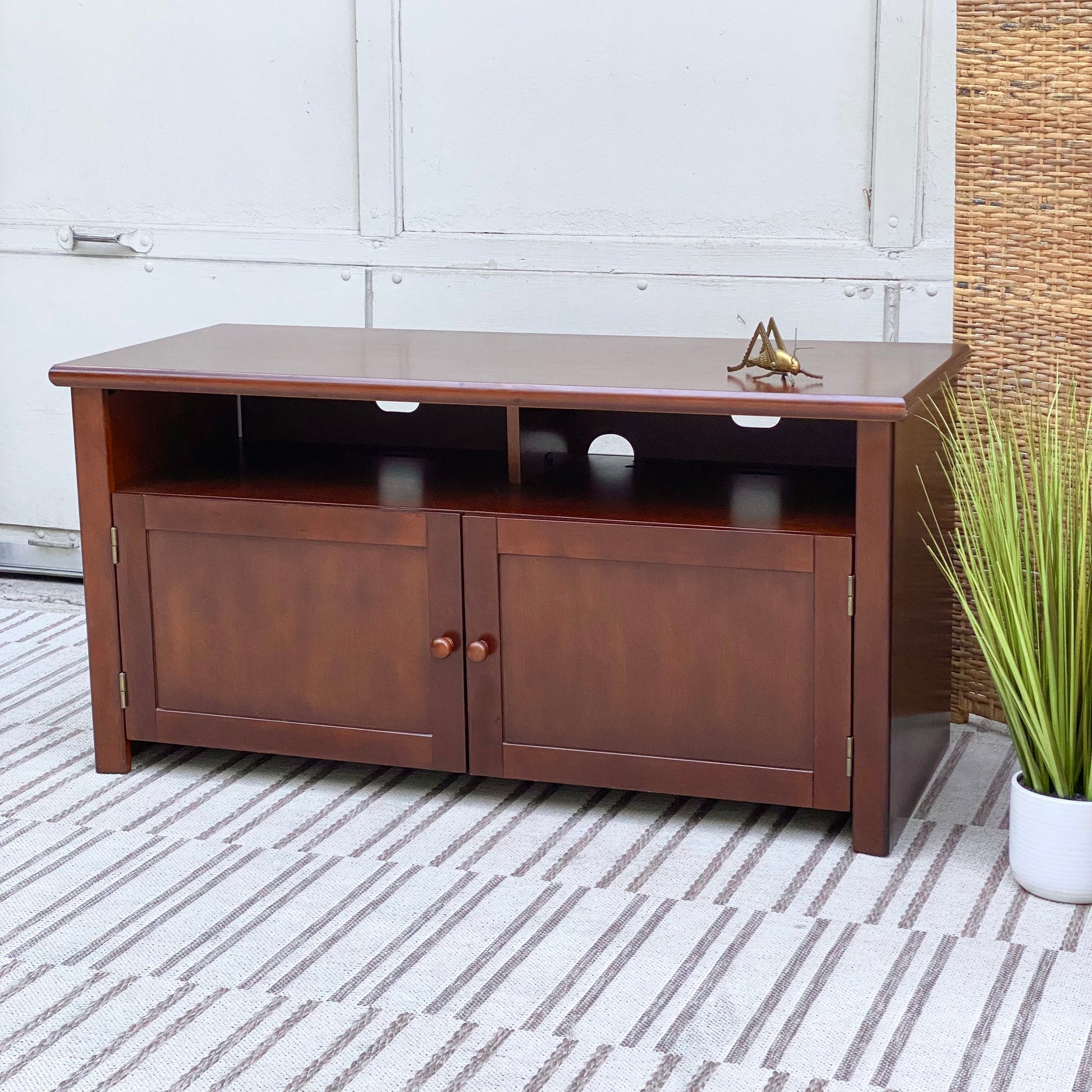 SOLD -New arrival! Beautiful dark stained wooden tv stand cabinet. Nice low profile and great underneath storage. 24” x 48” x 20” Good condition