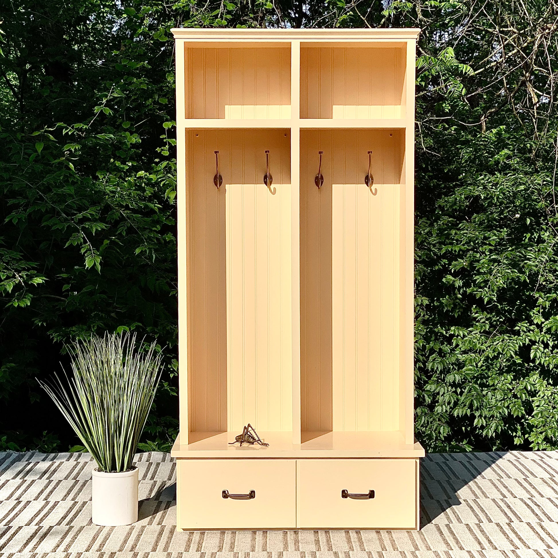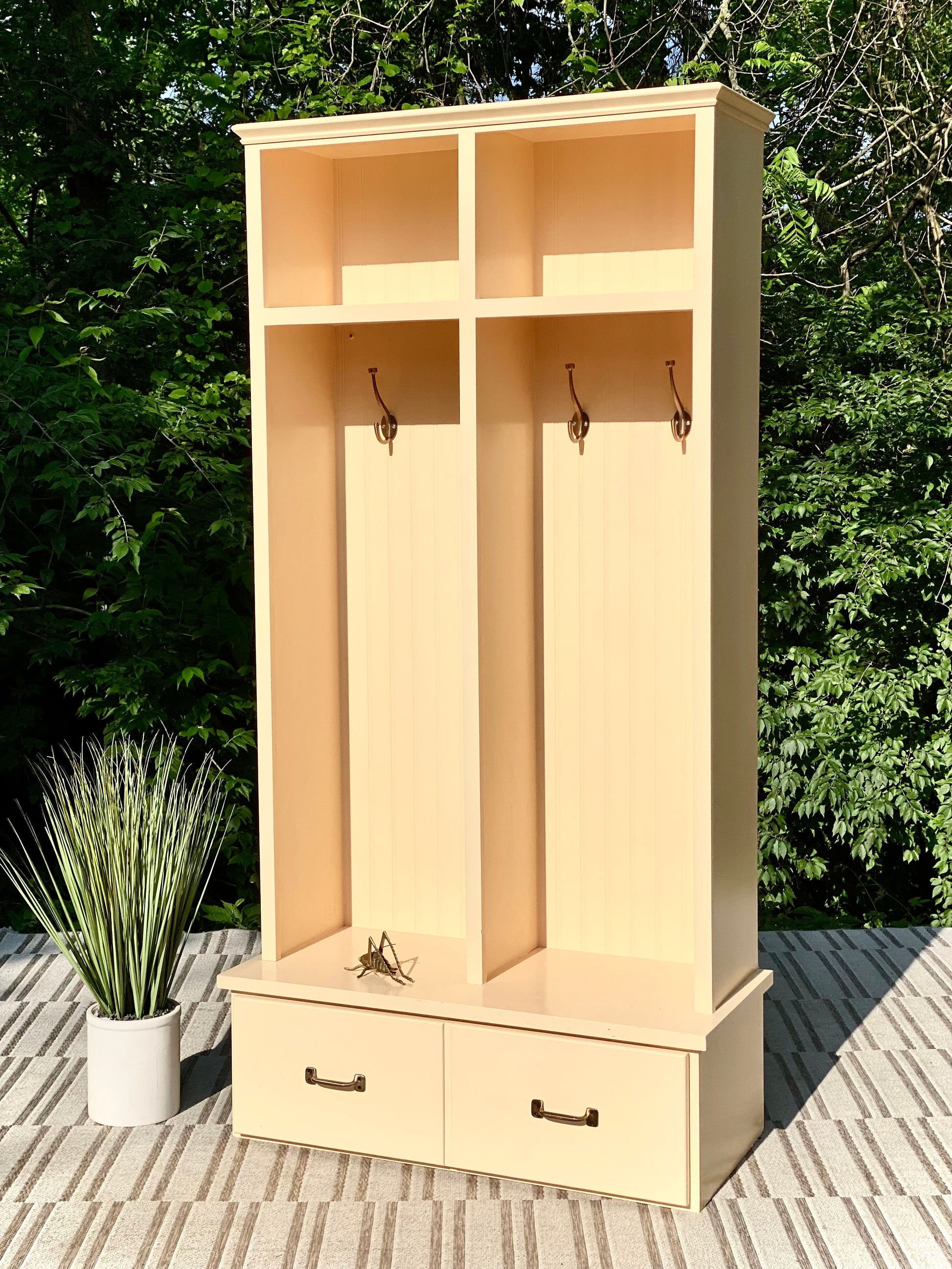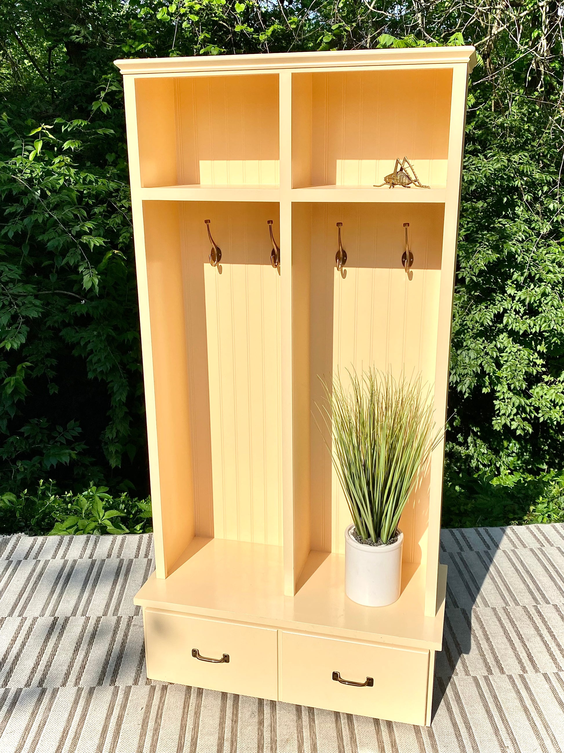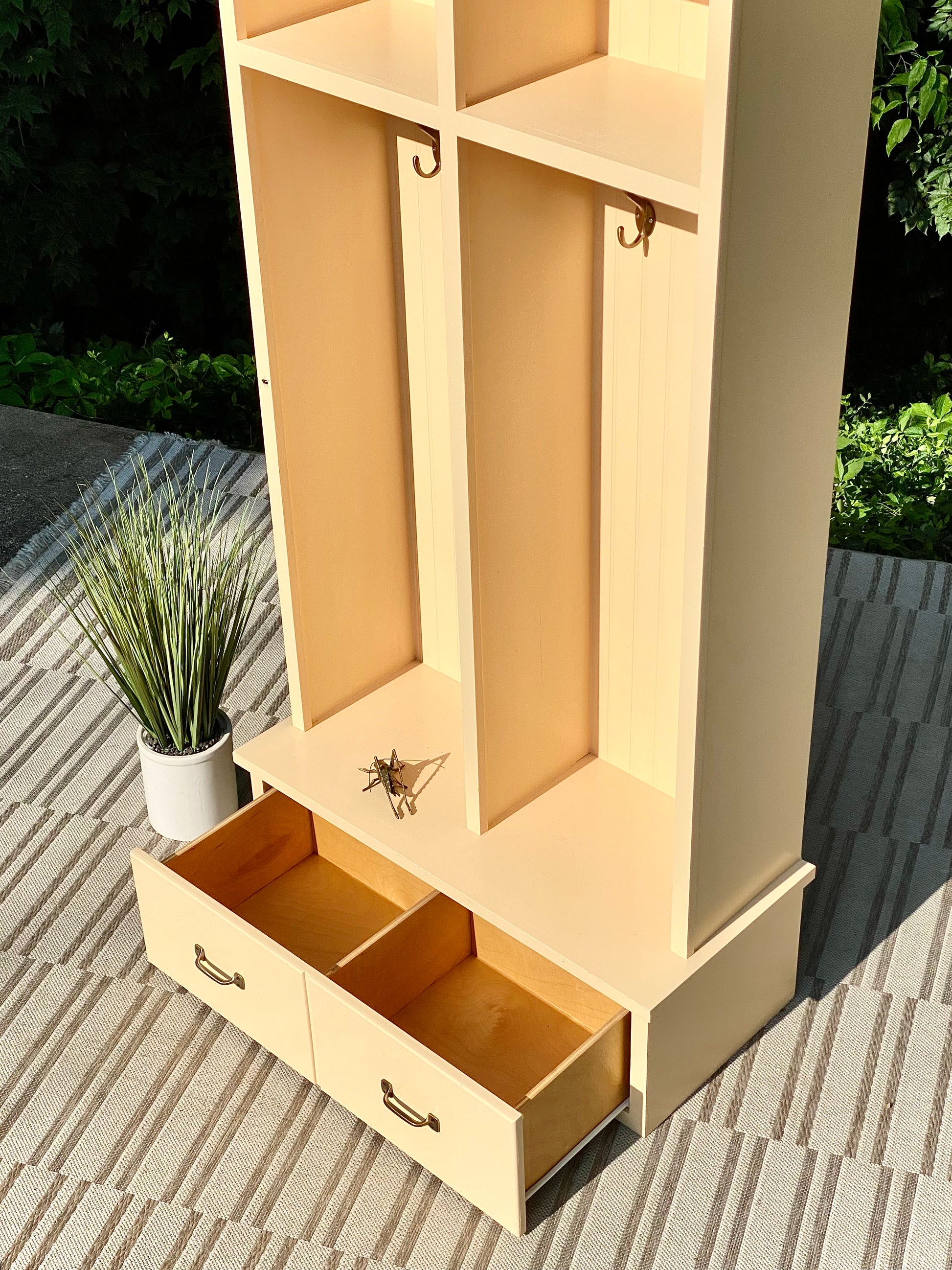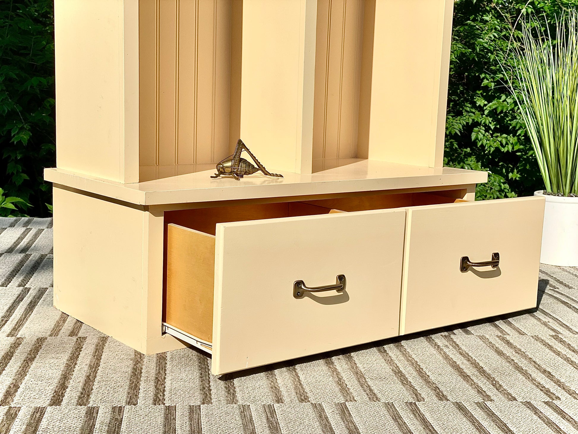 SOLD - New arrival! 🪴🌱 We love this unique wooden double hallway bench. Upper cubby holes, four coat hooks and lower drawers. Make this the perfect cabinet for all of your outside attire. 73” x 37” x 17” Good condition