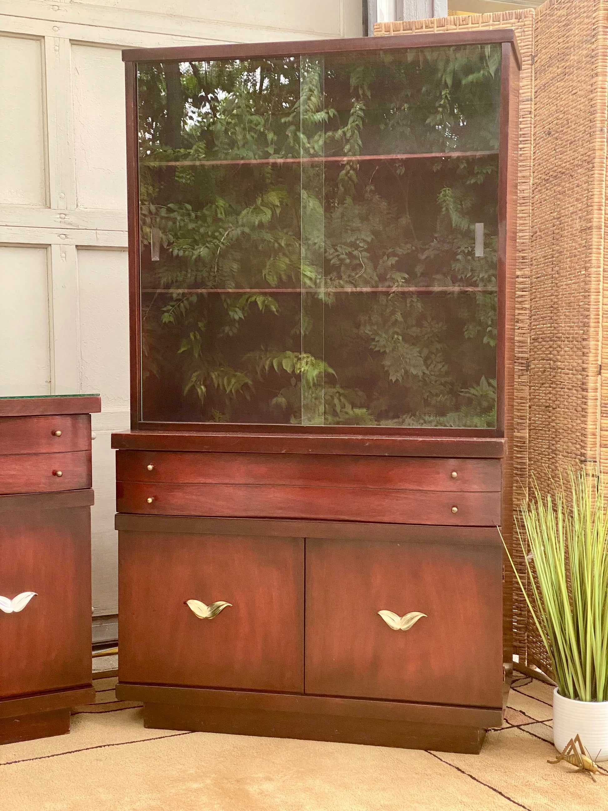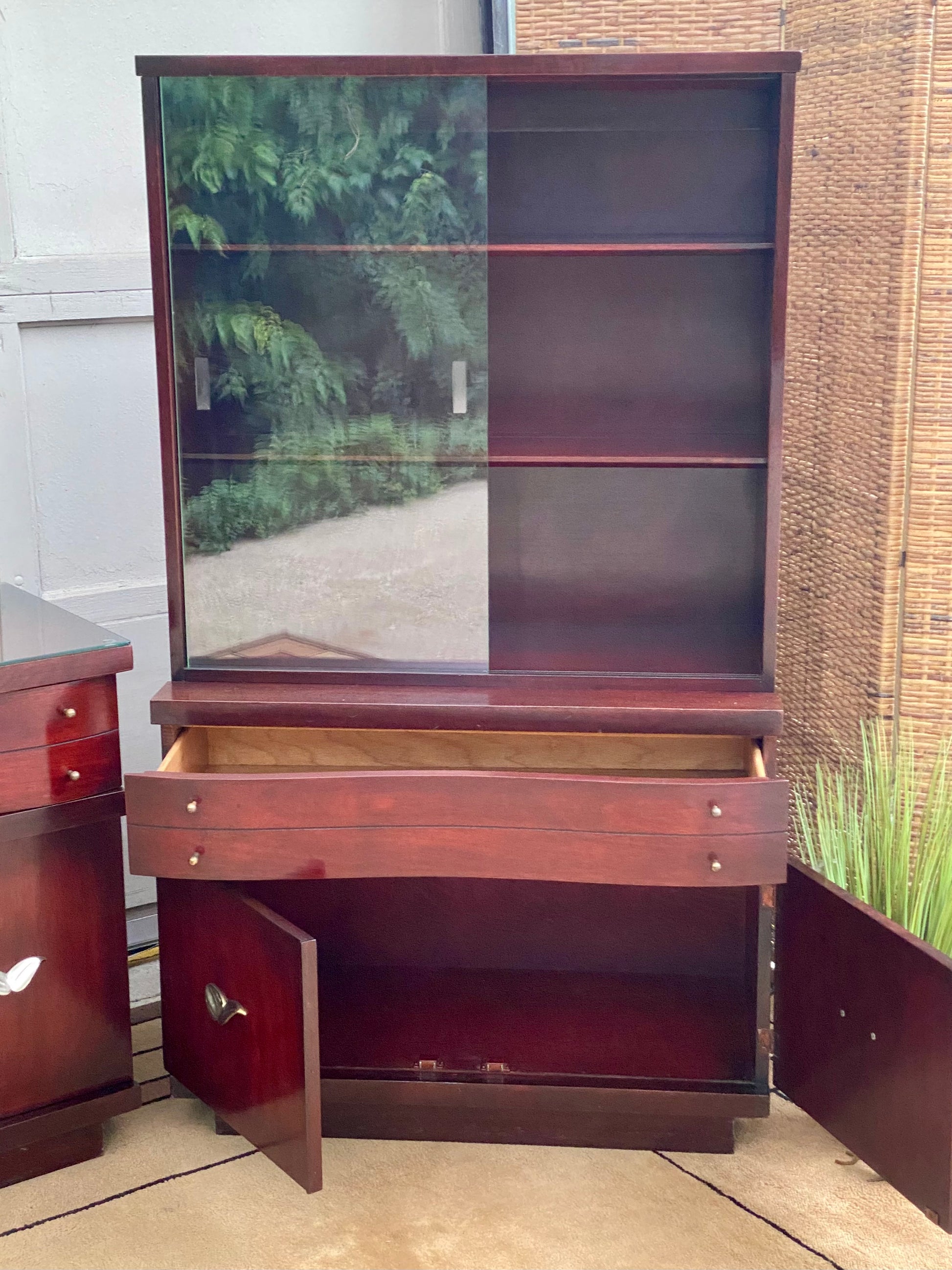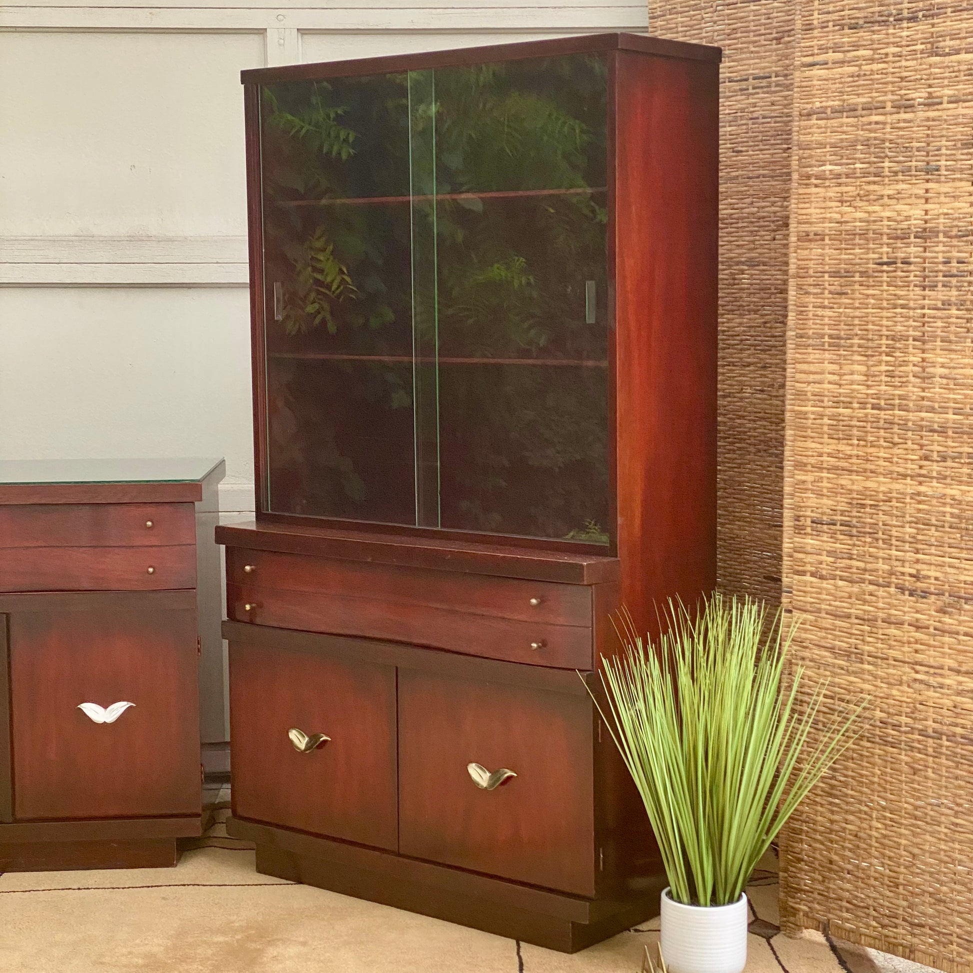 SOLD - Check out this vintage MCM mid century modern glass front hutch. Nice design with lots of storage and original atomic hardware. 64” x 36” x 18” Good condition.