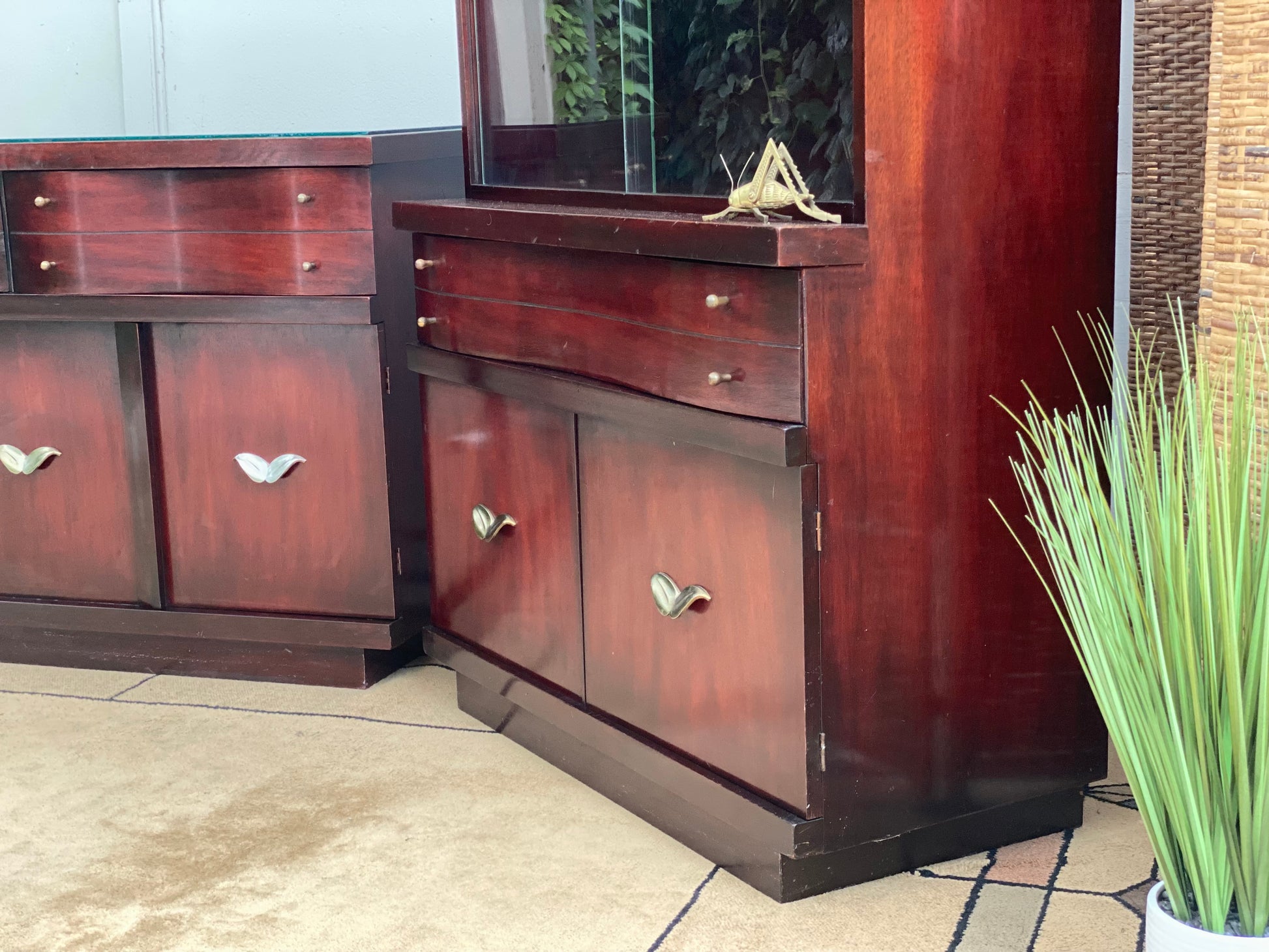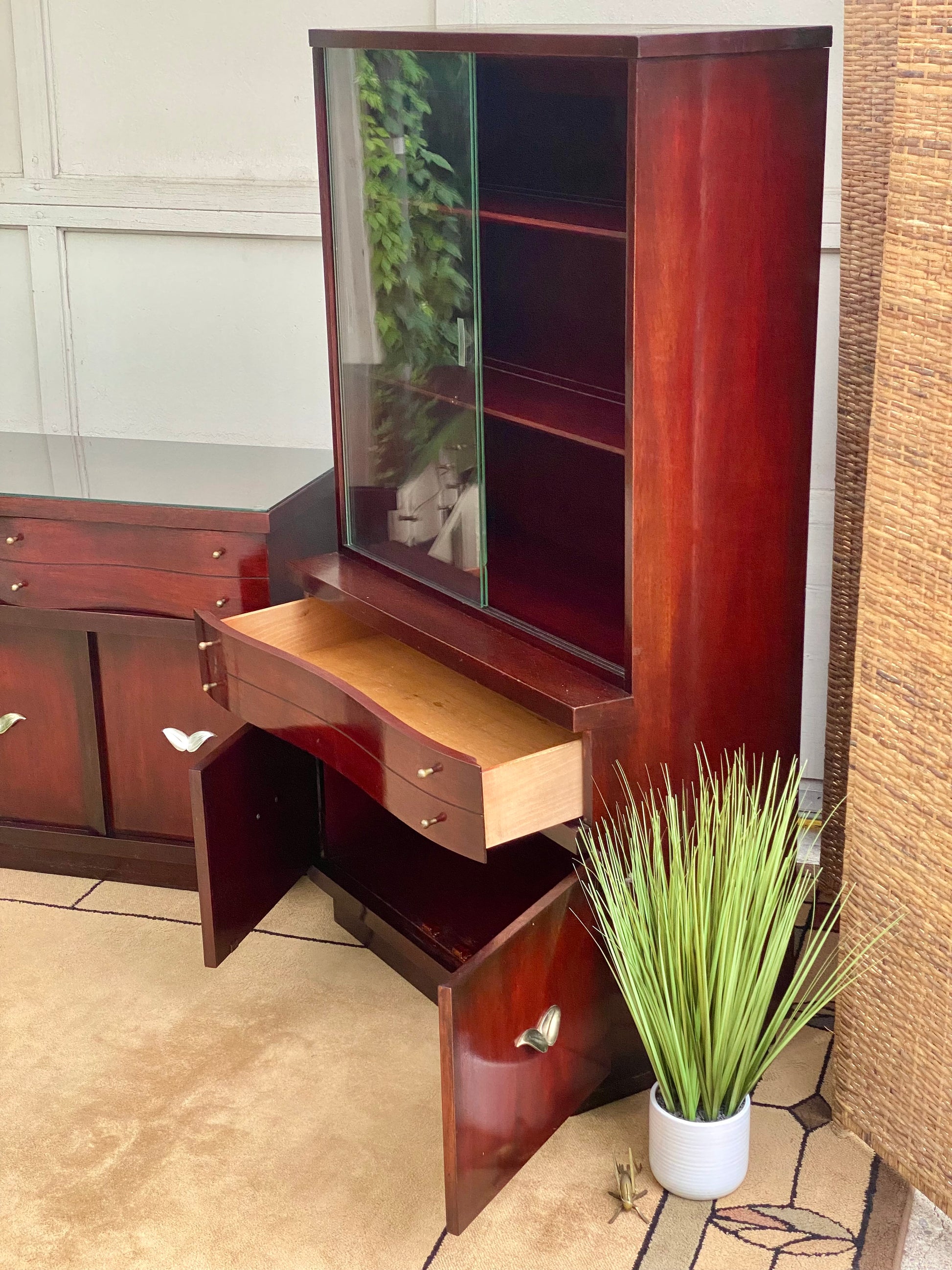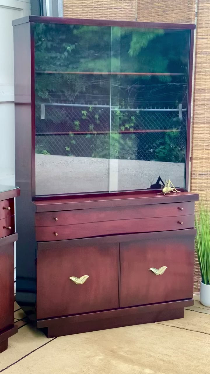 SOLD - Check out this vintage MCM mid century modern glass front hutch. Nice design with lots of storage and original atomic hardware. 64” x 36” x 18” Good condition.