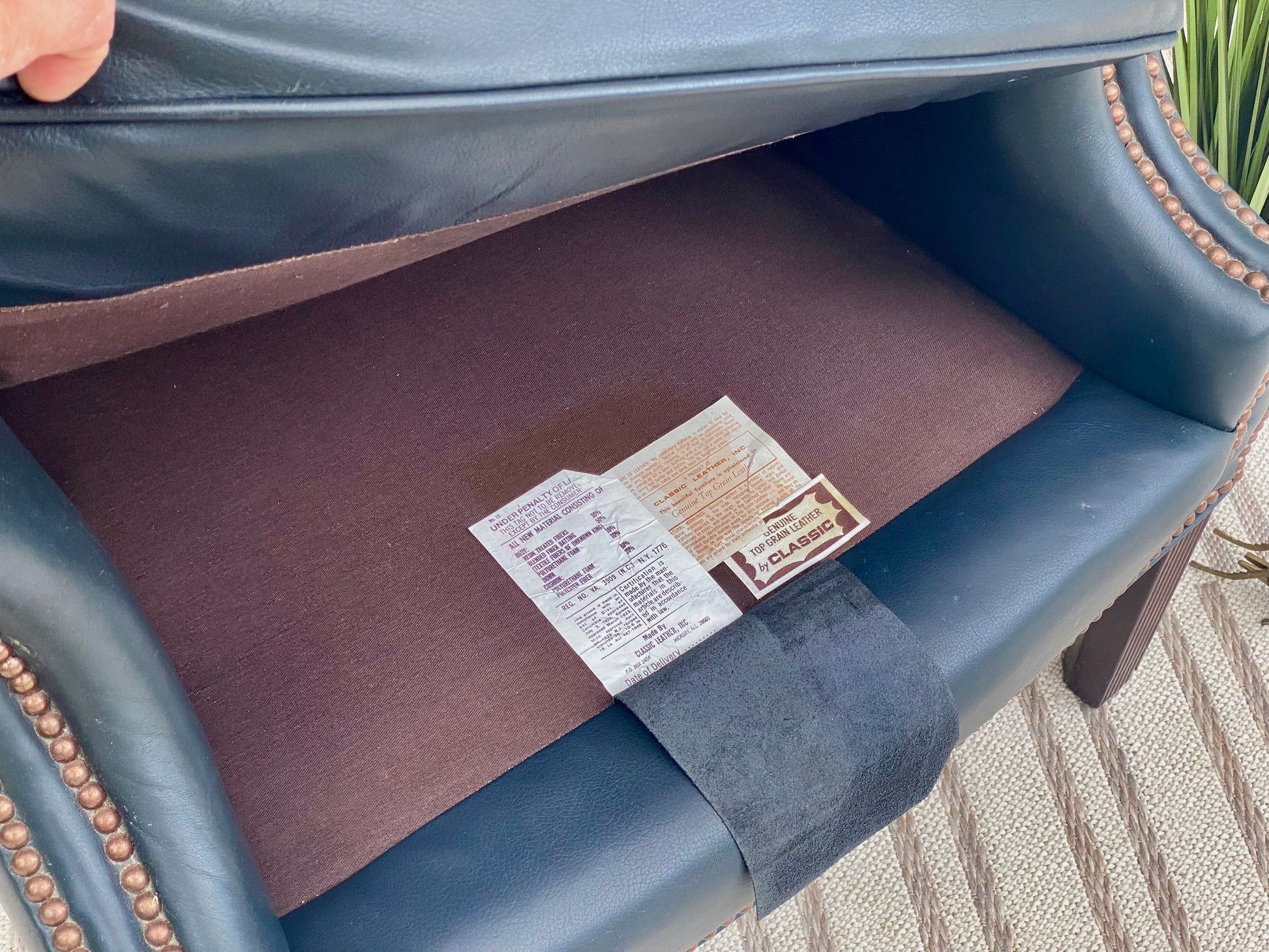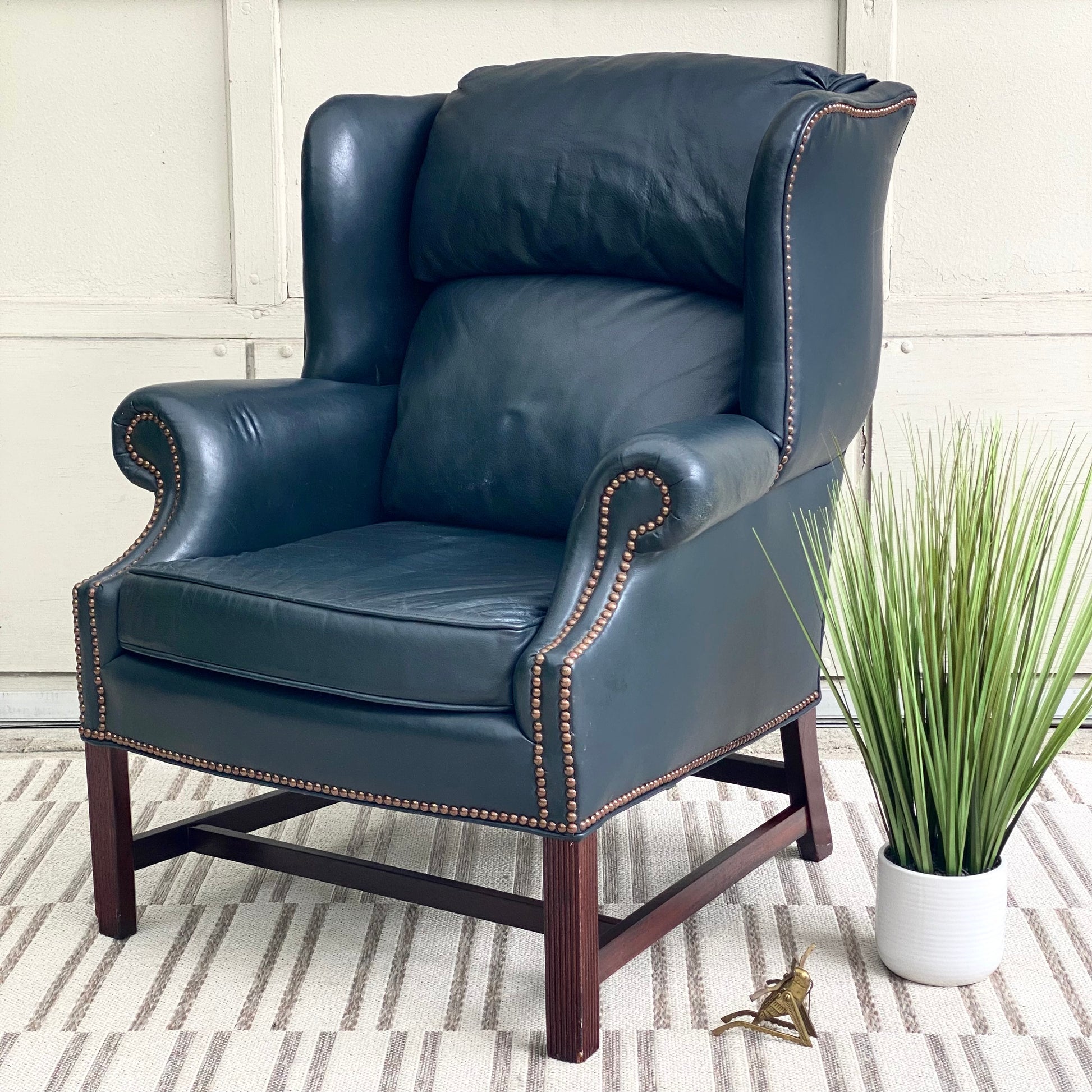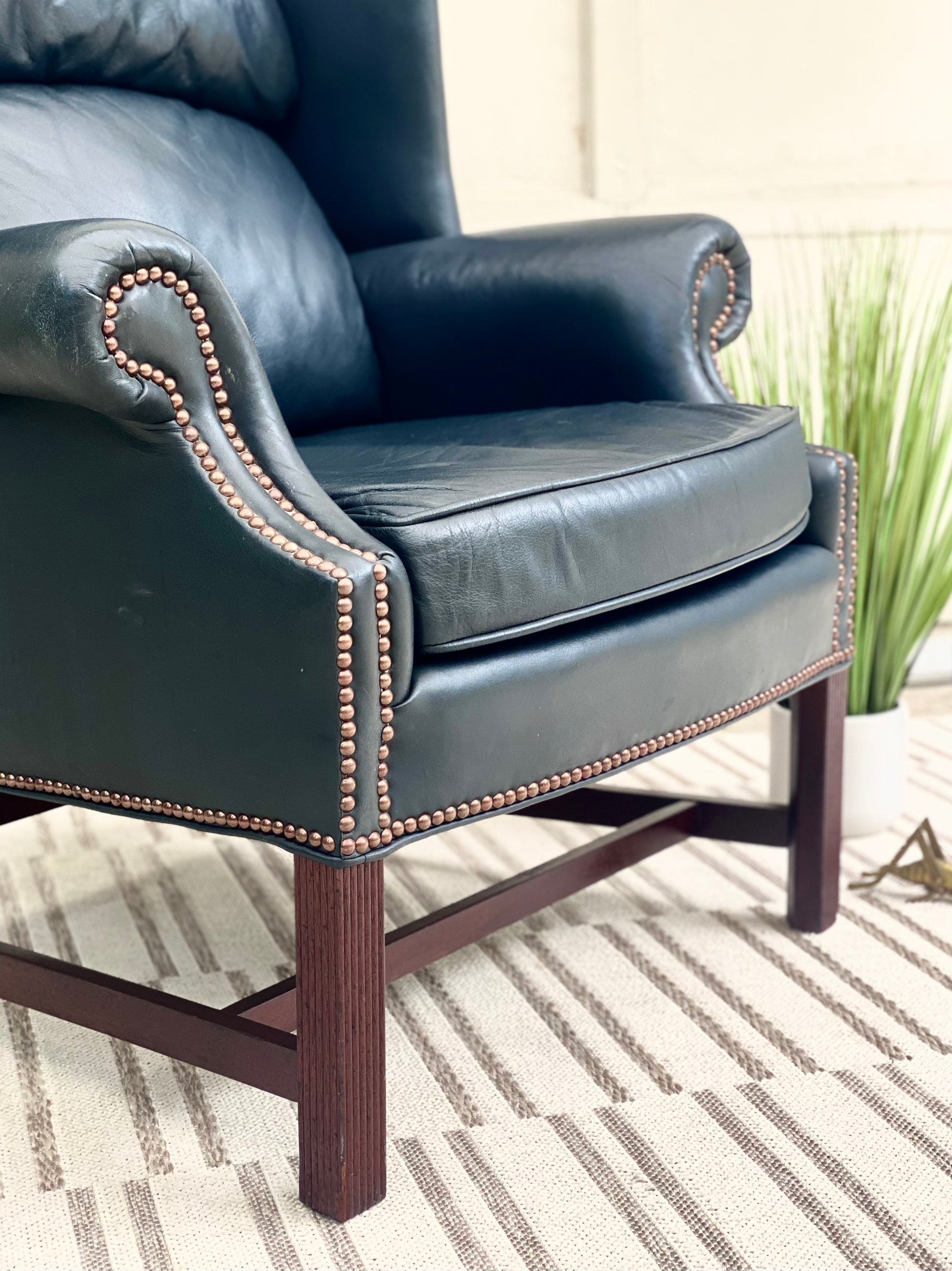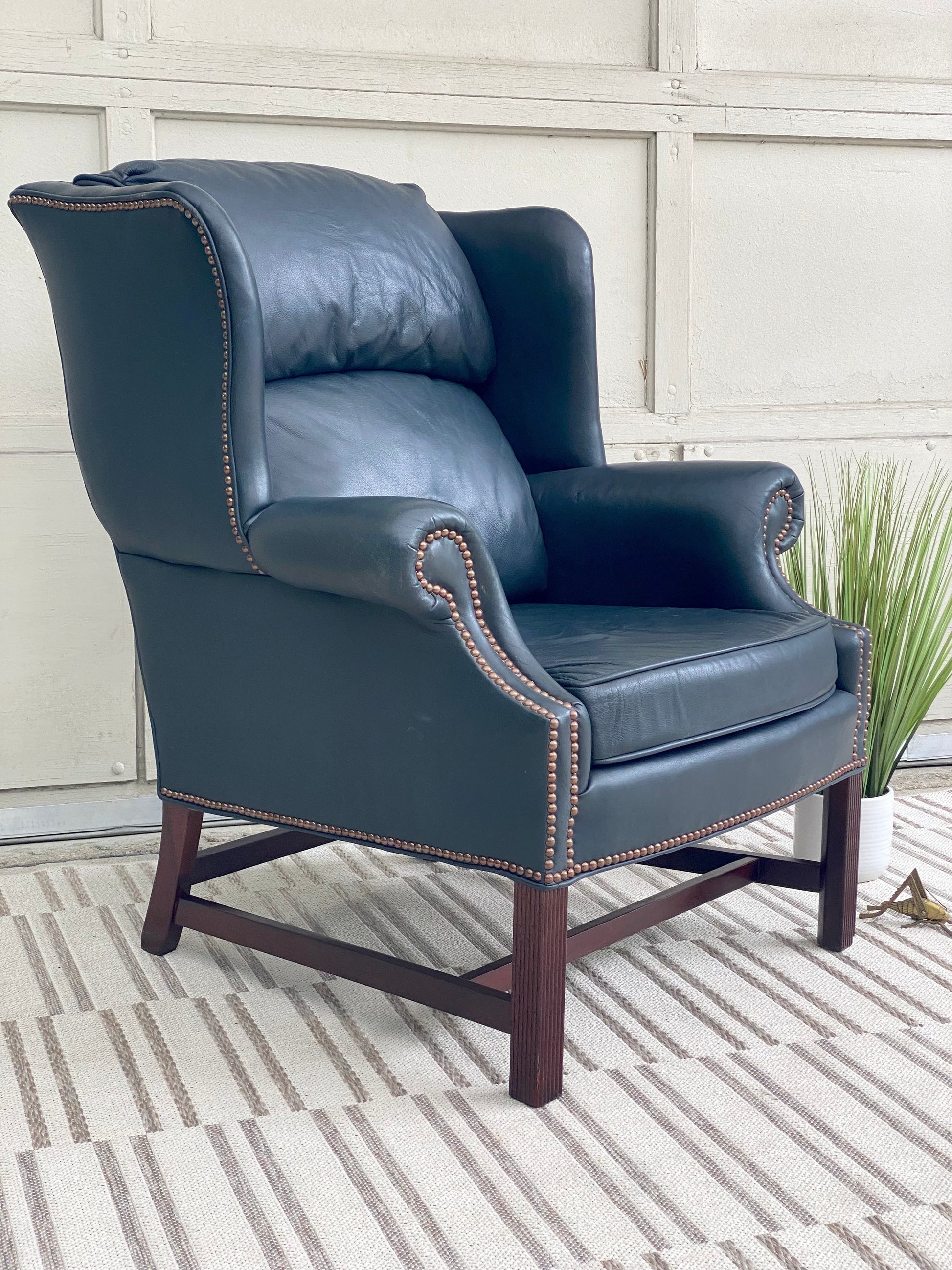 SOLD - New arrival! Check out this comfy blue leather wingback chair. Rivet design with a comfortable feel. 40" x 33" x 33" Good condition