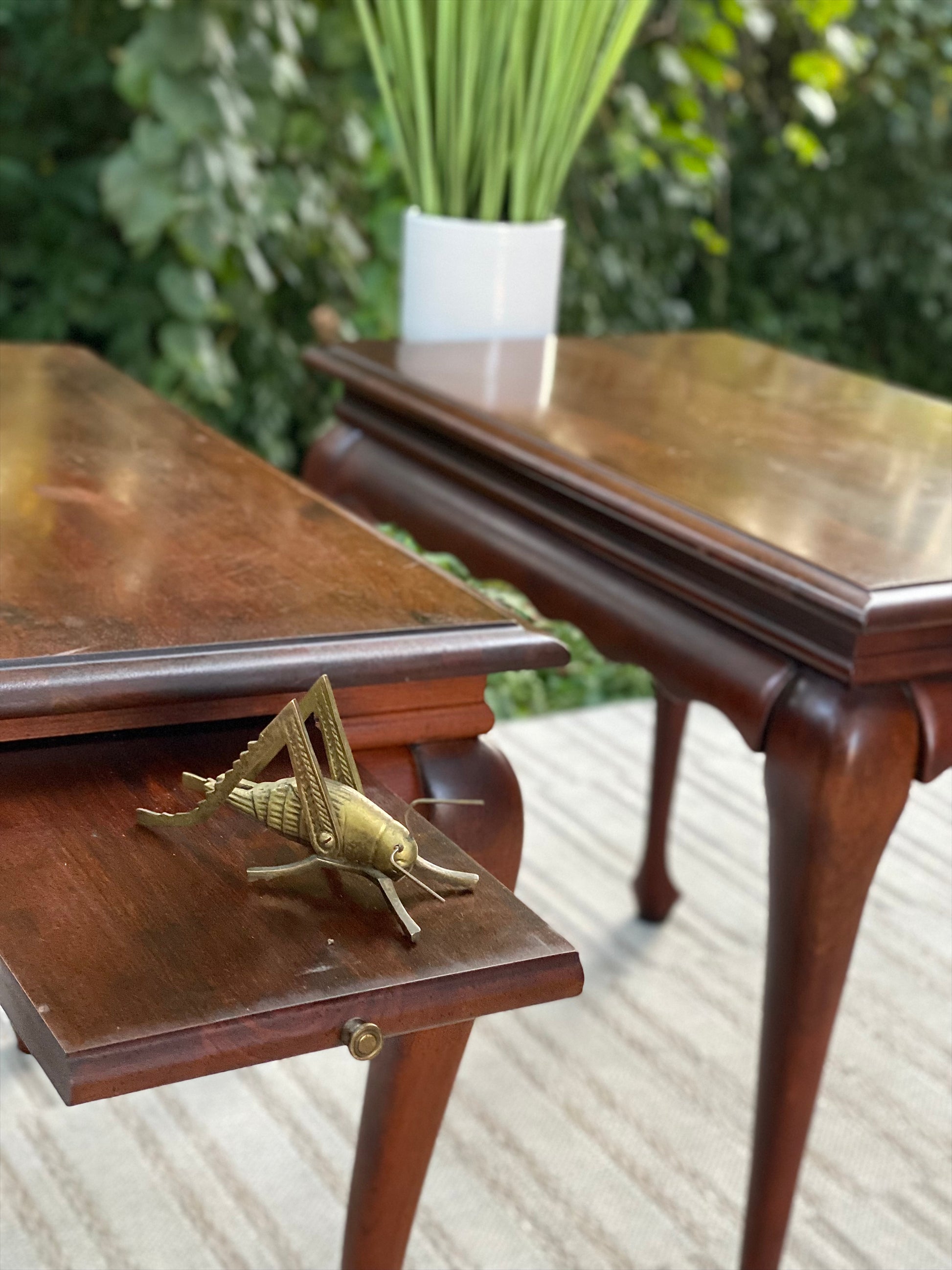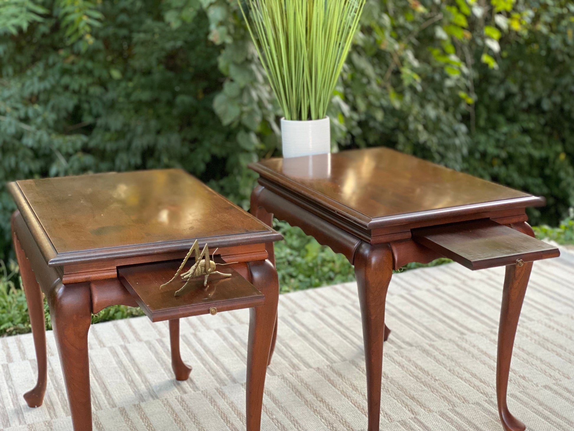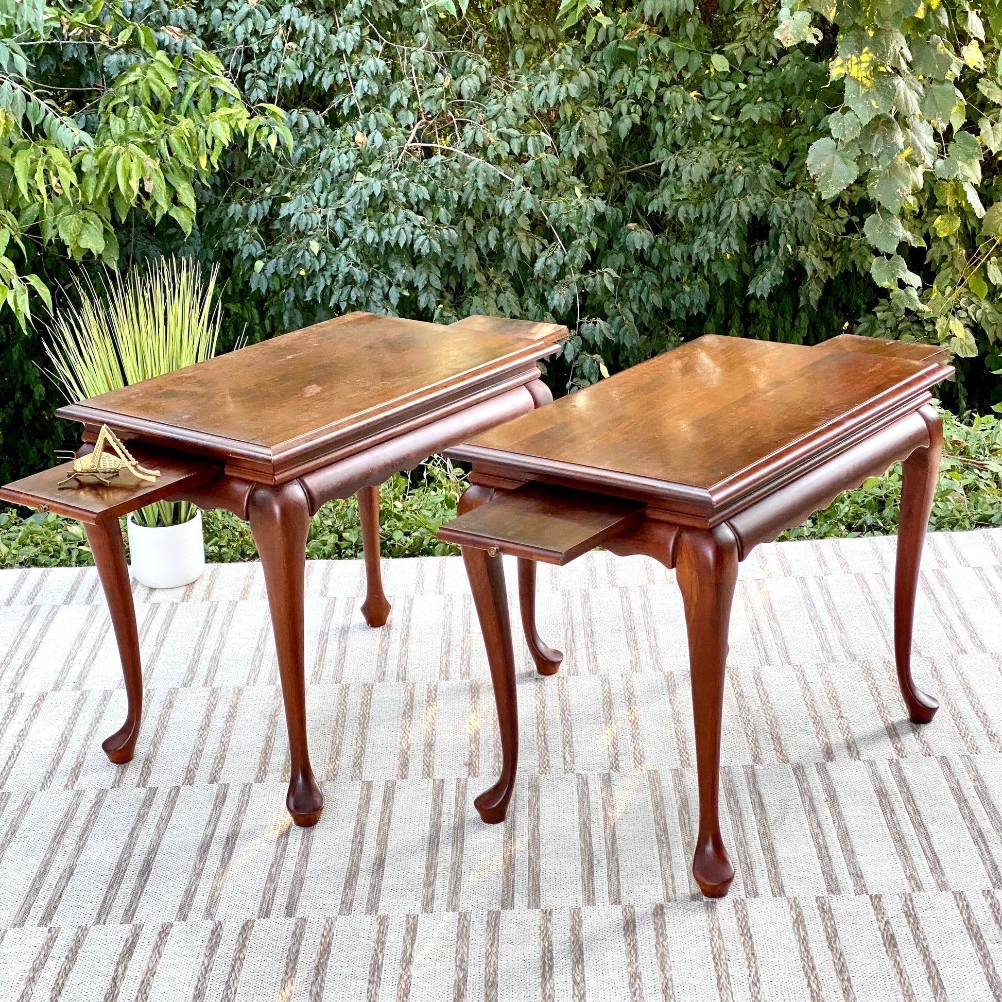 SOLD - New Arrivals! Check out this cute pair of wooden side tables. Each comes with a small pull out tray table. 25" x 18" x 28" Good condition
