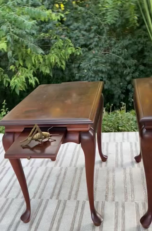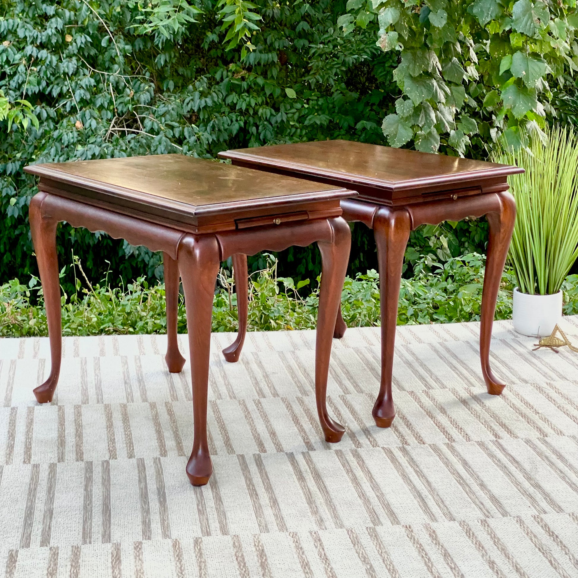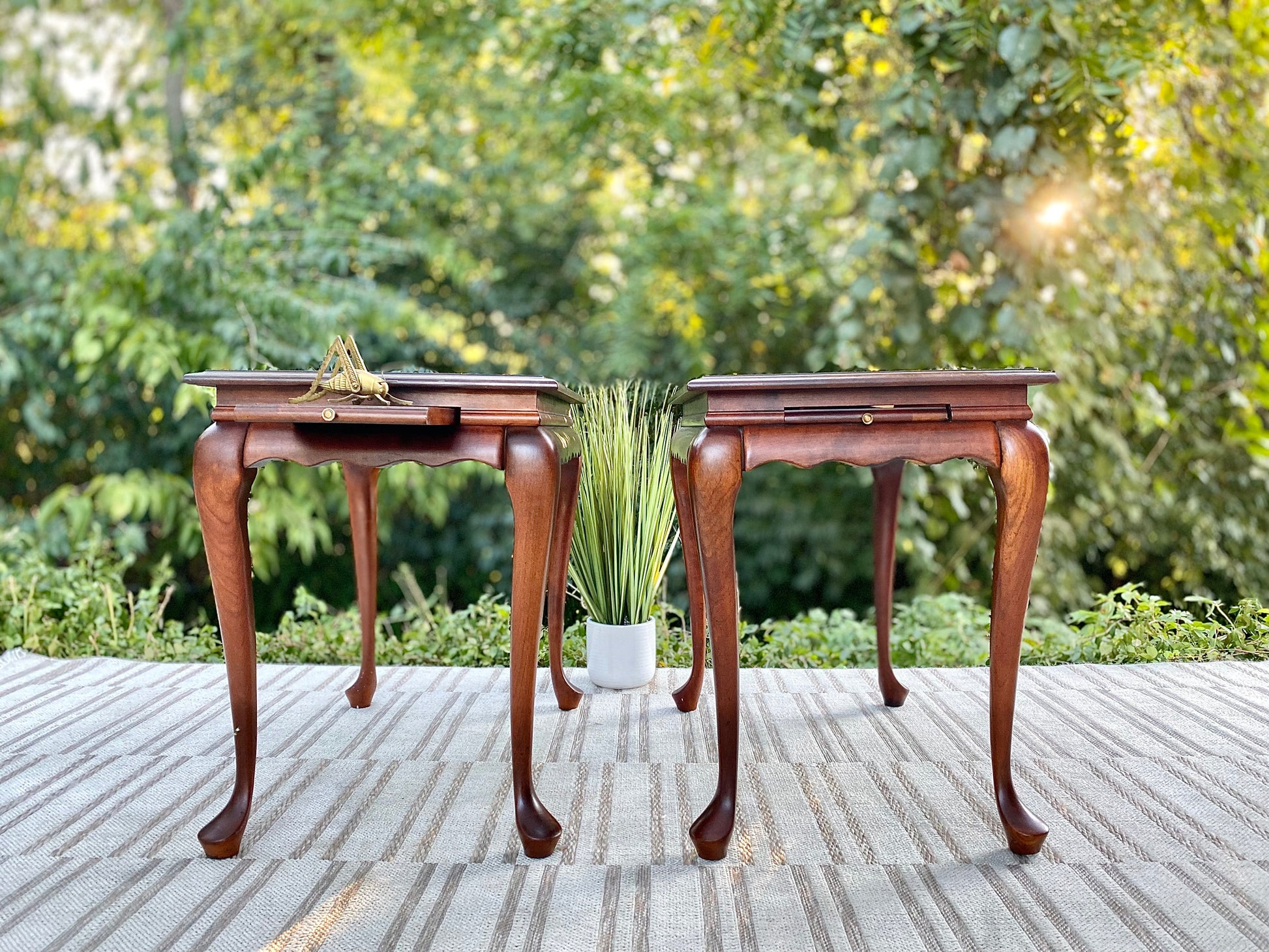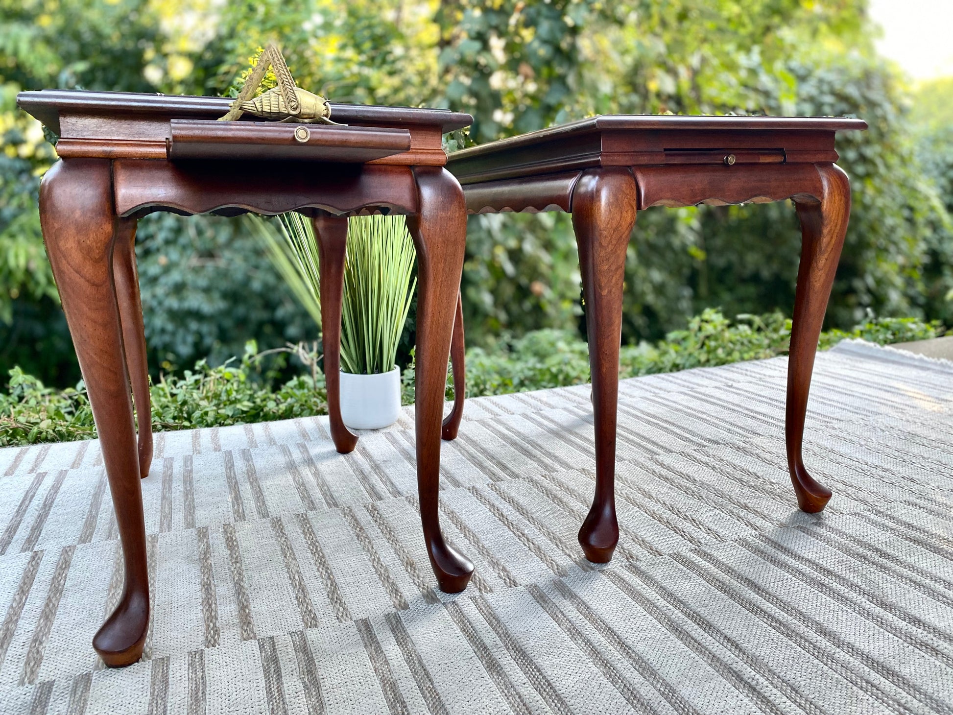 SOLD - New Arrivals! Check out this cute pair of wooden side tables. Each comes with a small pull out tray table. 25" x 18" x 28" Good condition