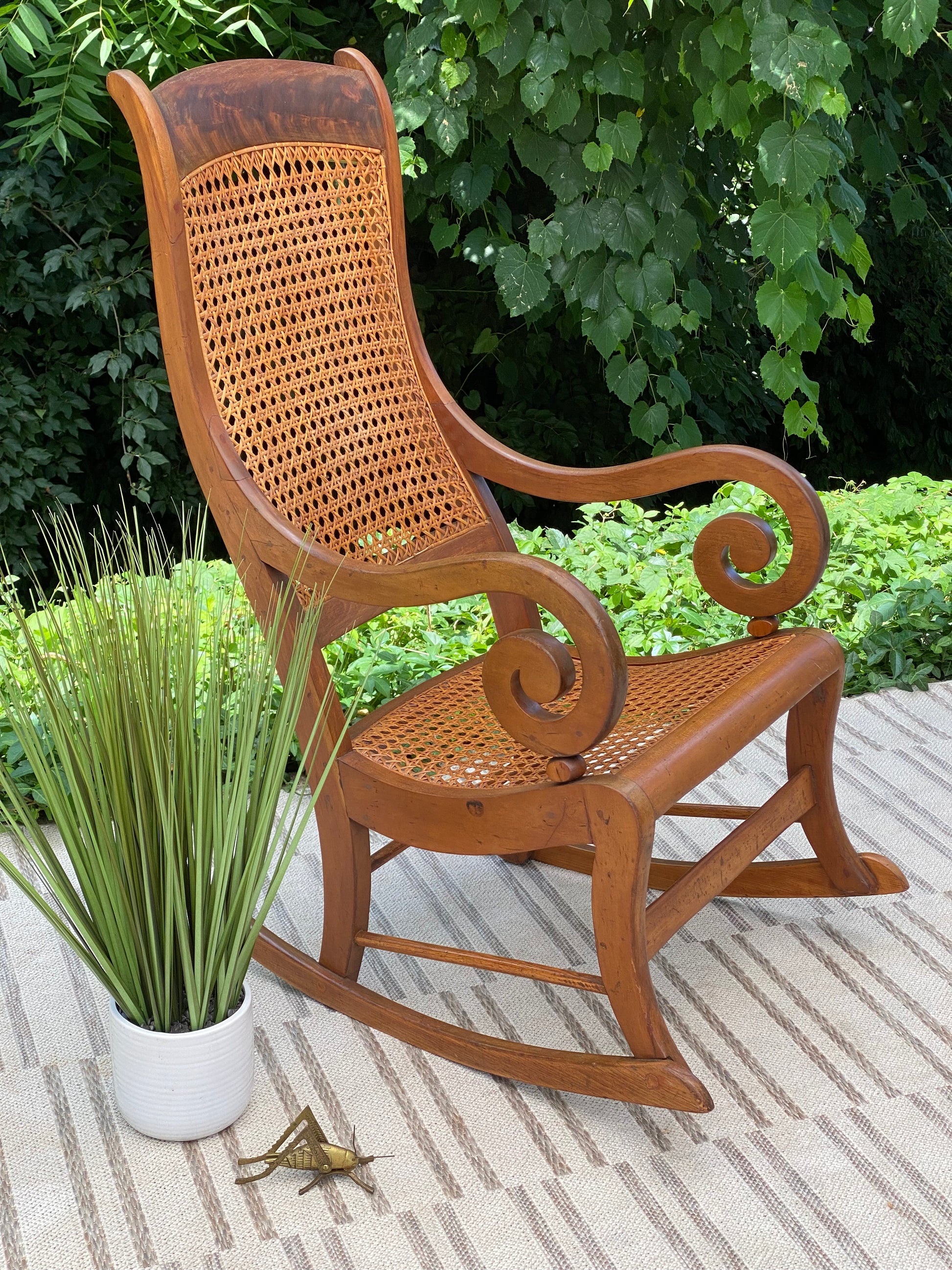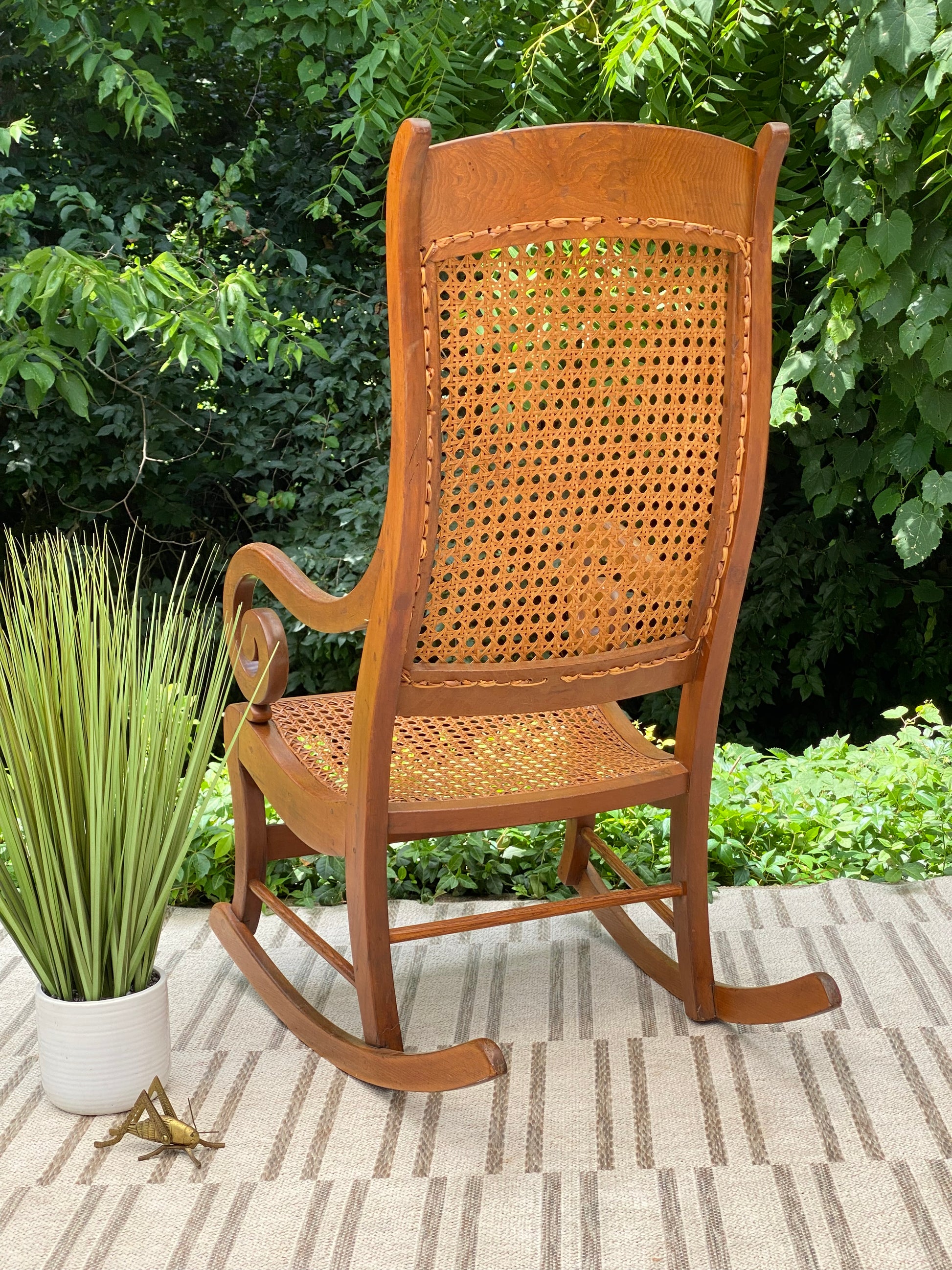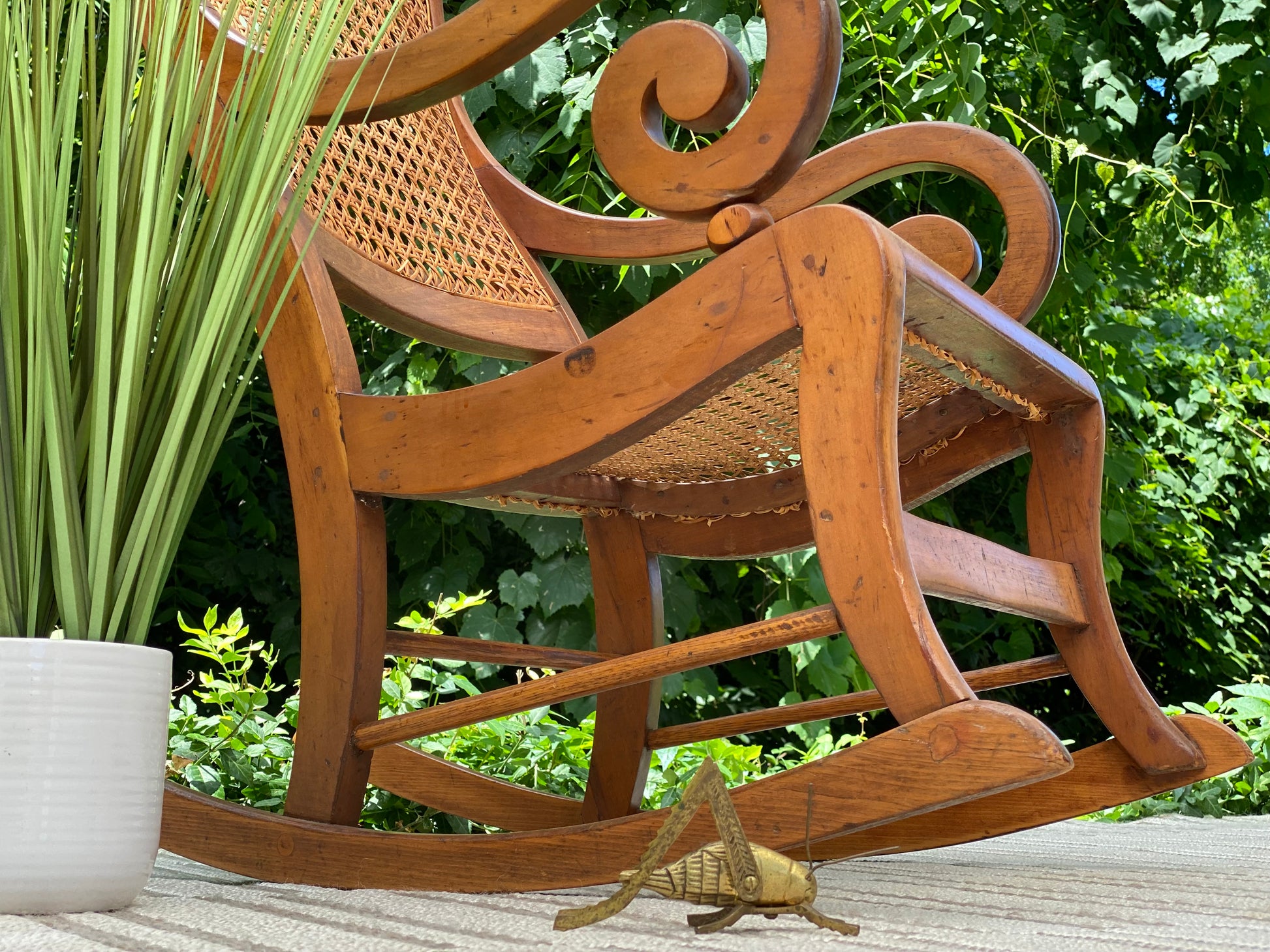 SOLD - Nice antique solid wood rocking with good caning. 41" x 21" x 33". Good condition