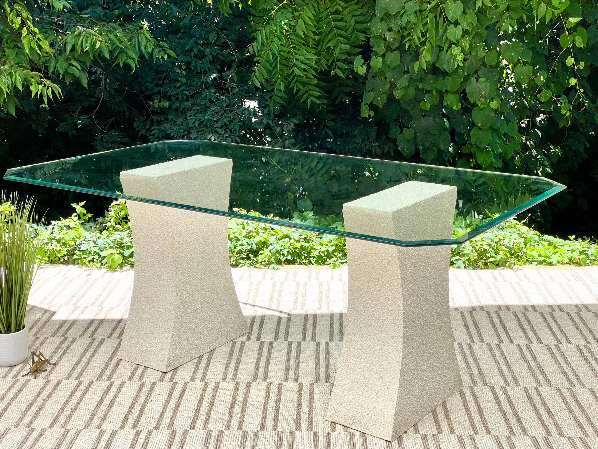 SOLD - Check out this retro glass table with white double pedestal base. 30" x 72" x 42". Good condition.