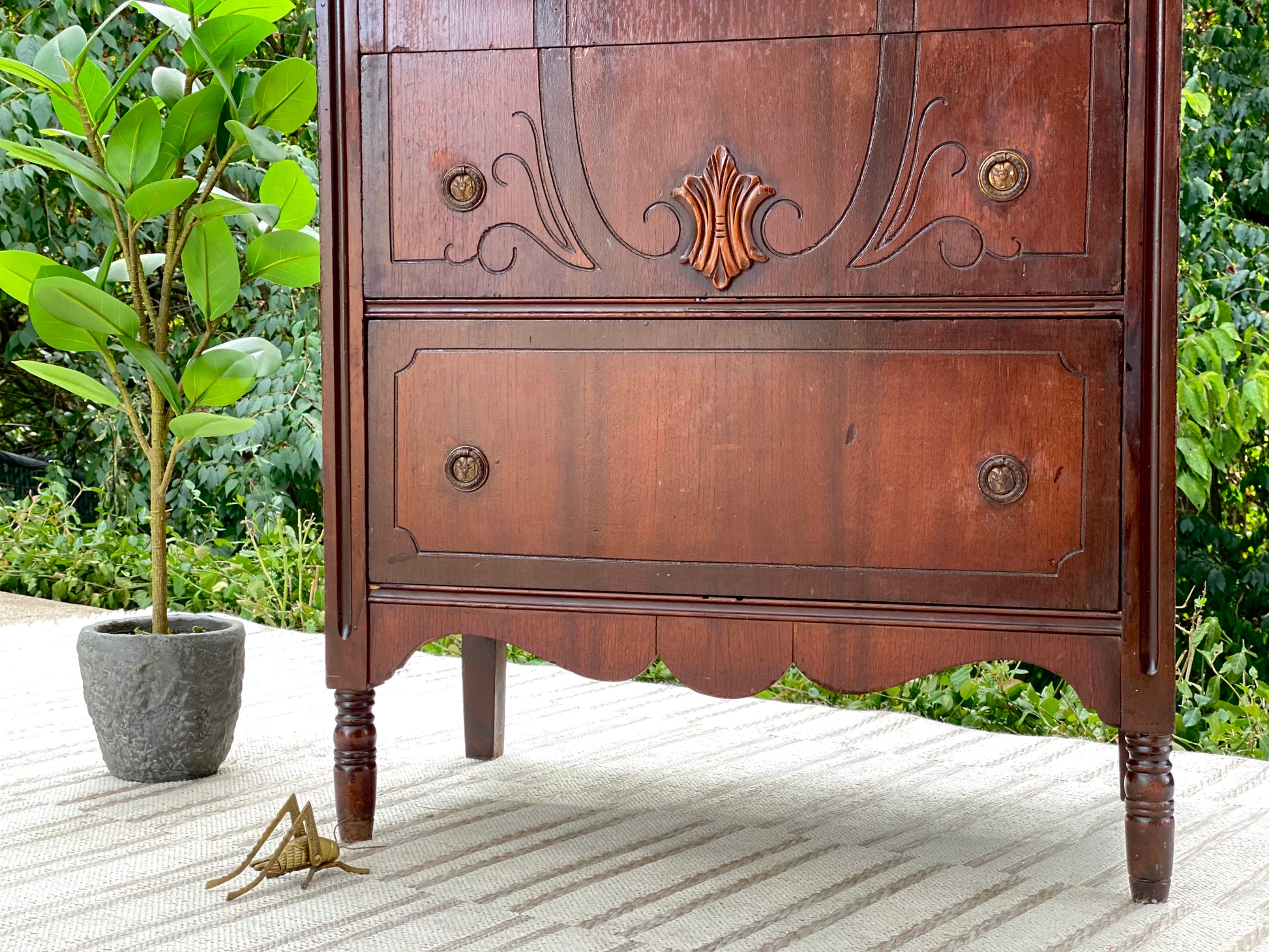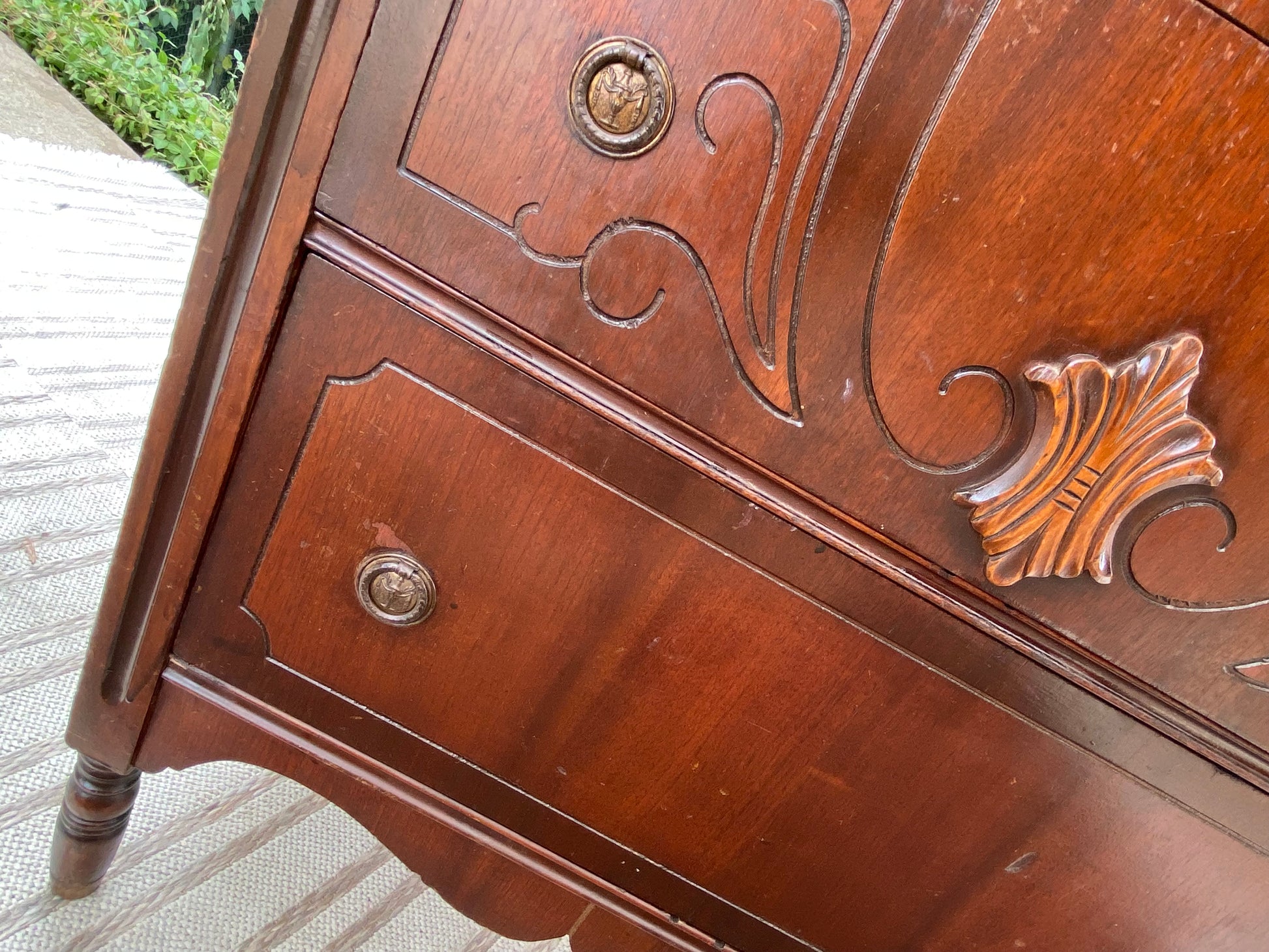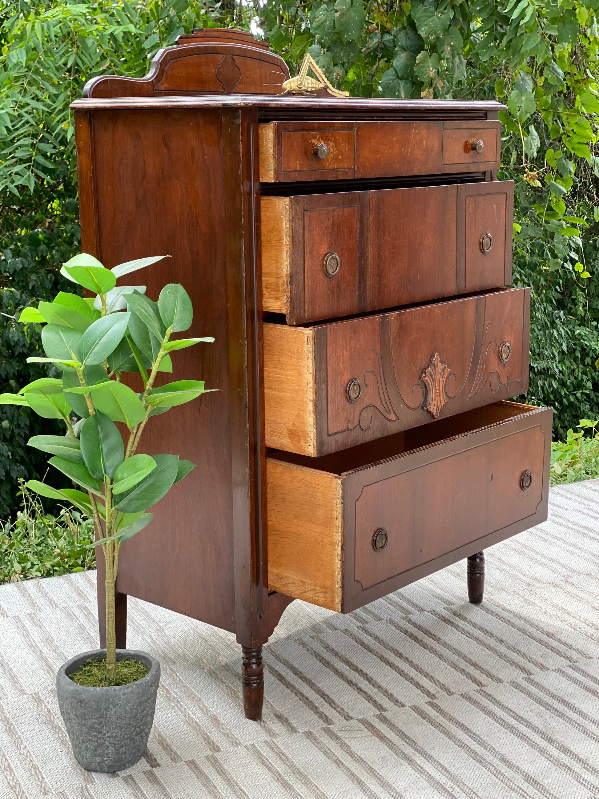 SOLD - New arrival! 🍁🧡 Check out this Dayton Furniture vintage walnut four drawer dresser with original pulls and hardware great storage piece and has tons of character! 51” x 31” x 18” Good condition