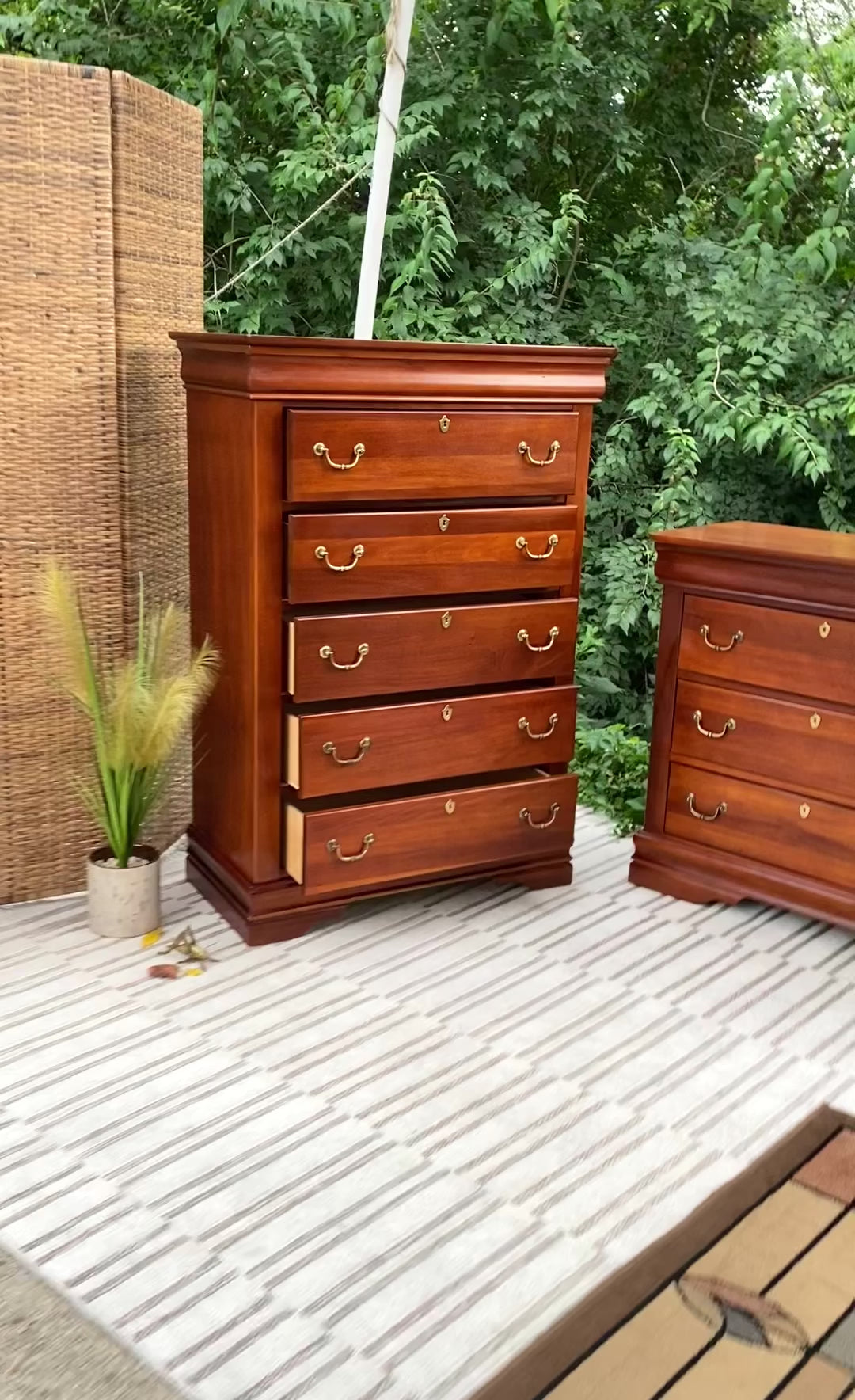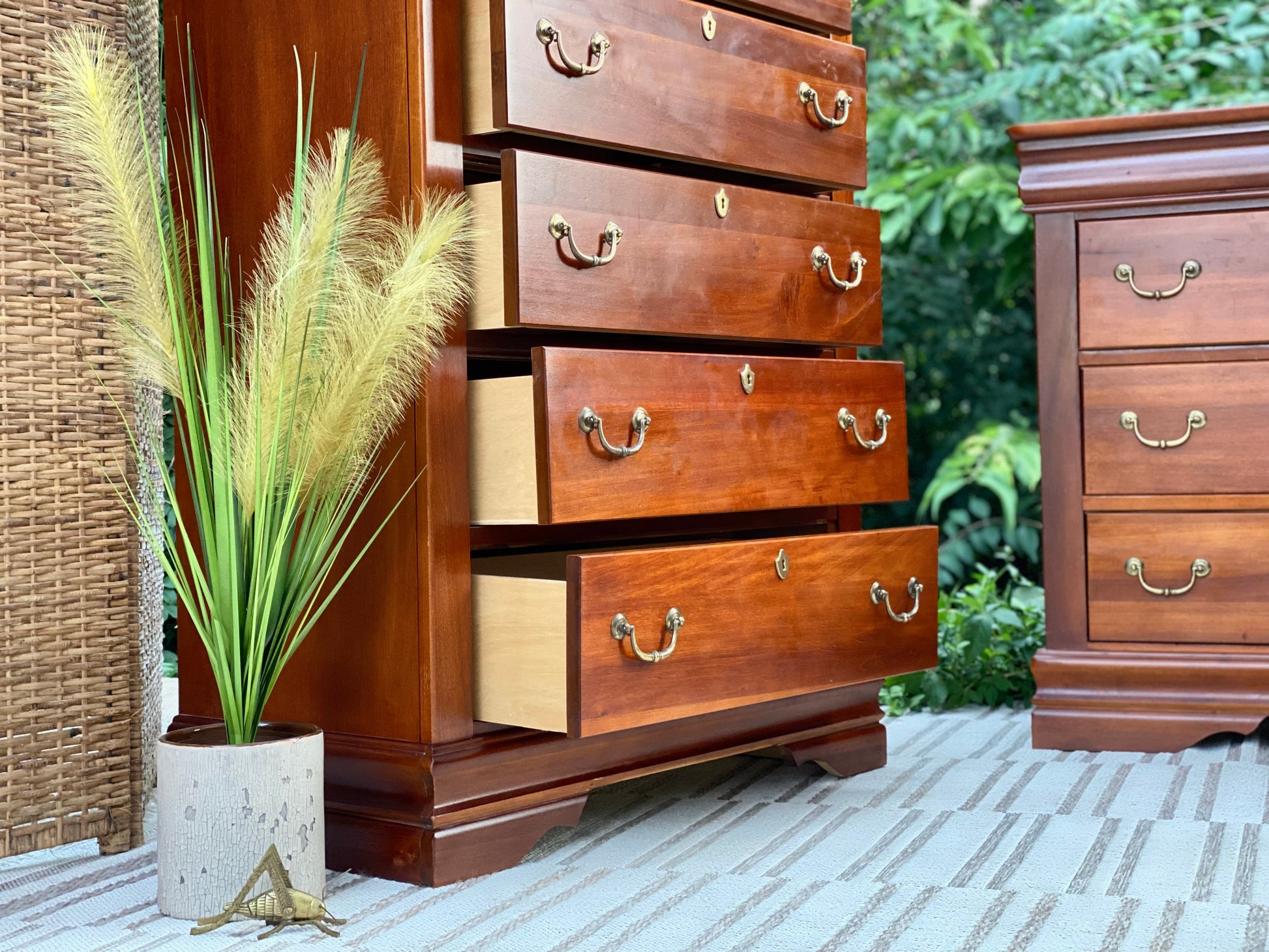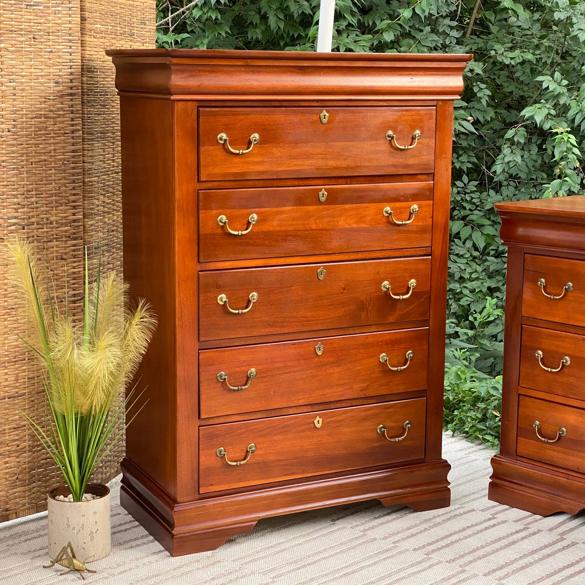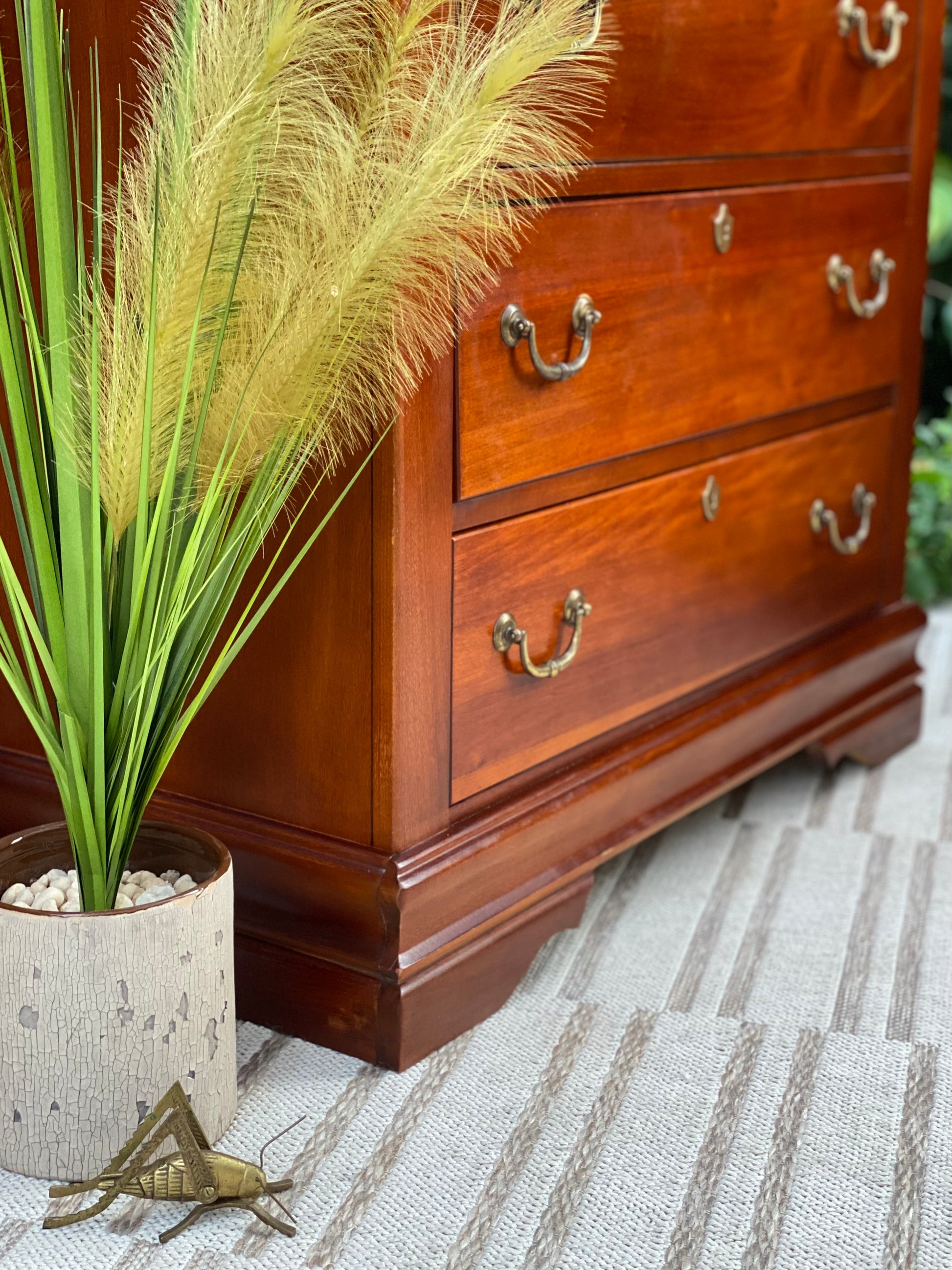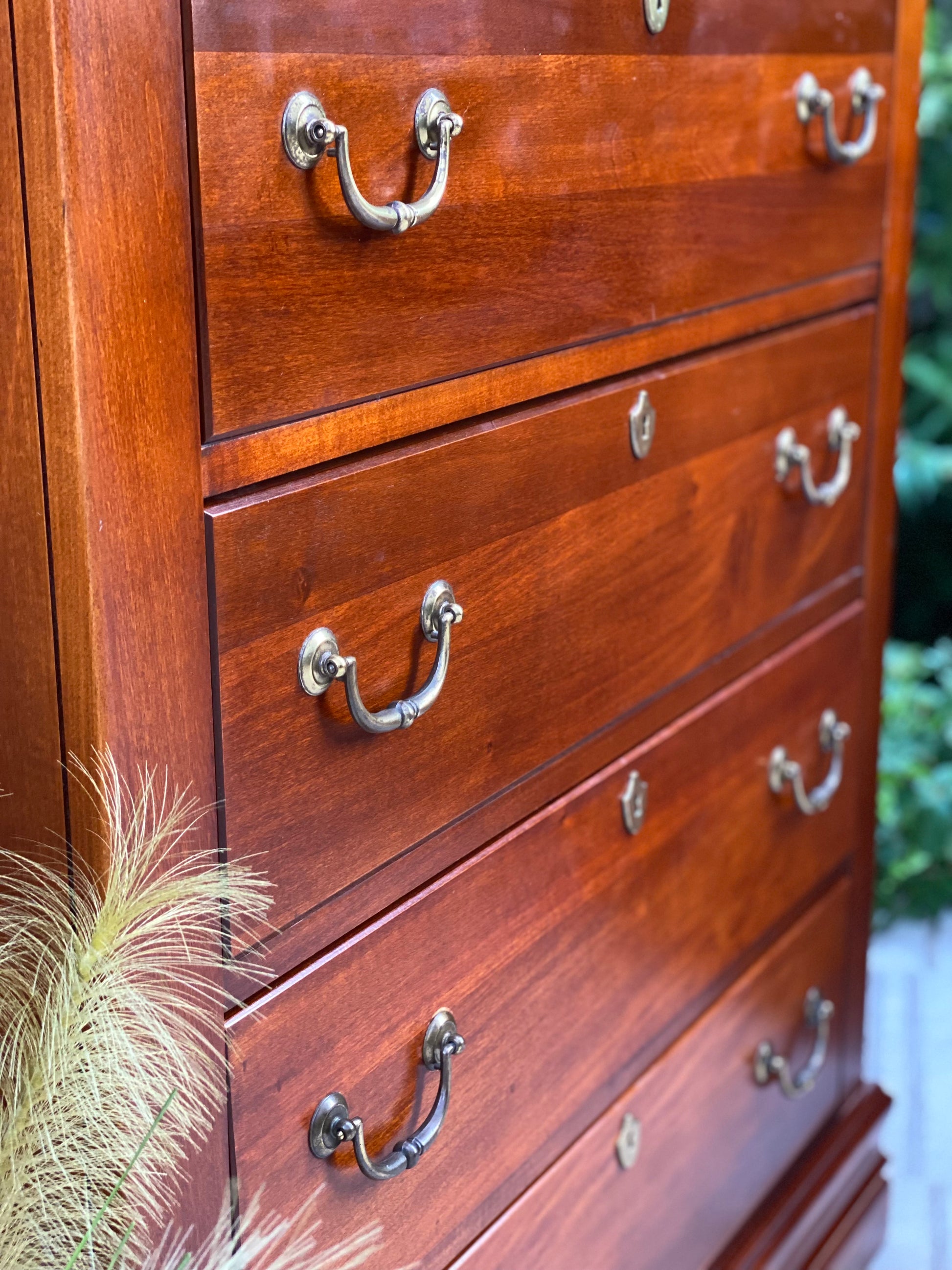 SOLD - New arrival! Check out this modern wooden 5 drawer tall highboy dresser. Classic design with lots of storage. 52" x 36" x 18". Good condition.