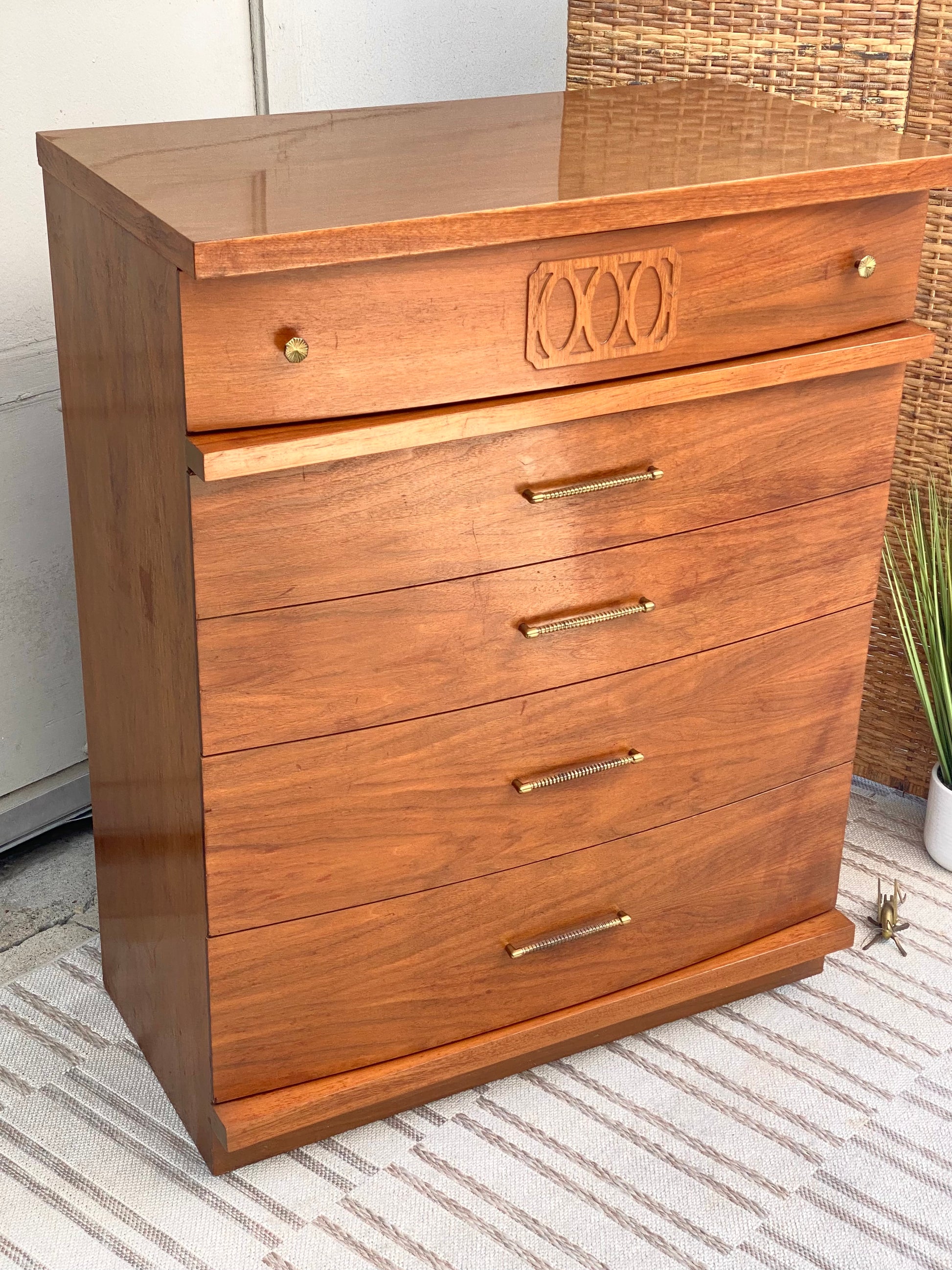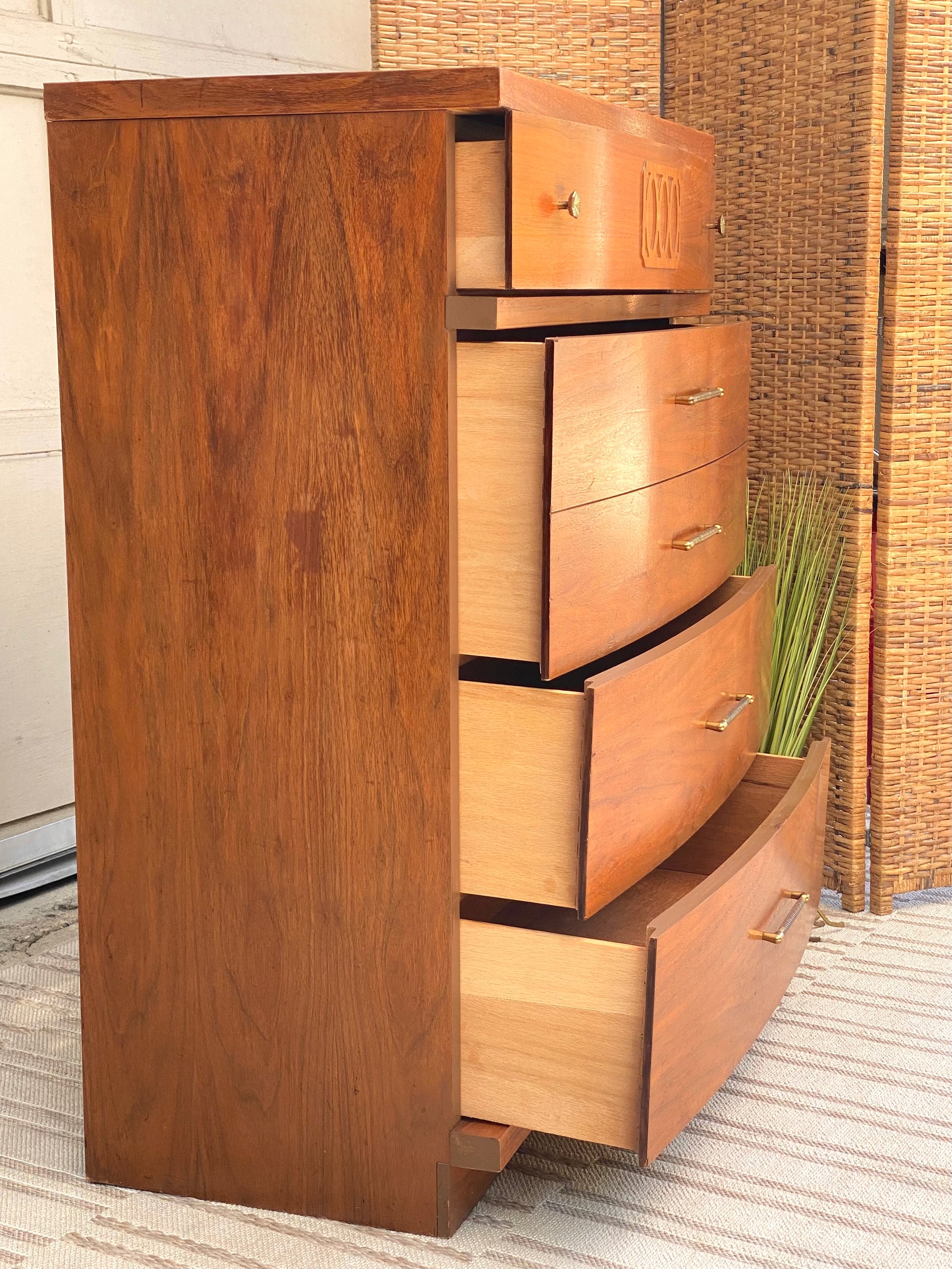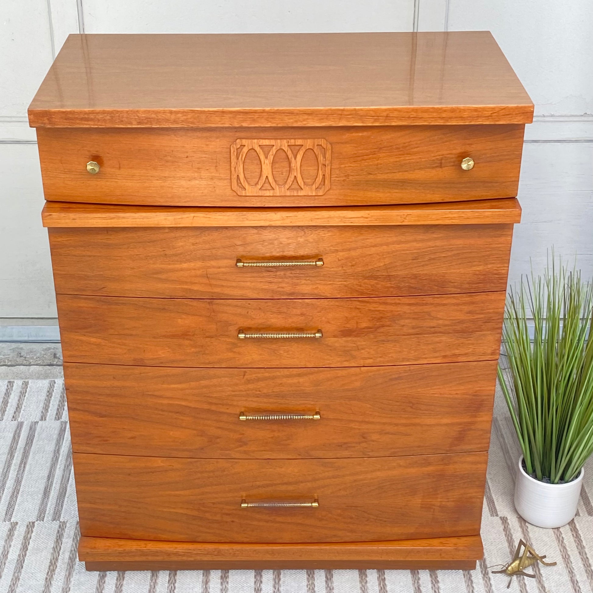 SOLD - New arrival! Check out this MCM mid century Style House 4 drawer tall wooden dresser. Classic design with lots of storage in this one. 43” x 34” x 18” Good condition
