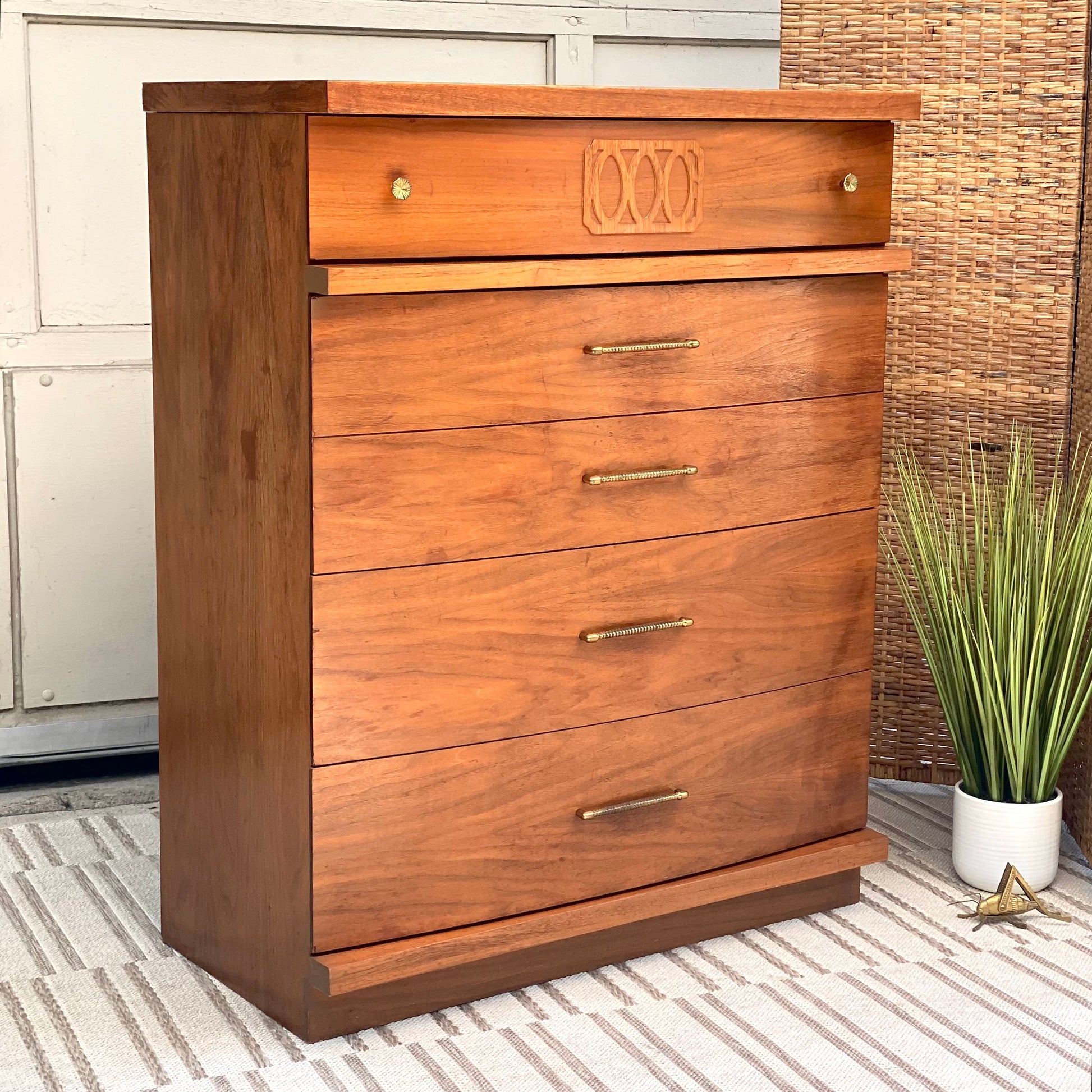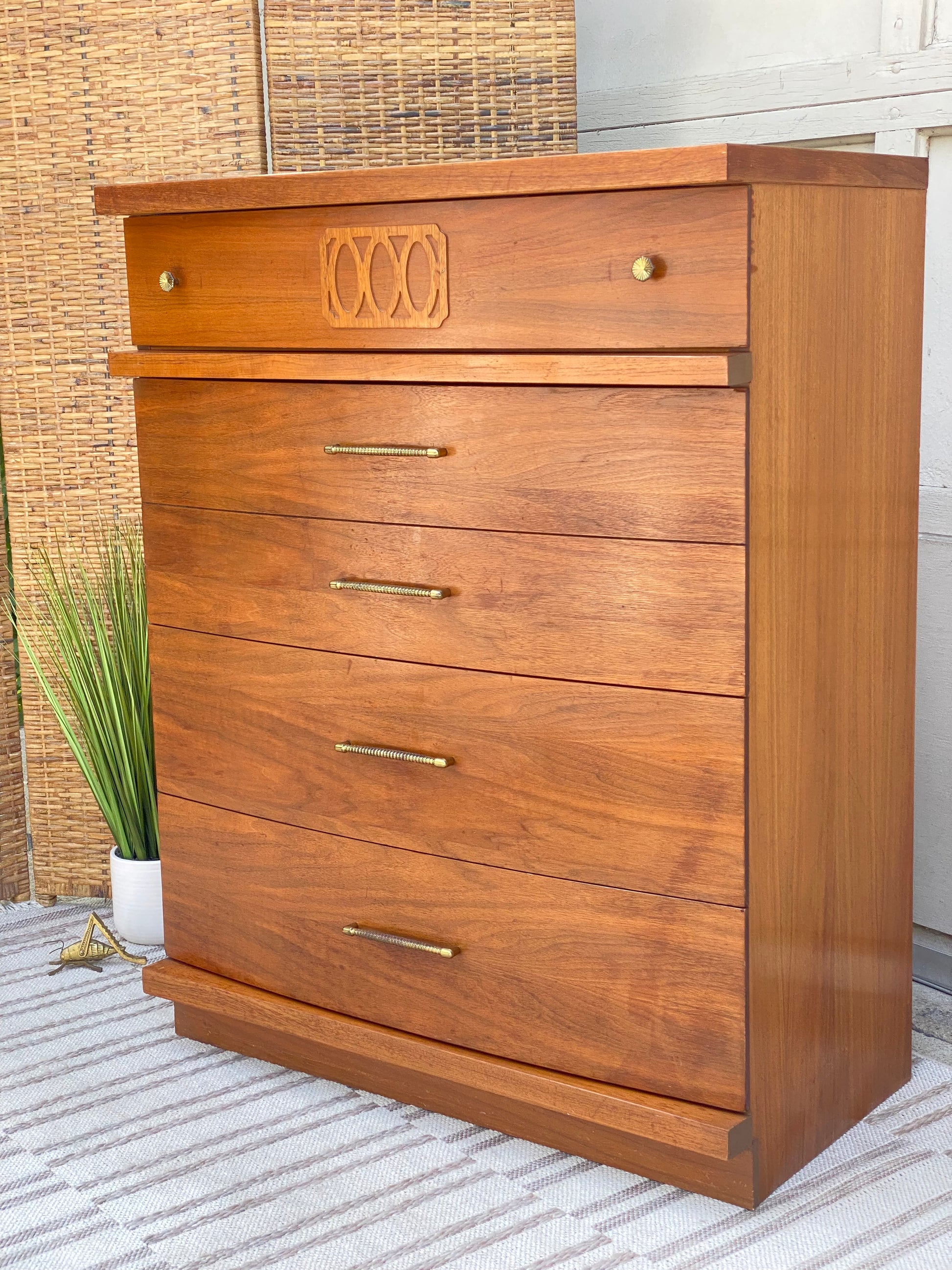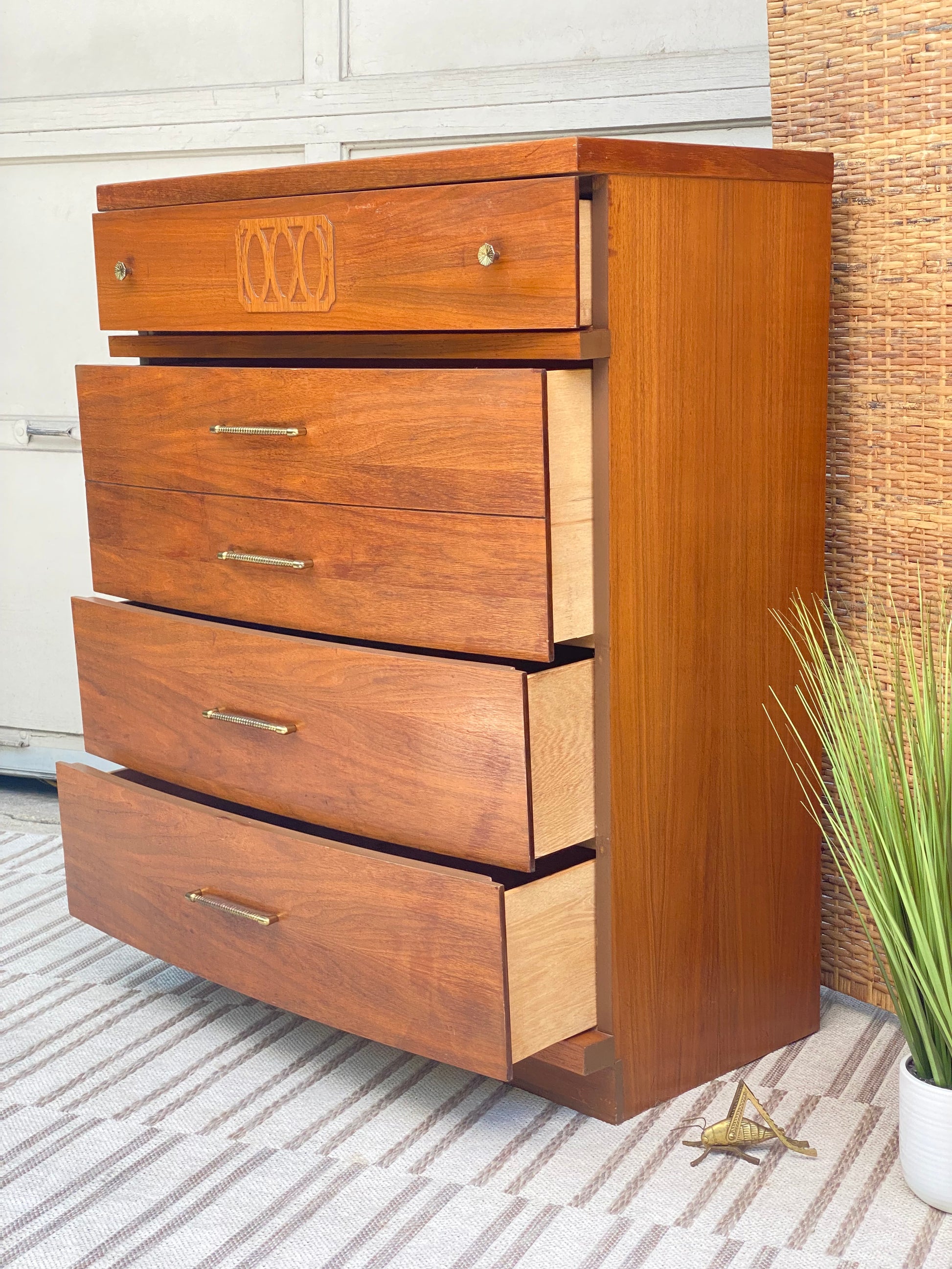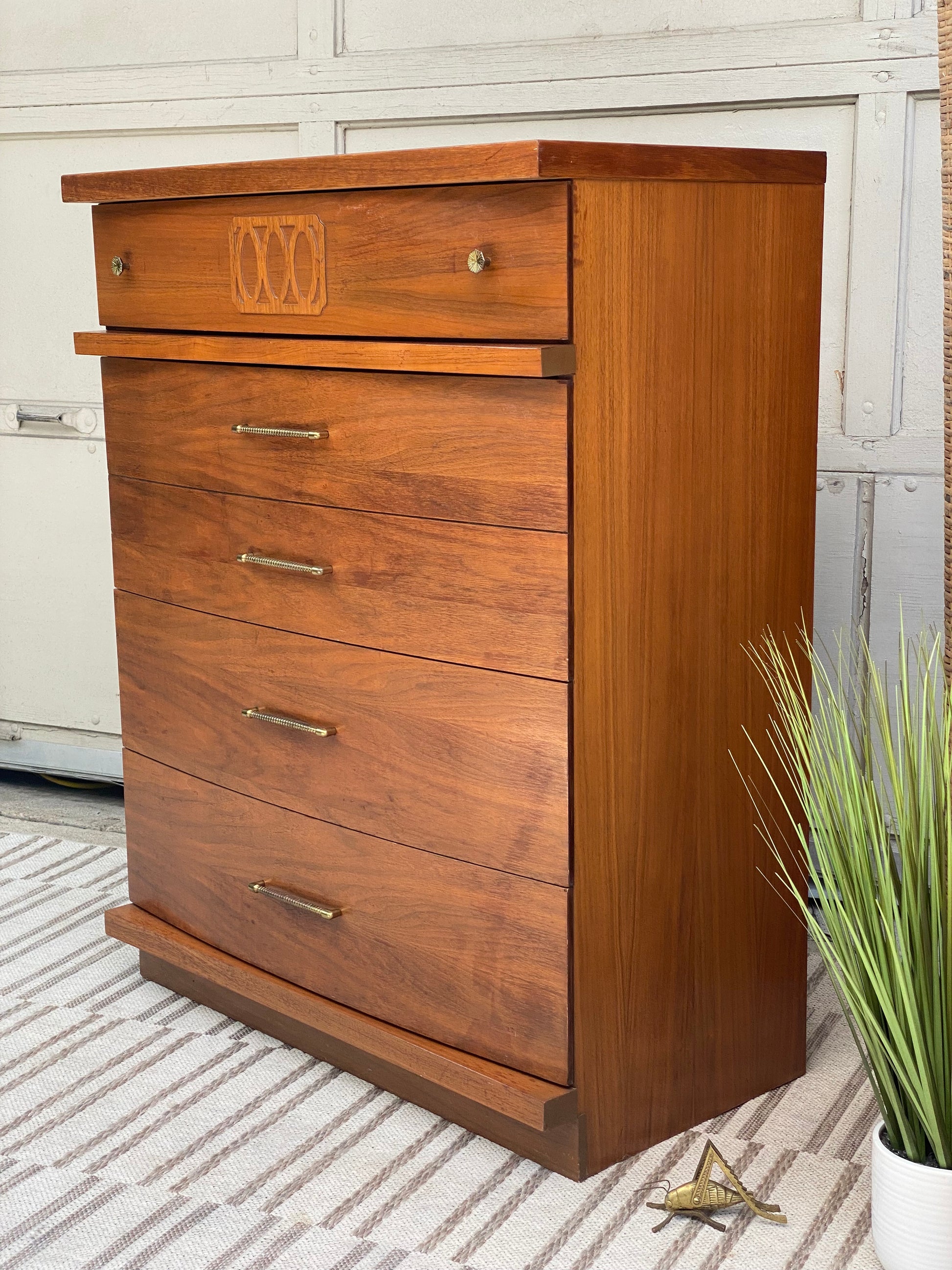 SOLD - New arrival! Check out this MCM mid century Style House 4 drawer tall wooden dresser. Classic design with lots of storage in this one. 43” x 34” x 18” Good condition