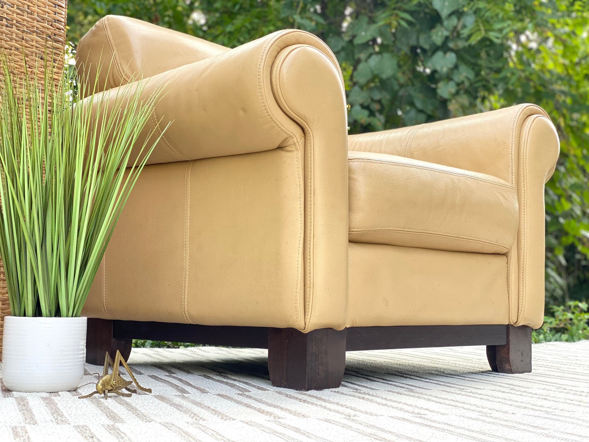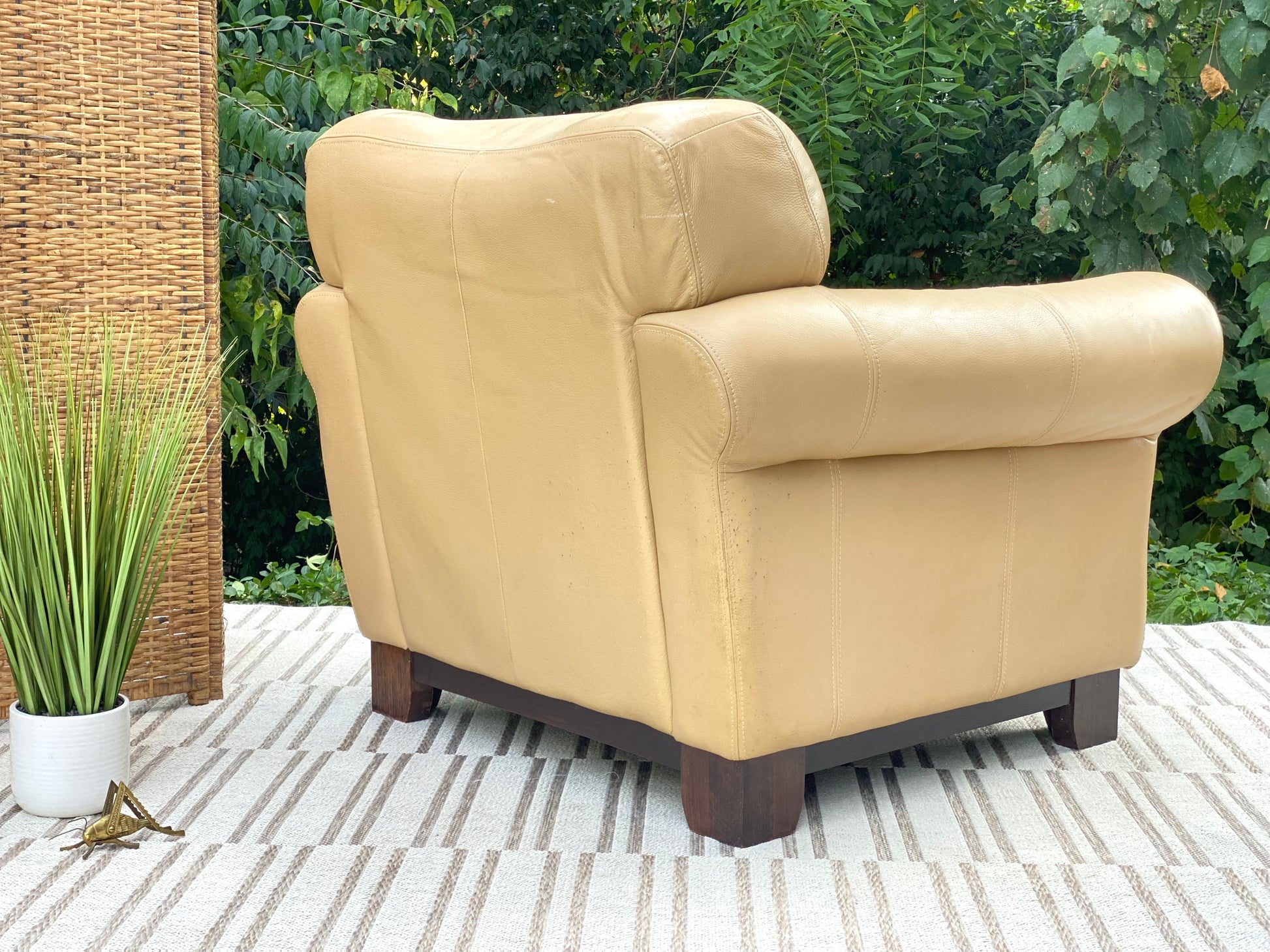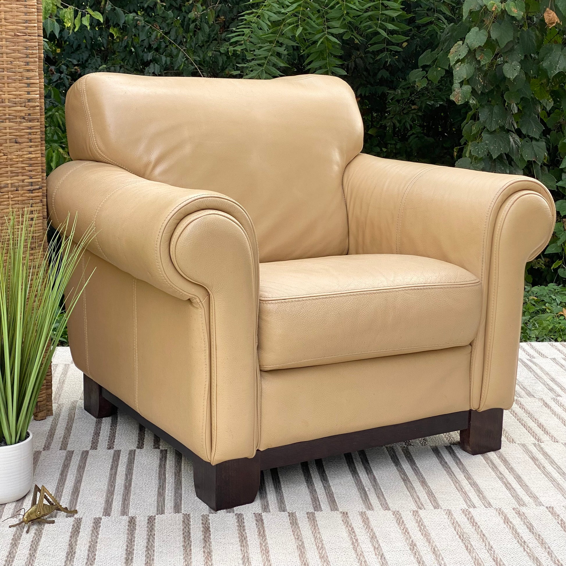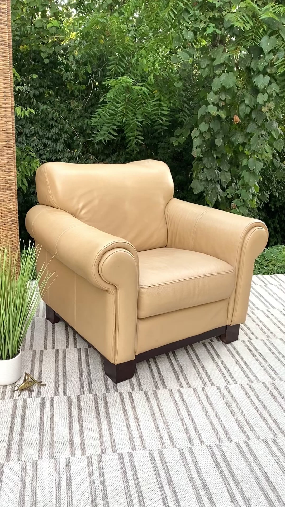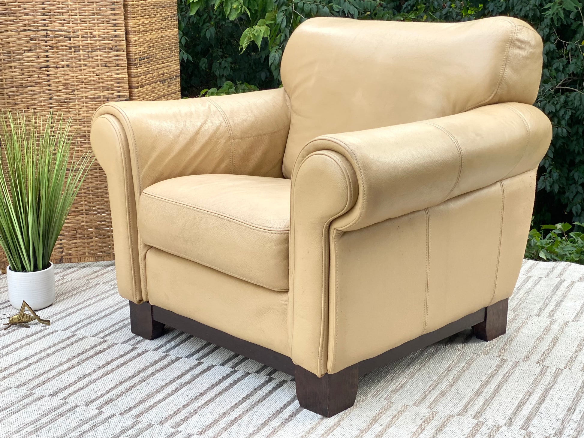 SOLD - New arrival! Check out this modern tan leather plush chair. Very comfortable and nice quality leather construction. 38” x 44” x 38” Good condition