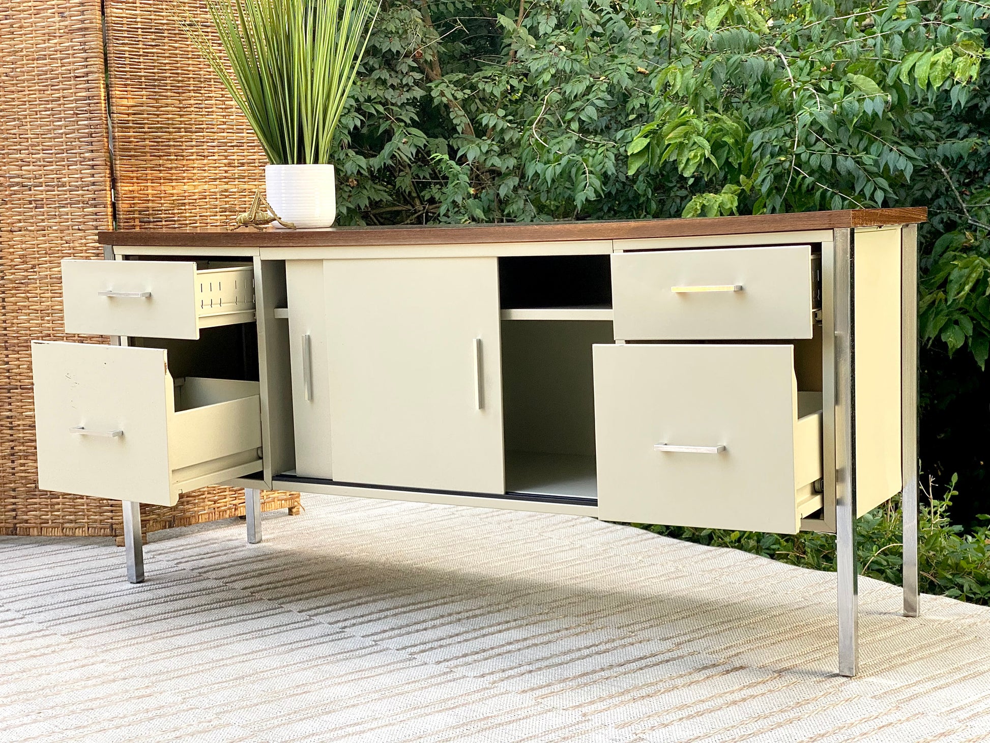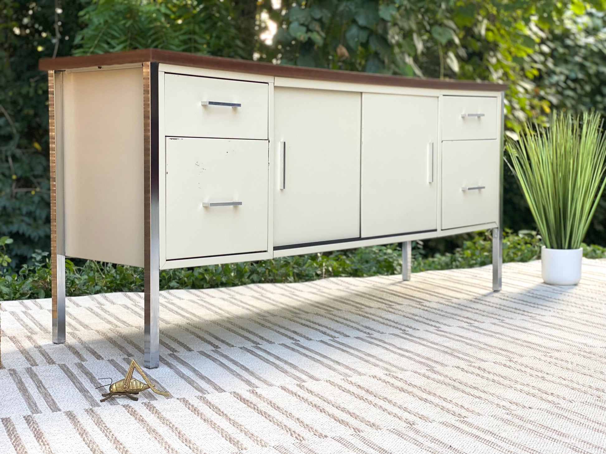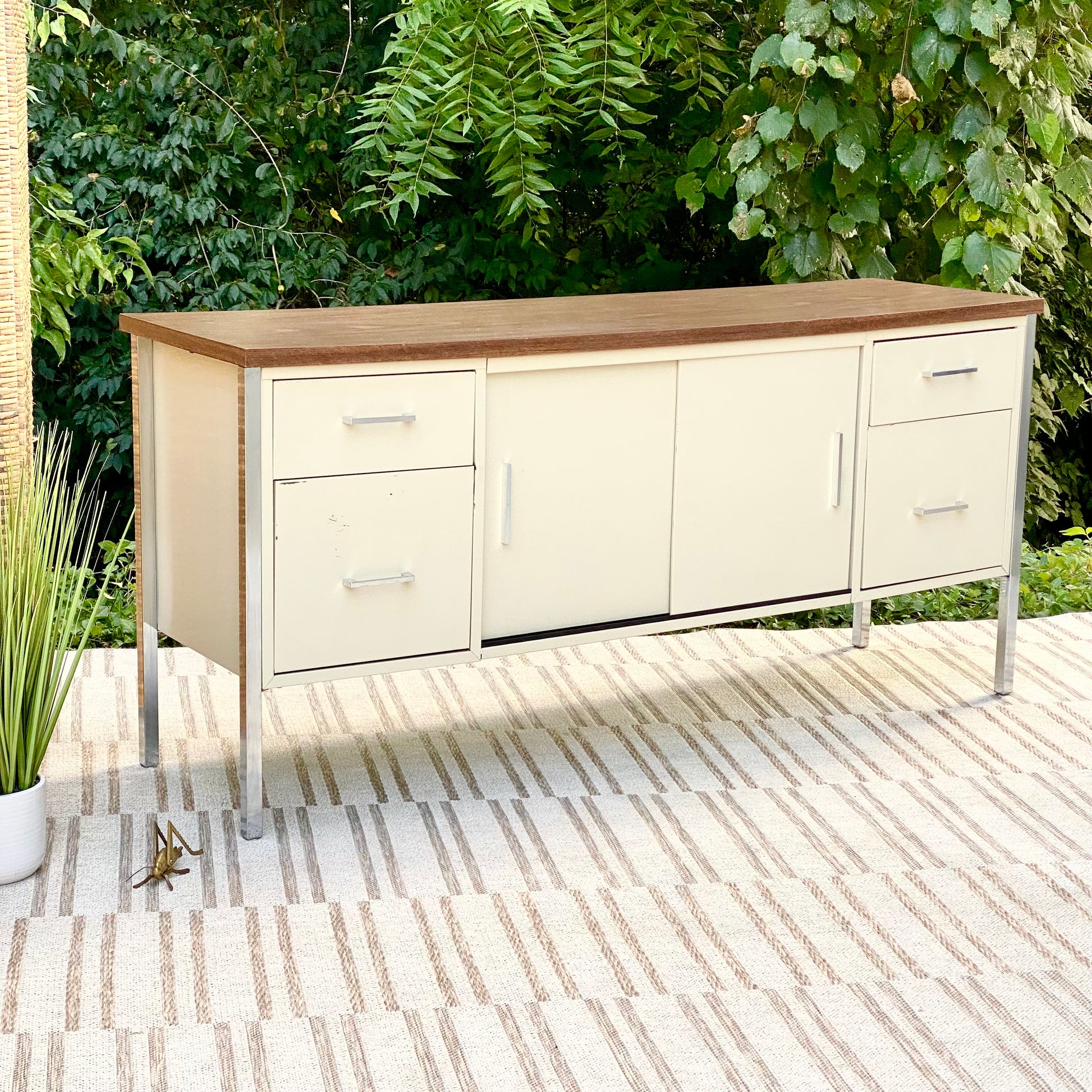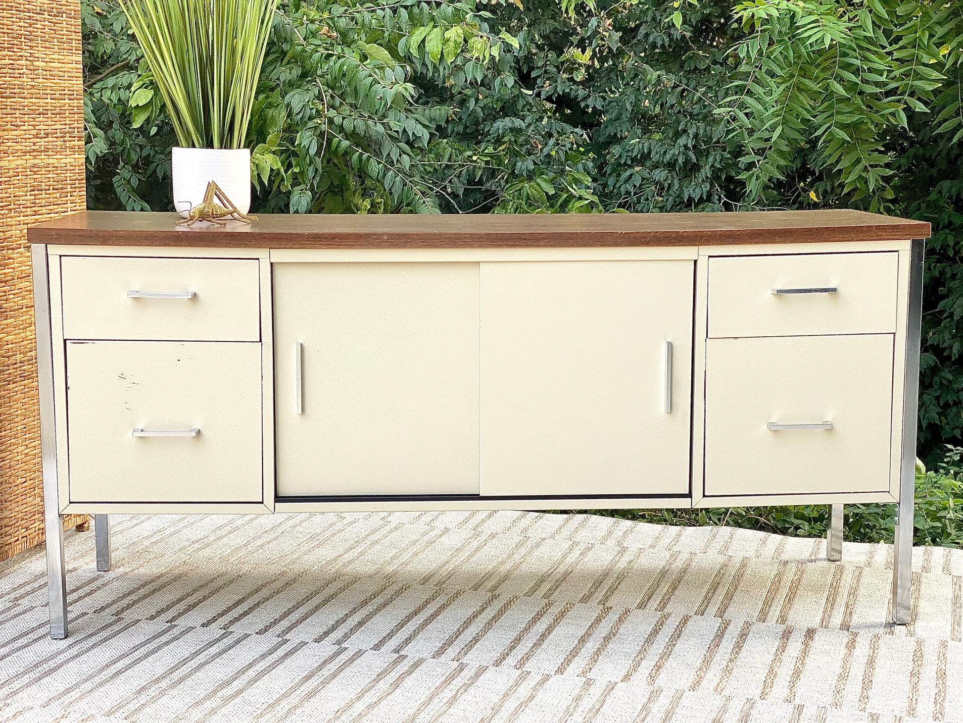 SOLD - Vintage MCM mid century modern metal credenza. Great storage option and can be used anywhere. Office, tv stand, plant stand, hallway or wherever. 29” x 62” x 19” Good condition