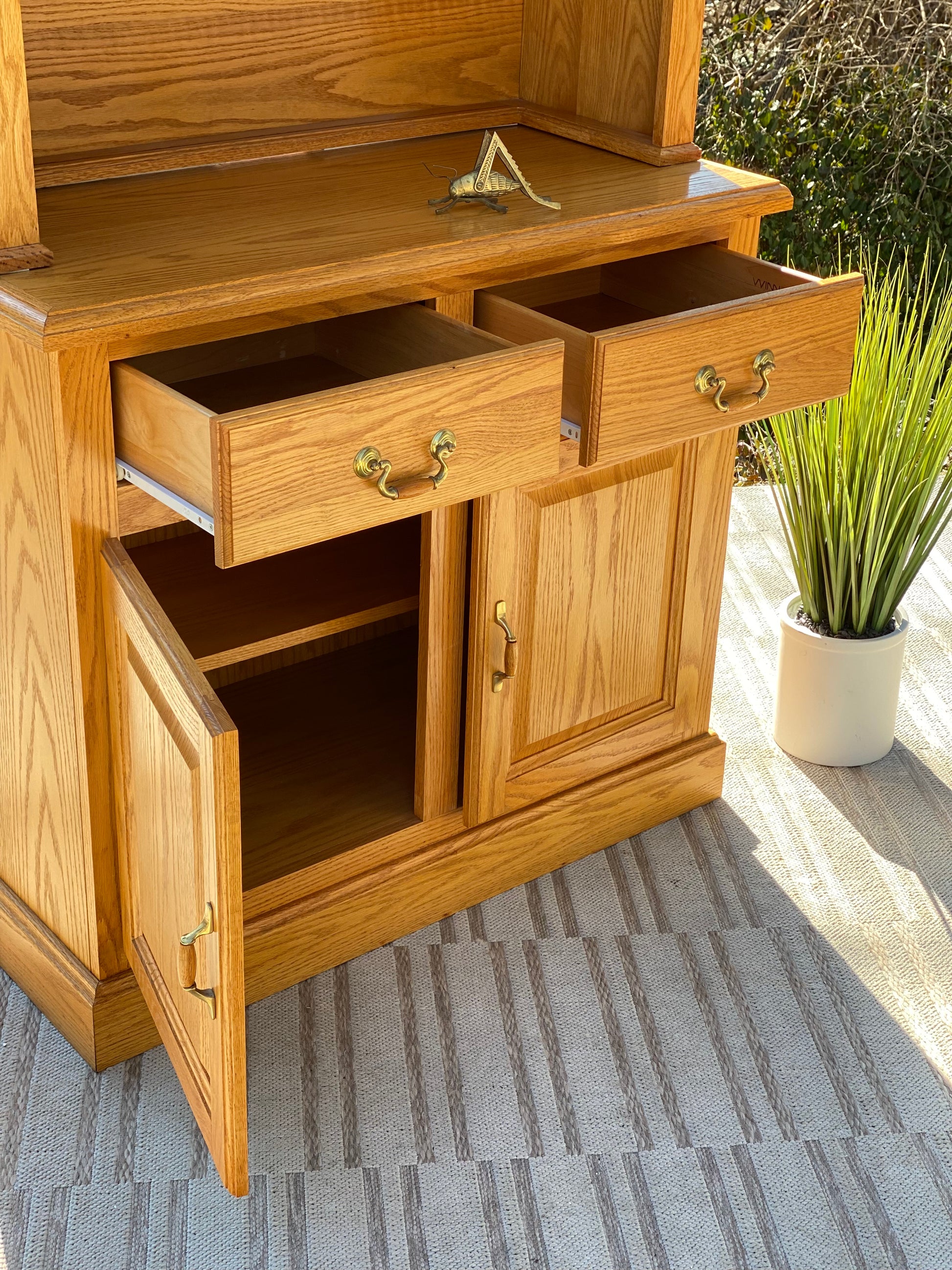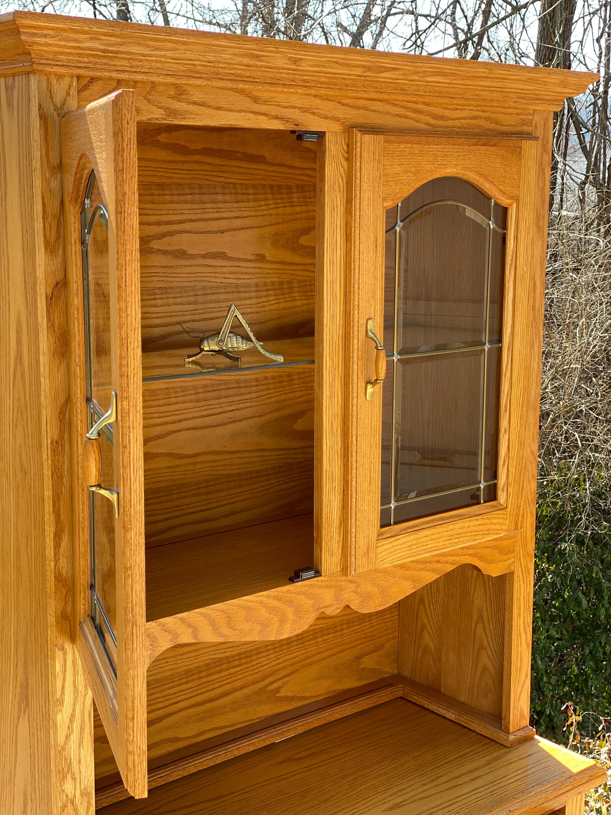 SOLD - Fresh find! 🌱❄️ Check out this nice light stained wooden hutch. Beautiful let glass design on top. Lower storage and an overall nice piece. 78” x 38” x 18” Good condition