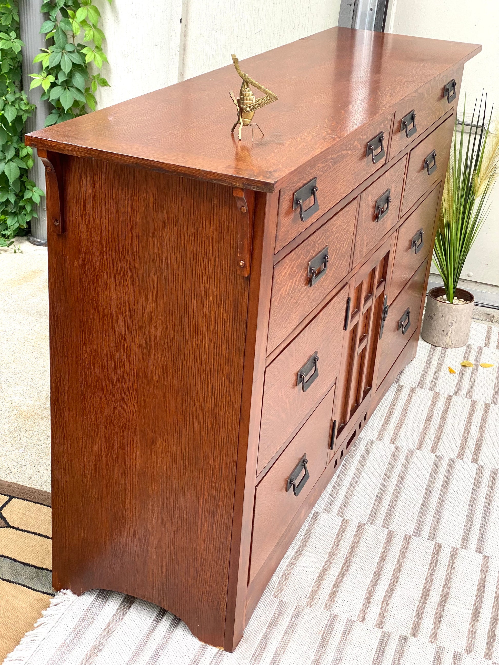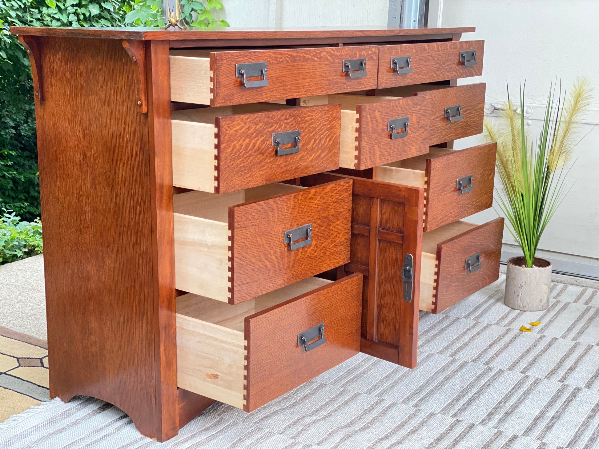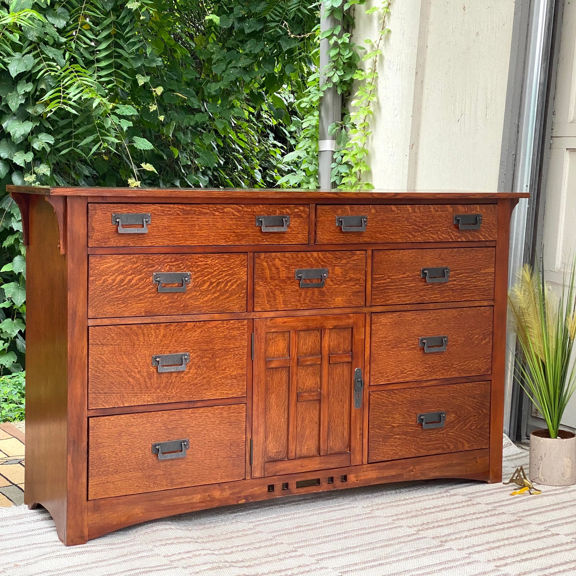 SOLD - Newest arrival! A modern Arts & Crafts Broyhill style 9 drawer dress with extra center storage door. Great look with a classic design. Very light wear spot on top. 40” x 66” x 18” Good condition.