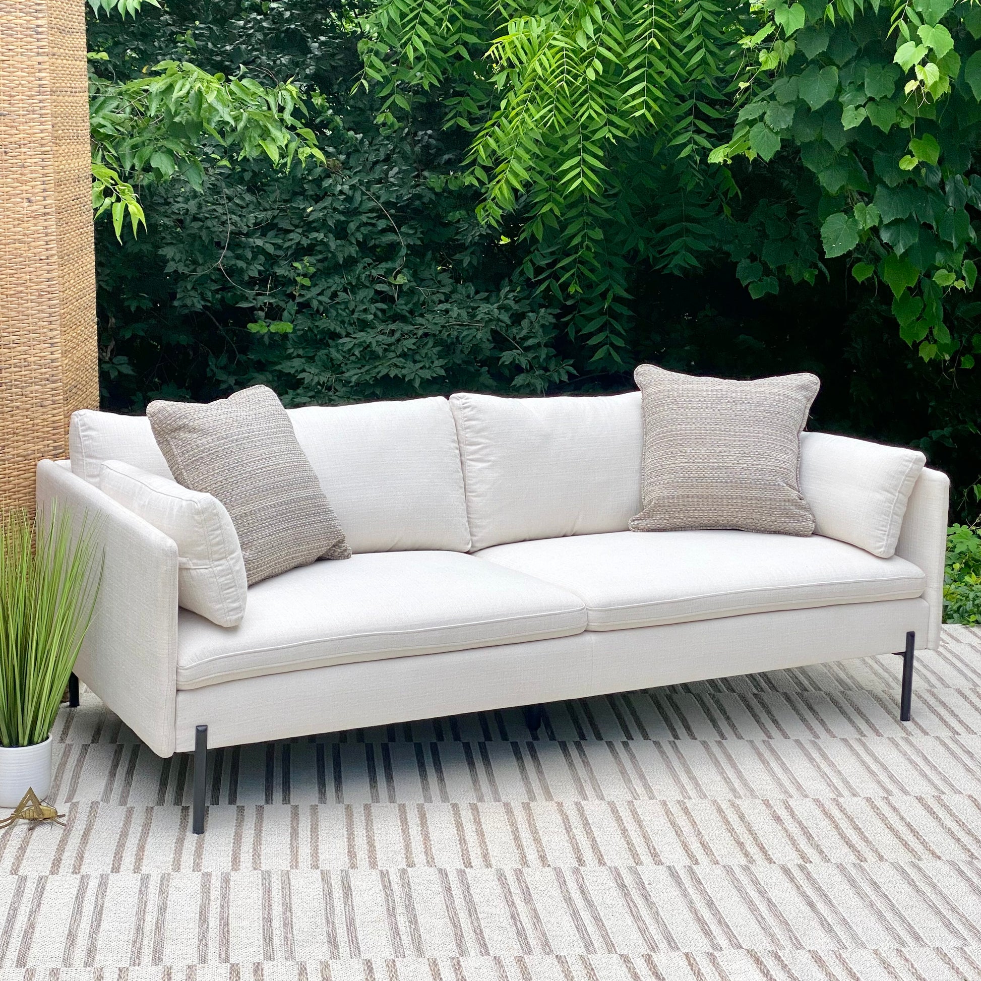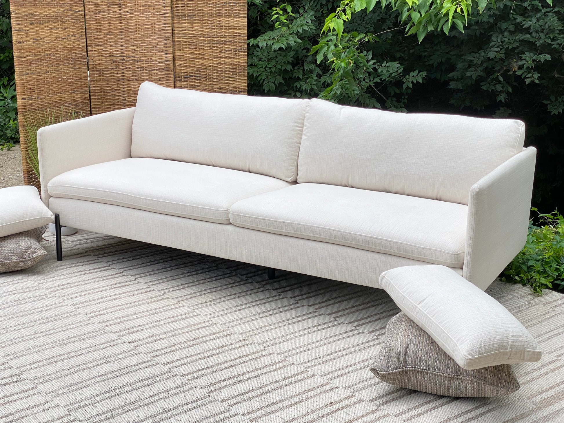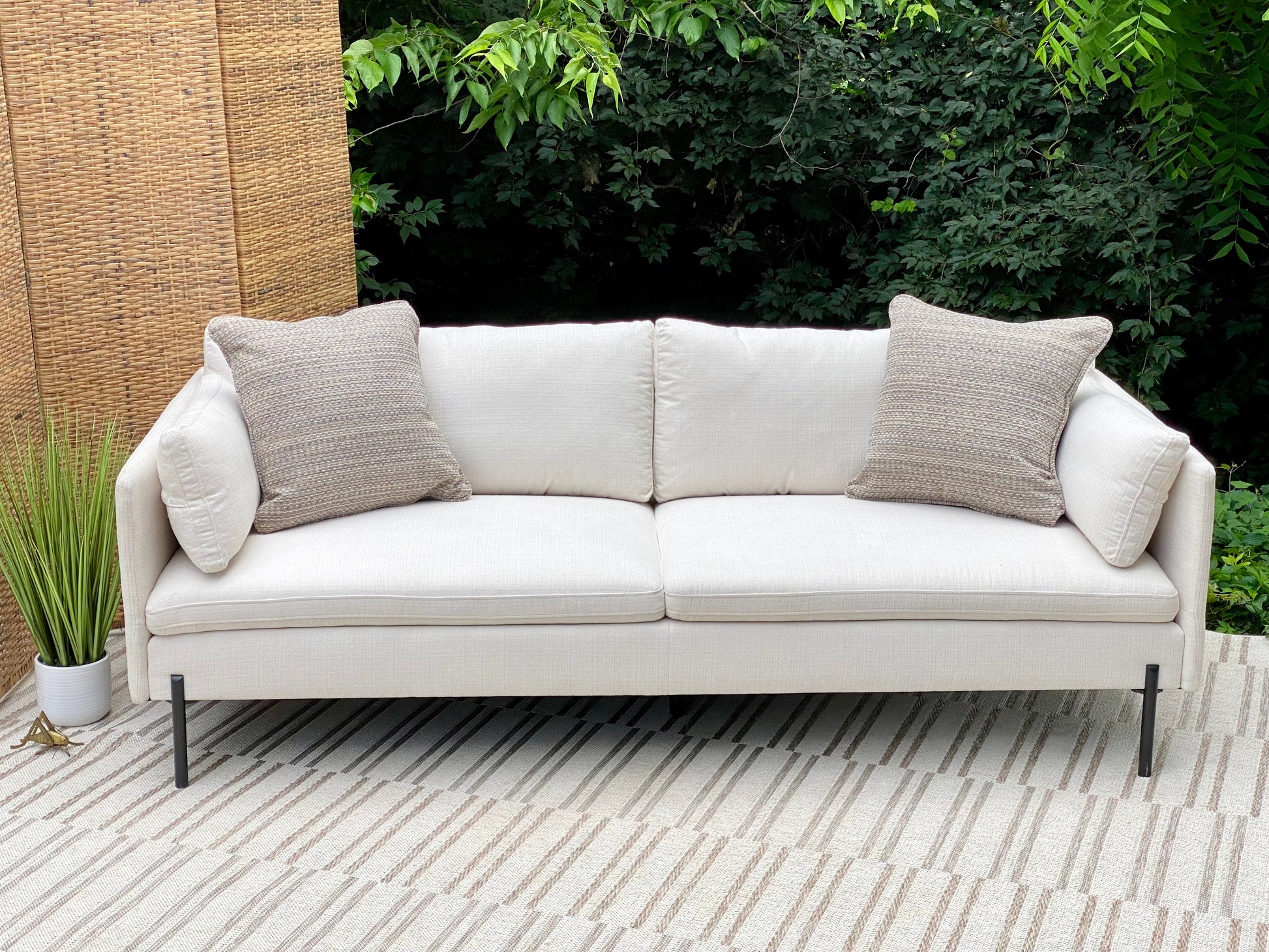 SOLD - A beautiful modern white fabric upholstered sofa with low profile and light gray throw pillows. 25" x 81" x 36" Excellent condition.