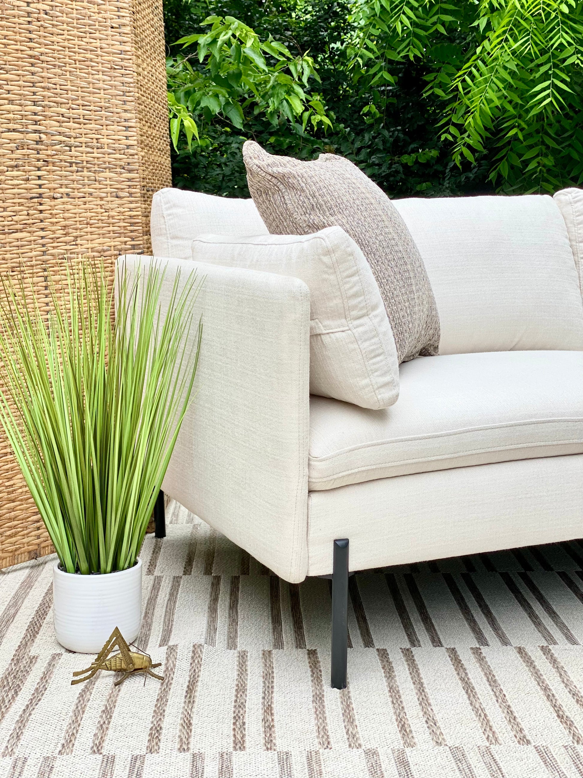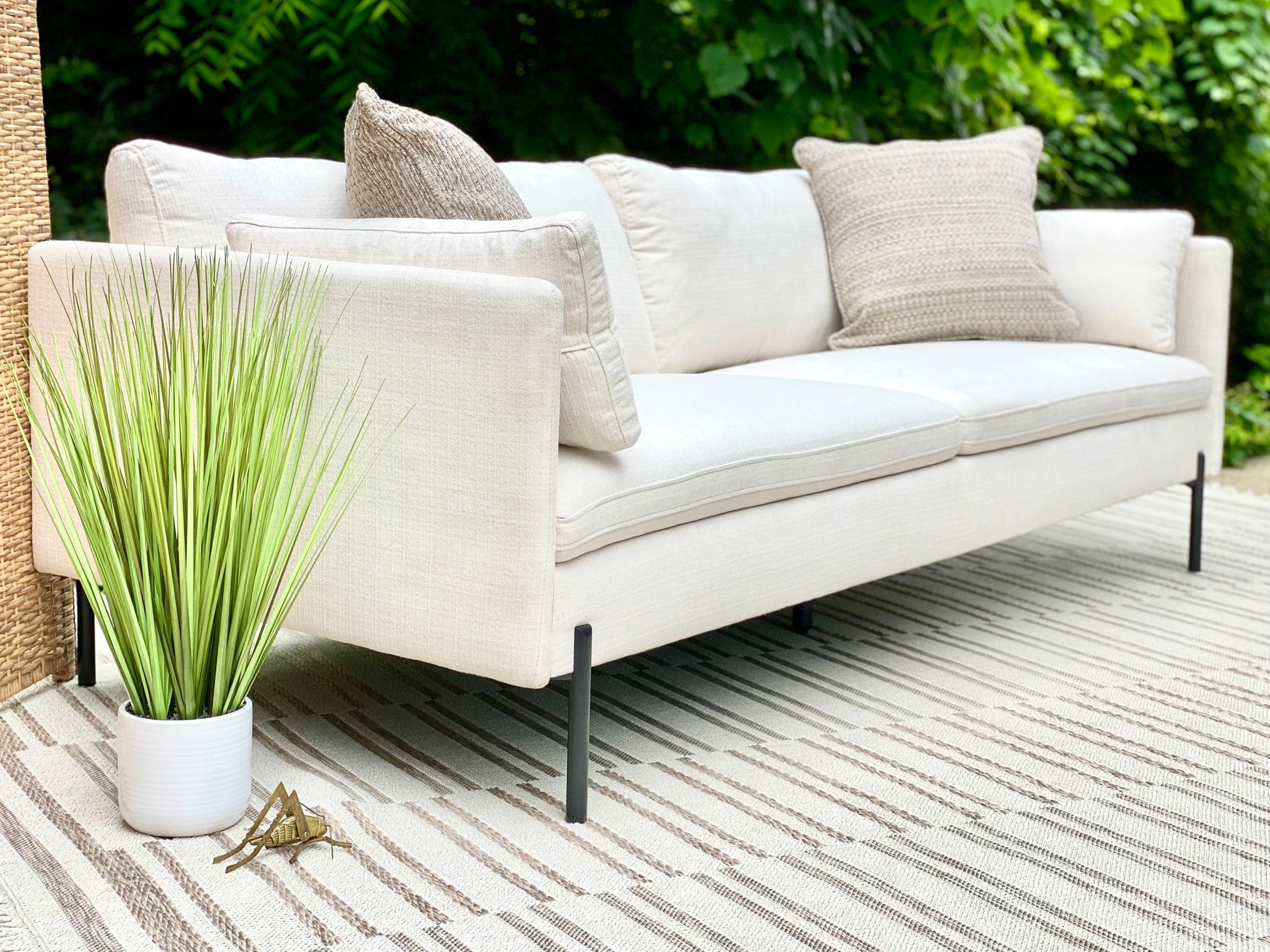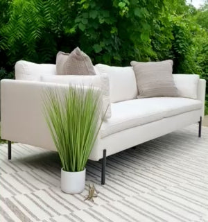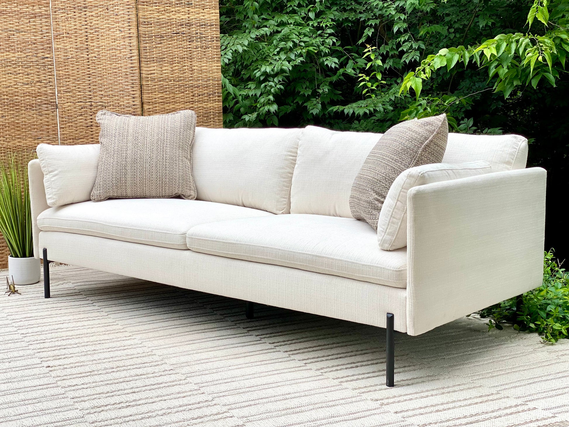 SOLD - A beautiful modern white fabric upholstered sofa with low profile and light gray throw pillows. 25" x 81" x 36" Excellent condition.