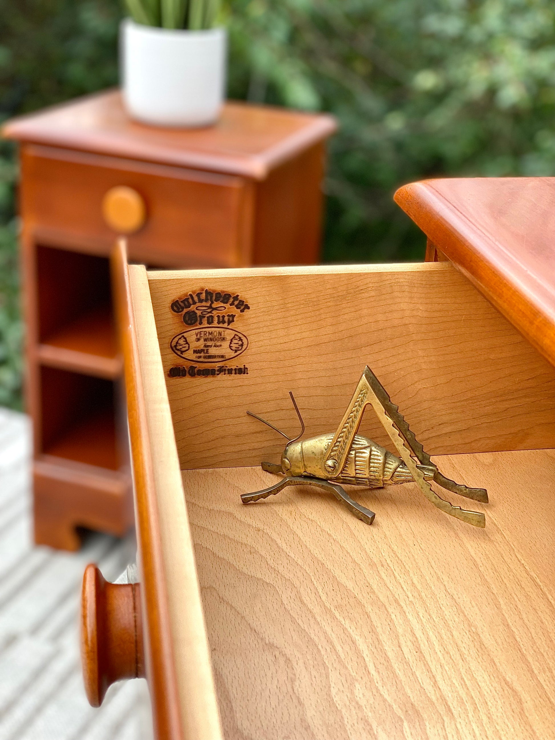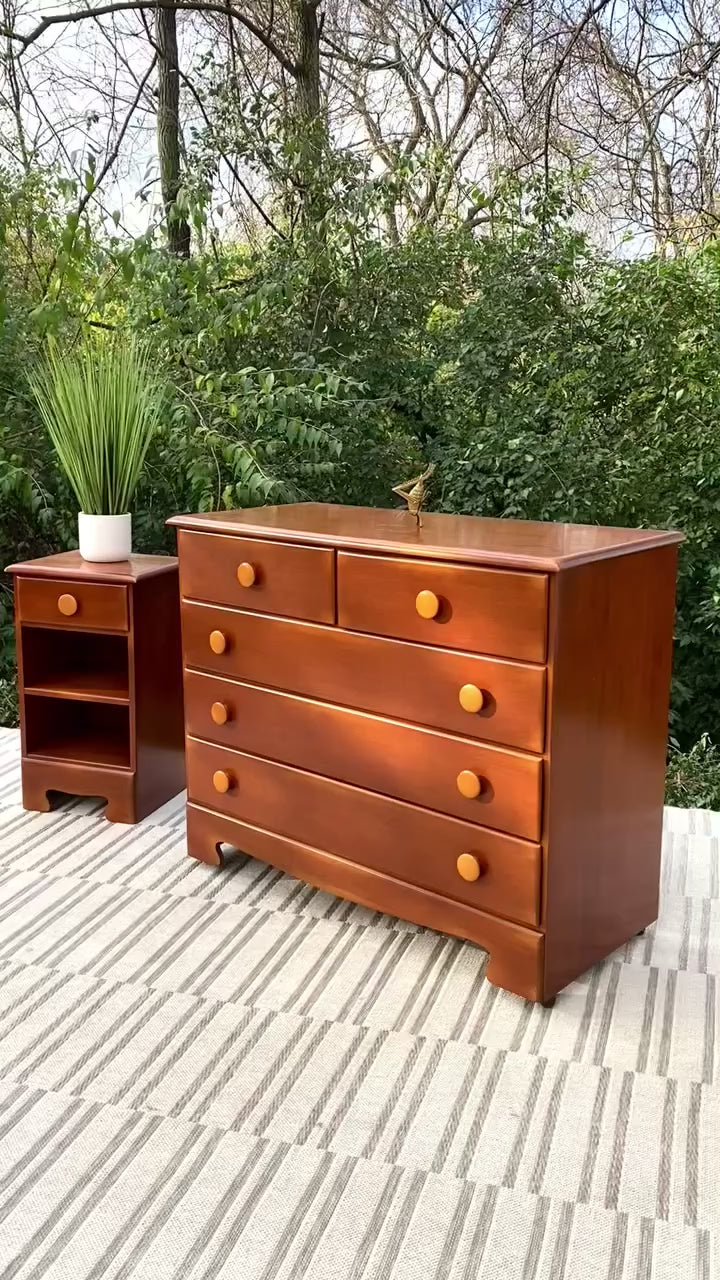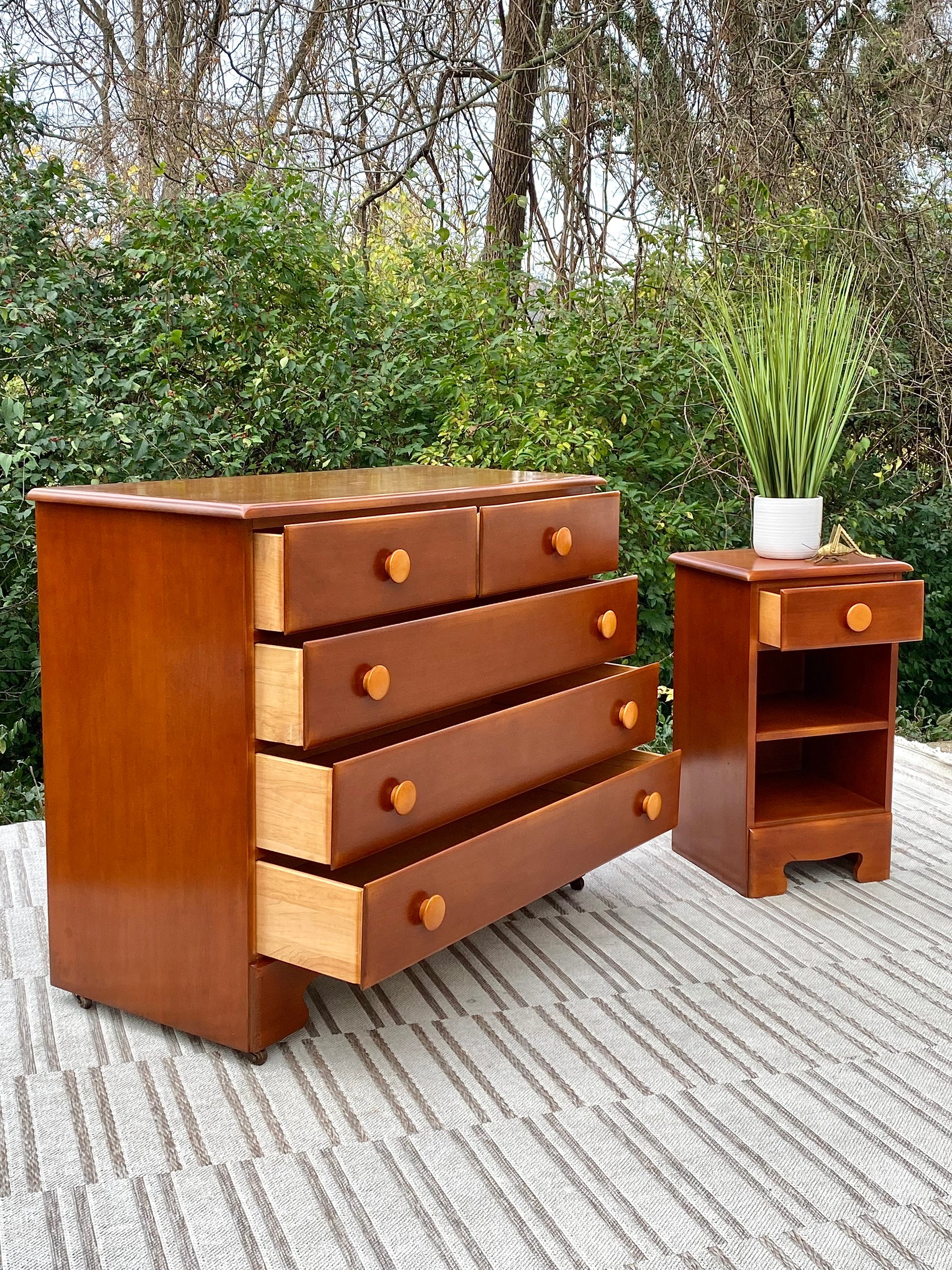 SOLD - Newest arrival! 🧡🍁 Oh yeah, we love this set too! A nice 2 tone wooden 5 drawer Colchester dresser with matching nightstand from Vermont. Lots of great storage with a unique vibe. 36” x 44” x 19” Good condition