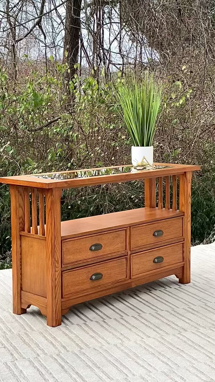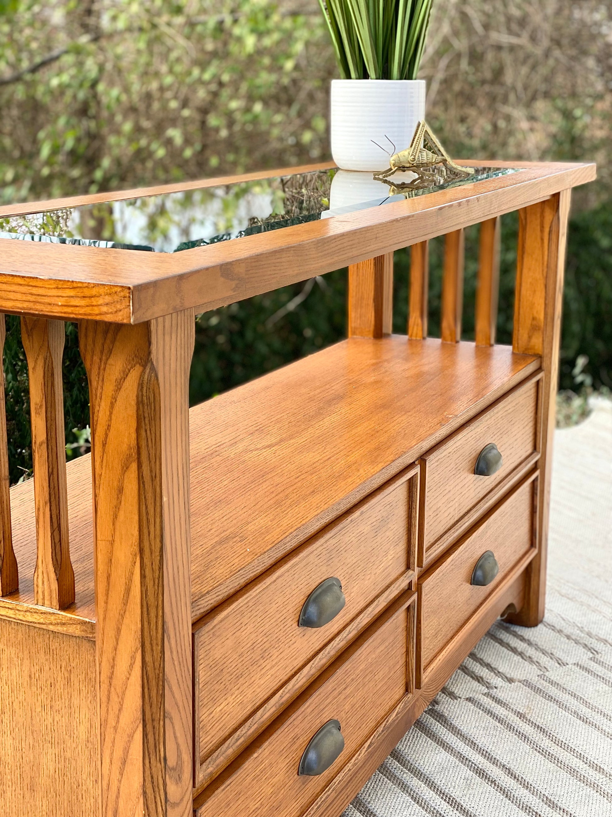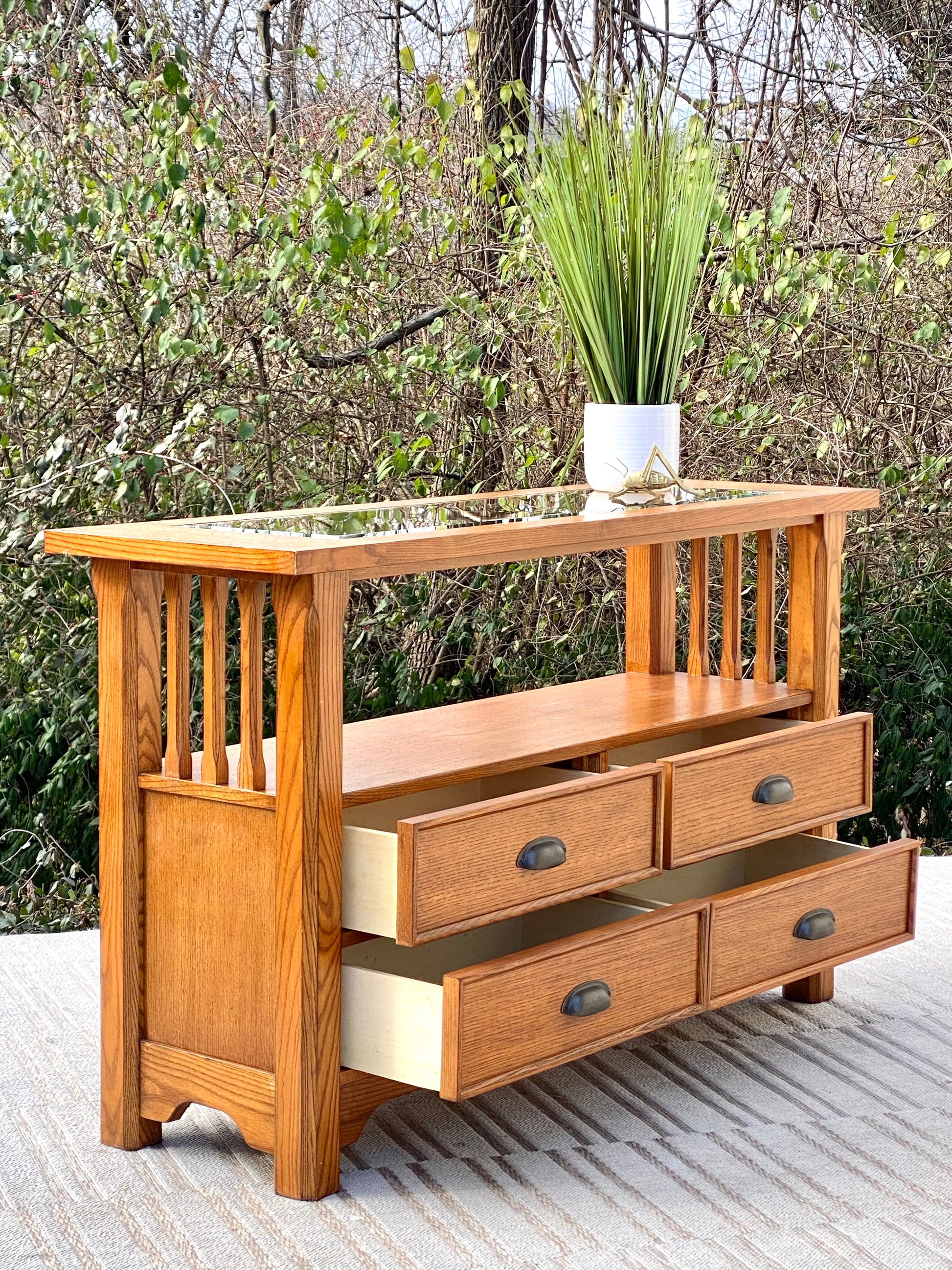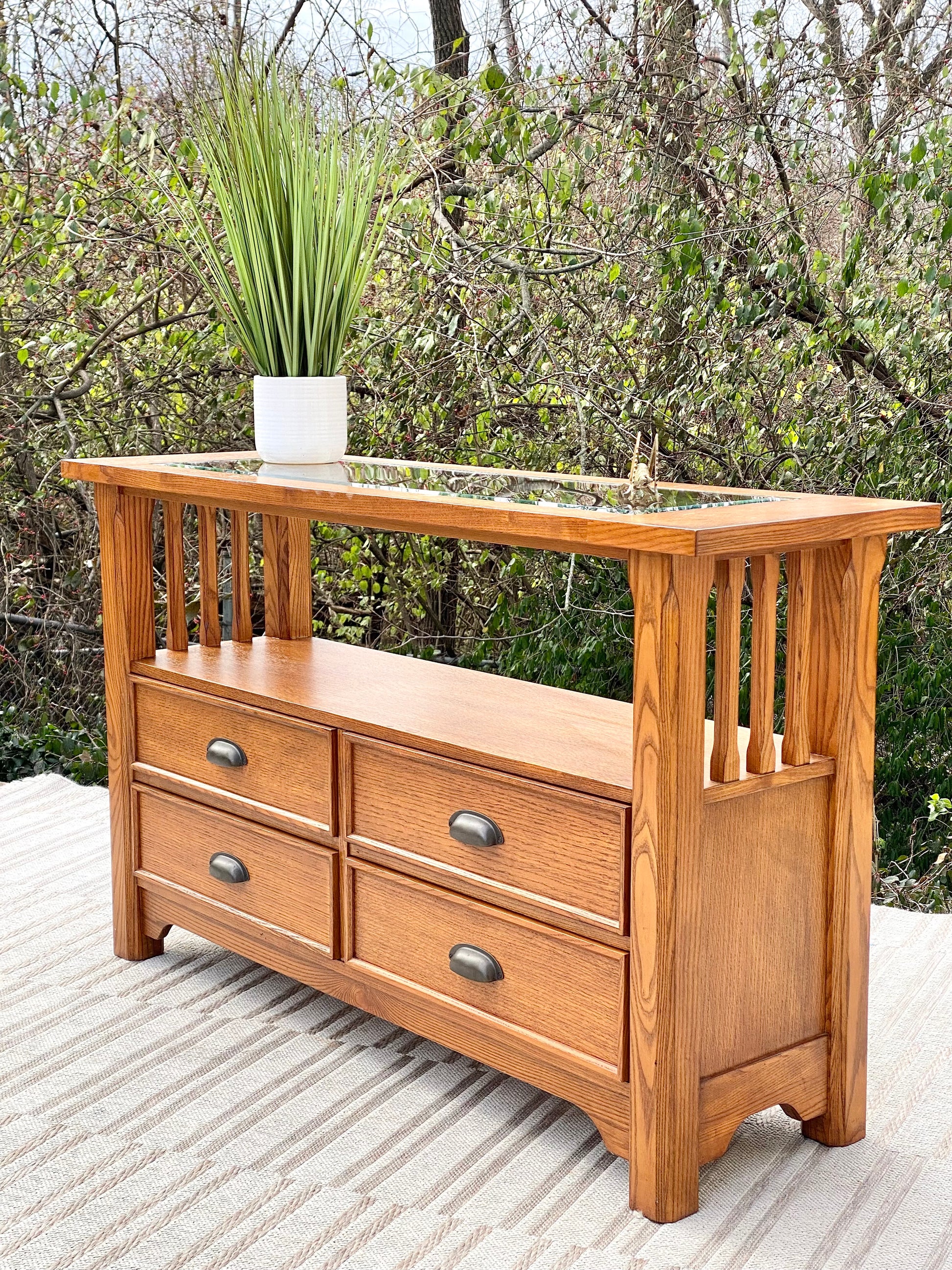 SOLD - Fresh find! ❄️❄️ Check out this nice modern oak sofa table hallway stand with a glass top and 4 lower storage drawers. 32” x 54” x 17” Good condition