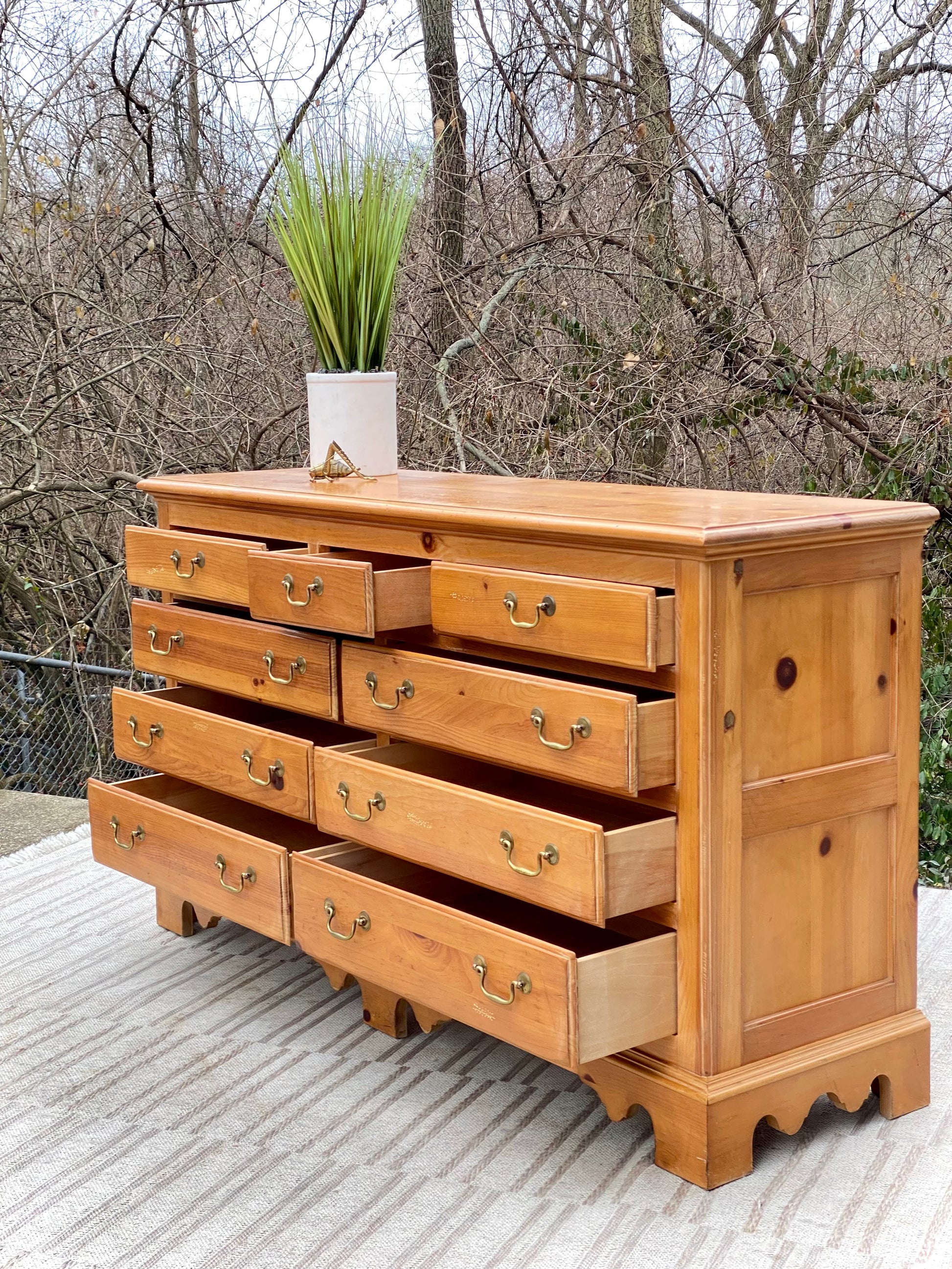 SOLD - Fresh find! ❄️🍁 Check out this beautiful solid pine nine drawer lowboy dresser. Sturdy wooden construction with ample space and original brass poles. A great extra piece with a warm vibe! 37”h x 64” x 19” Good condition