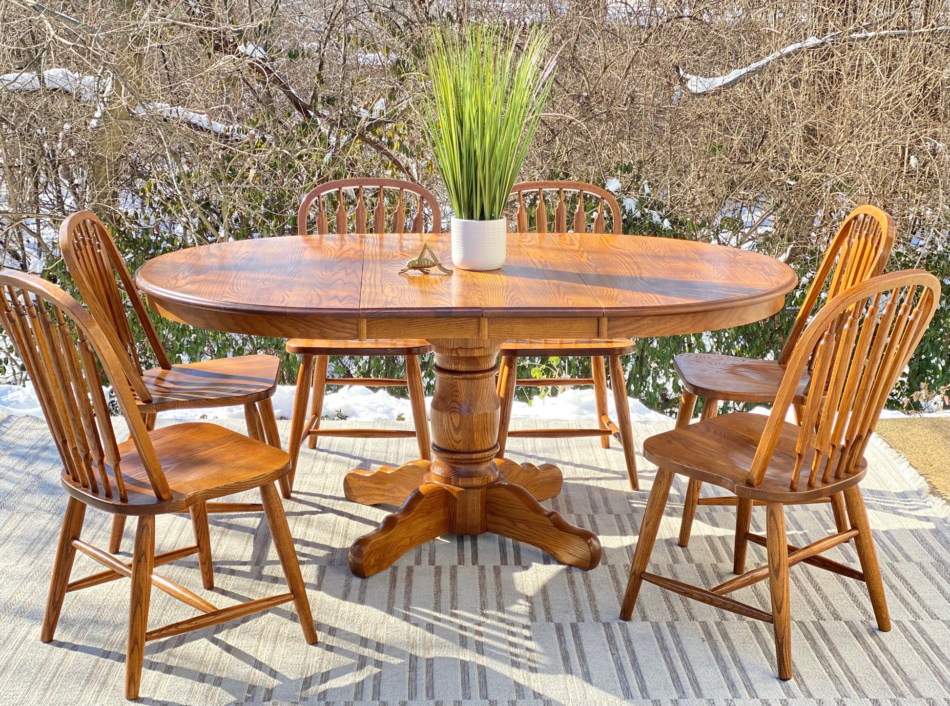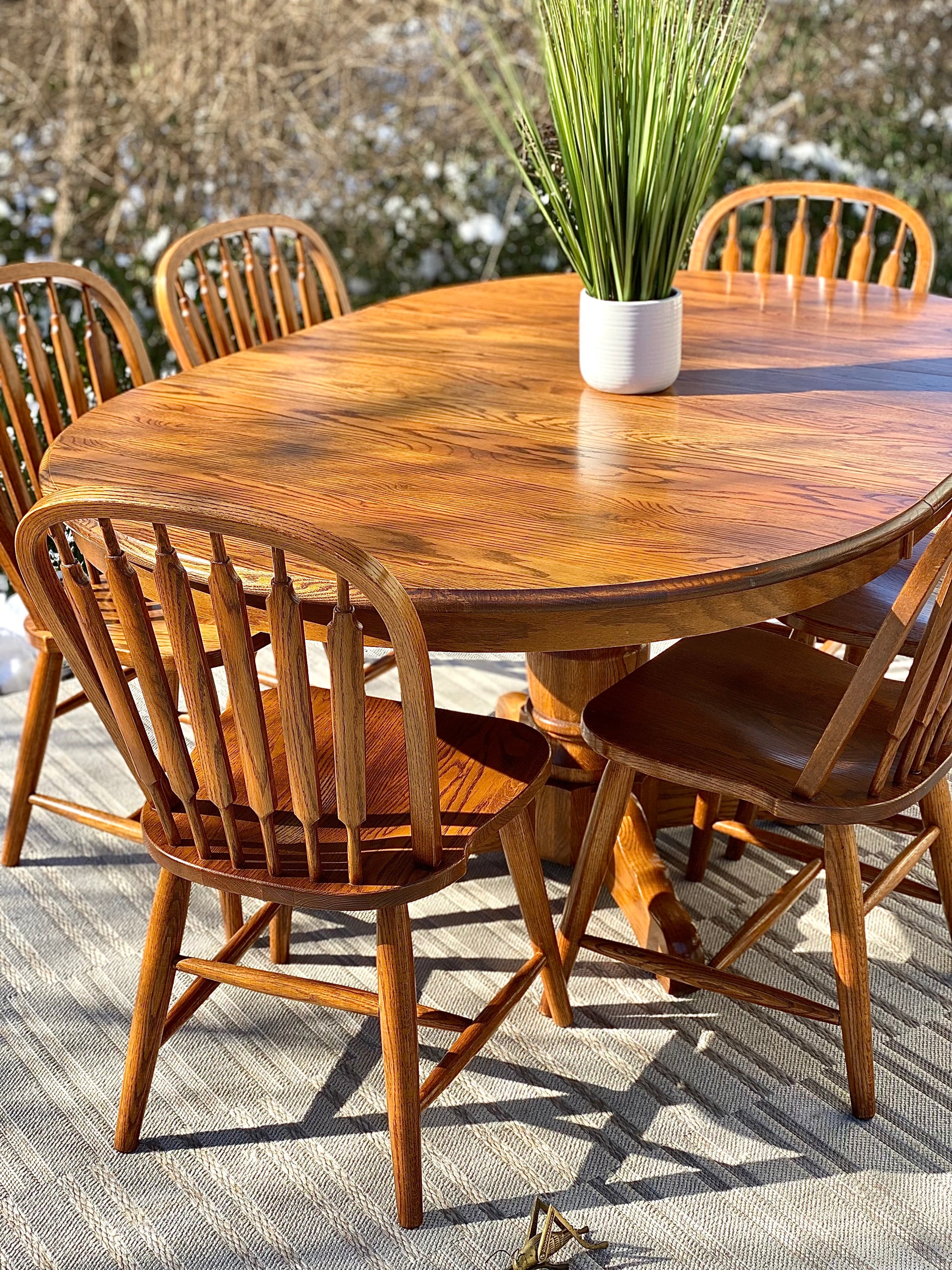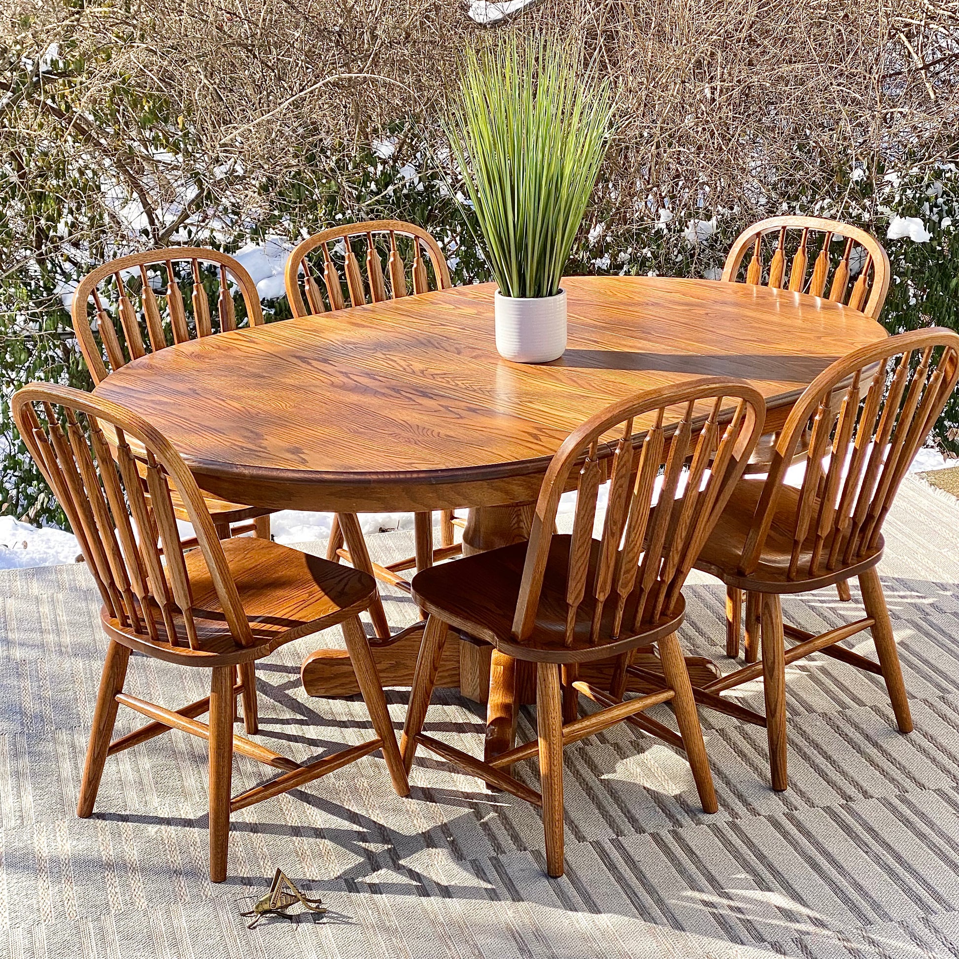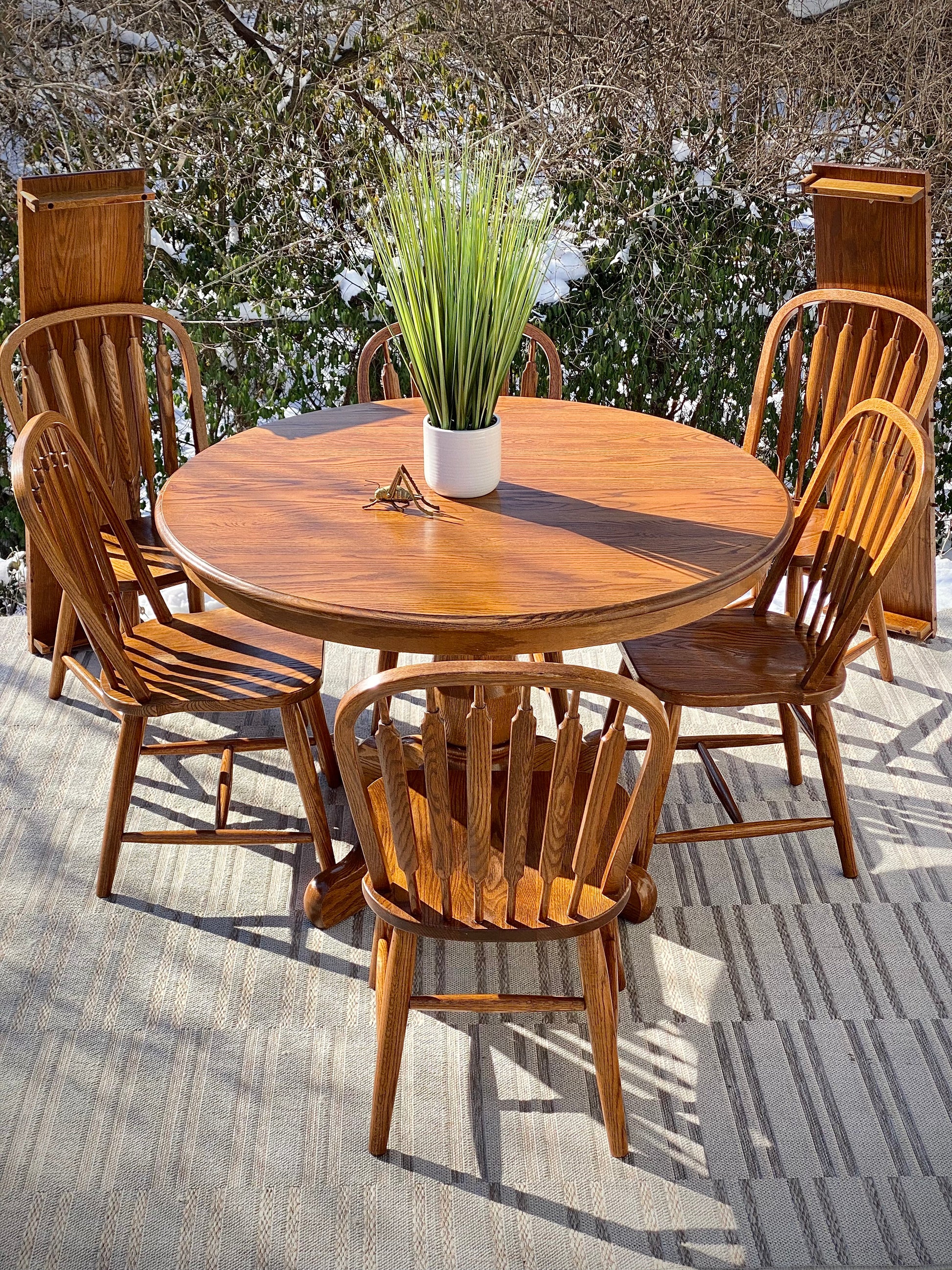 SOLD - Fresh find! ❄️❄️ Check out this nice Richardson, brothers, solid wood table with six solid wood chairs. Medium stain and overall great vibe. Made in the USA. The table comes with two leaves. 30” x 69”w x 47” with the leaves. Good condition.