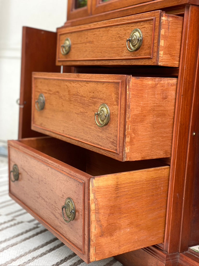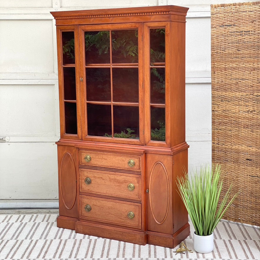 SOLD - Beautiful vintage Federal style hutch with glass front door. Comes with 2 inside shelves, three drawers and two side doors for more storage. Super attractive piece with lots of character. 76" x 42" x 15". Good condition