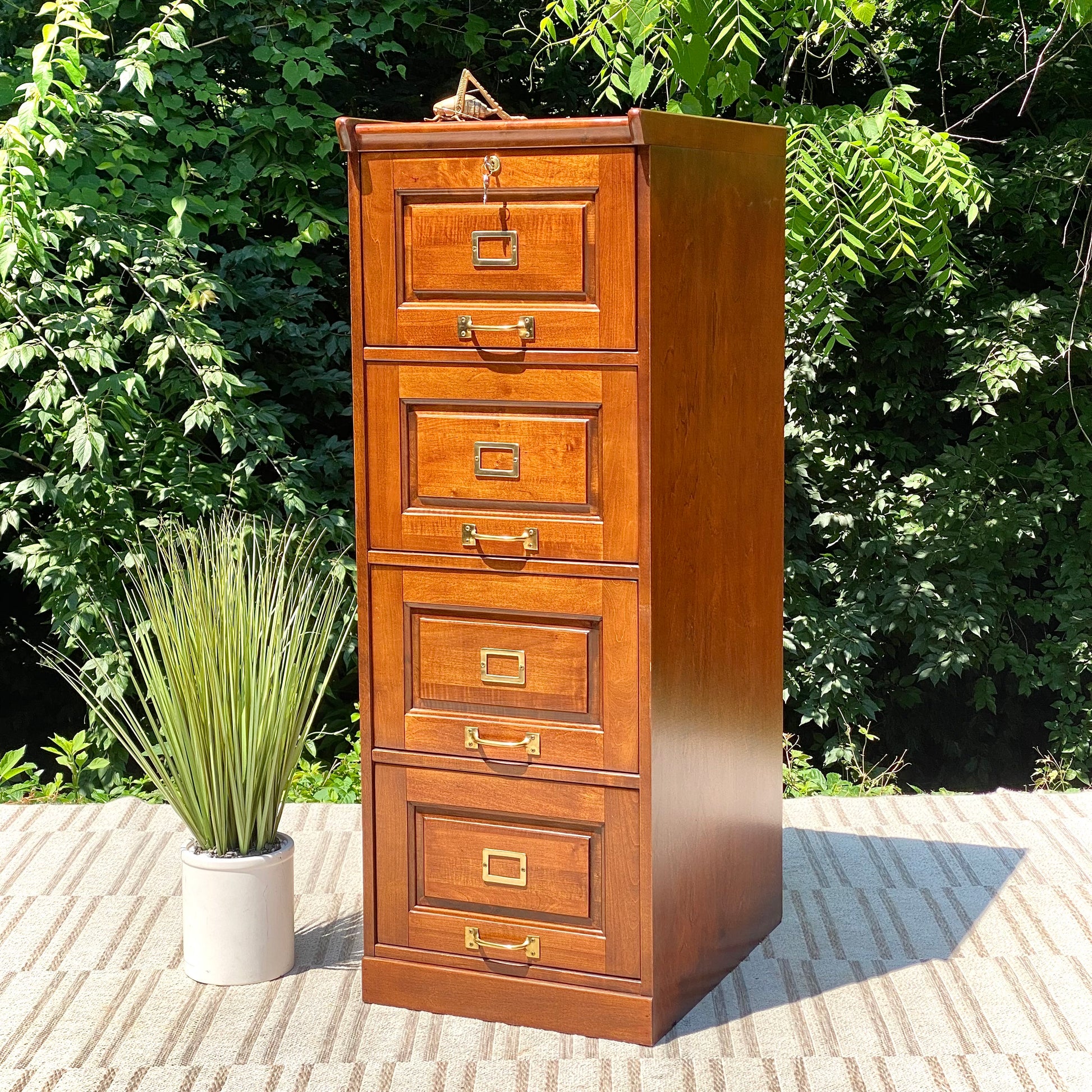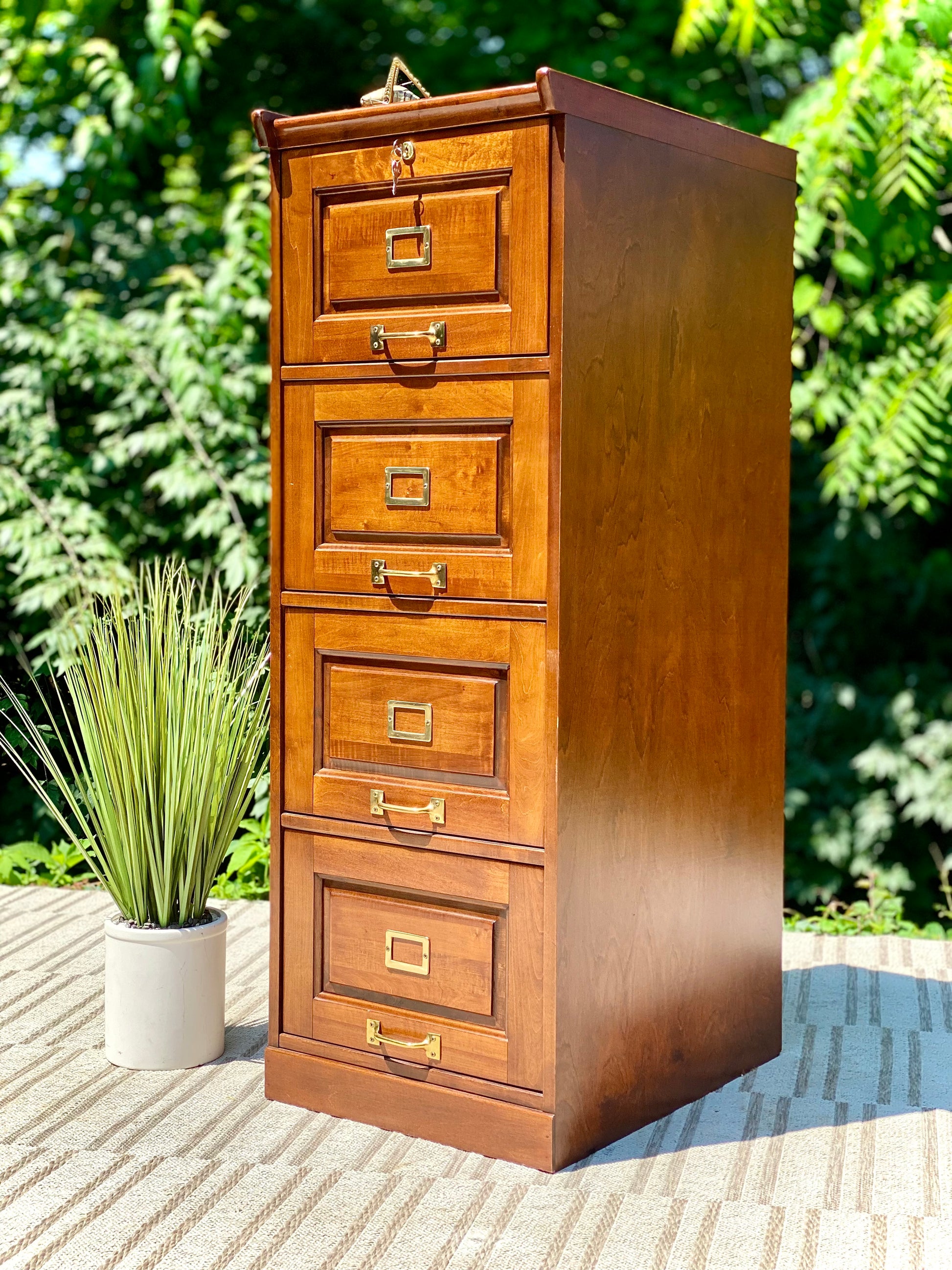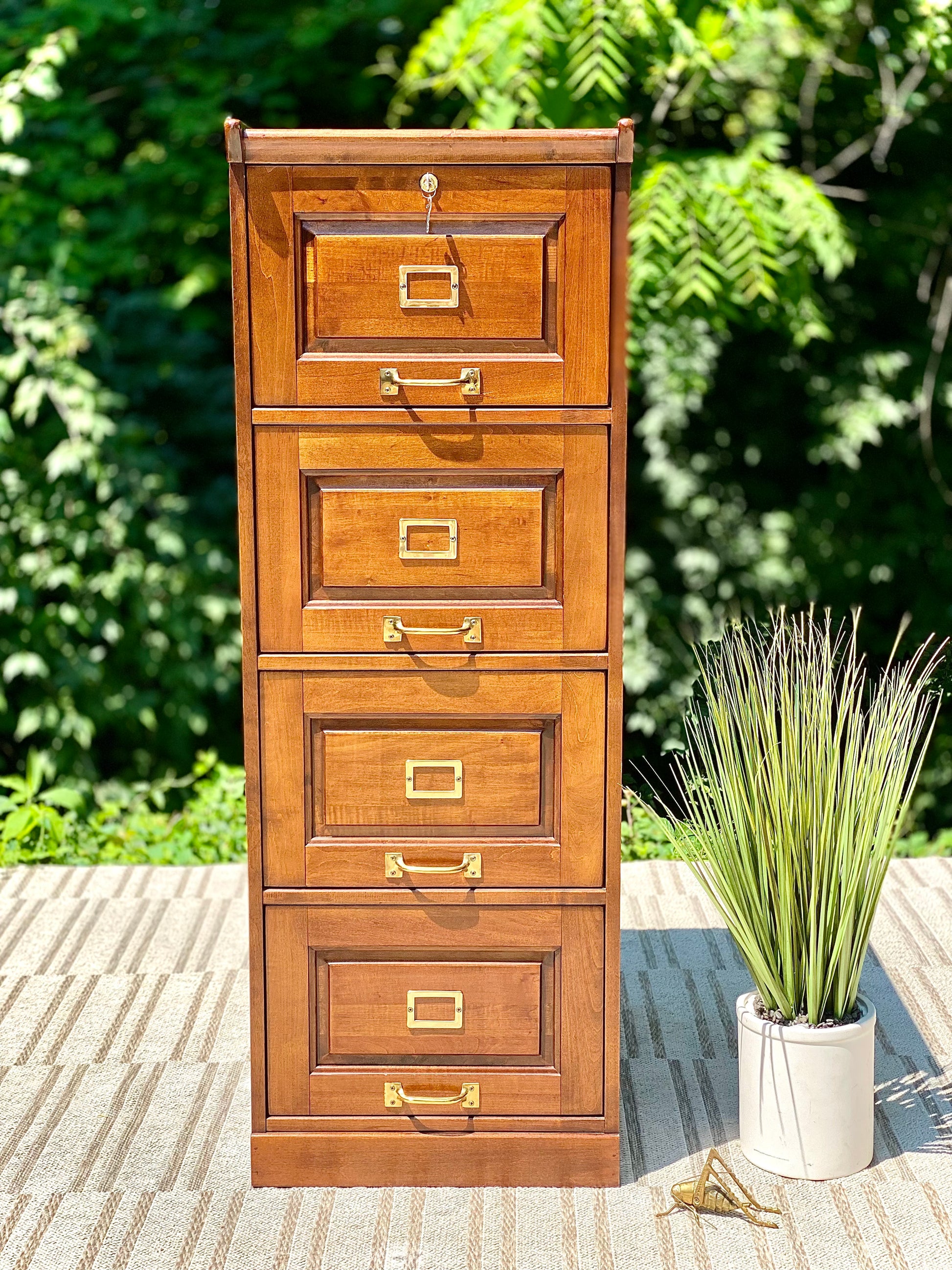 SOLD - New arrival! 🪴🌱 We love the look of this wooden four drawer filing cabinet. Nice classic design and comes with a key. 52” x 19” x 26” Good condition