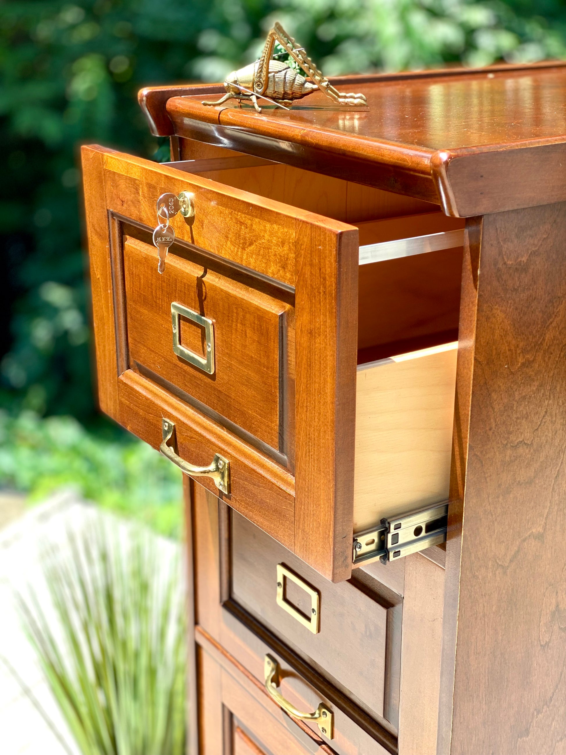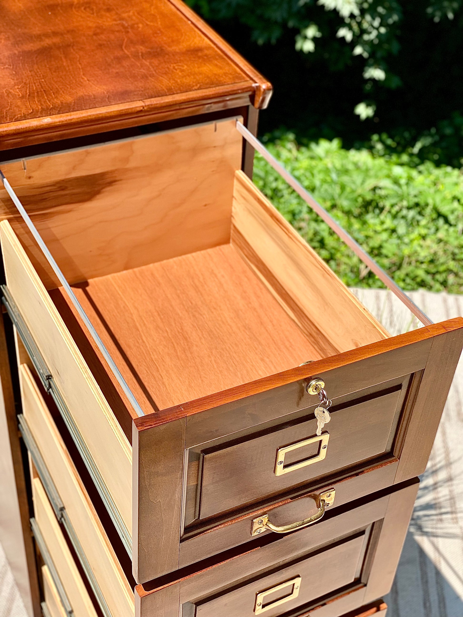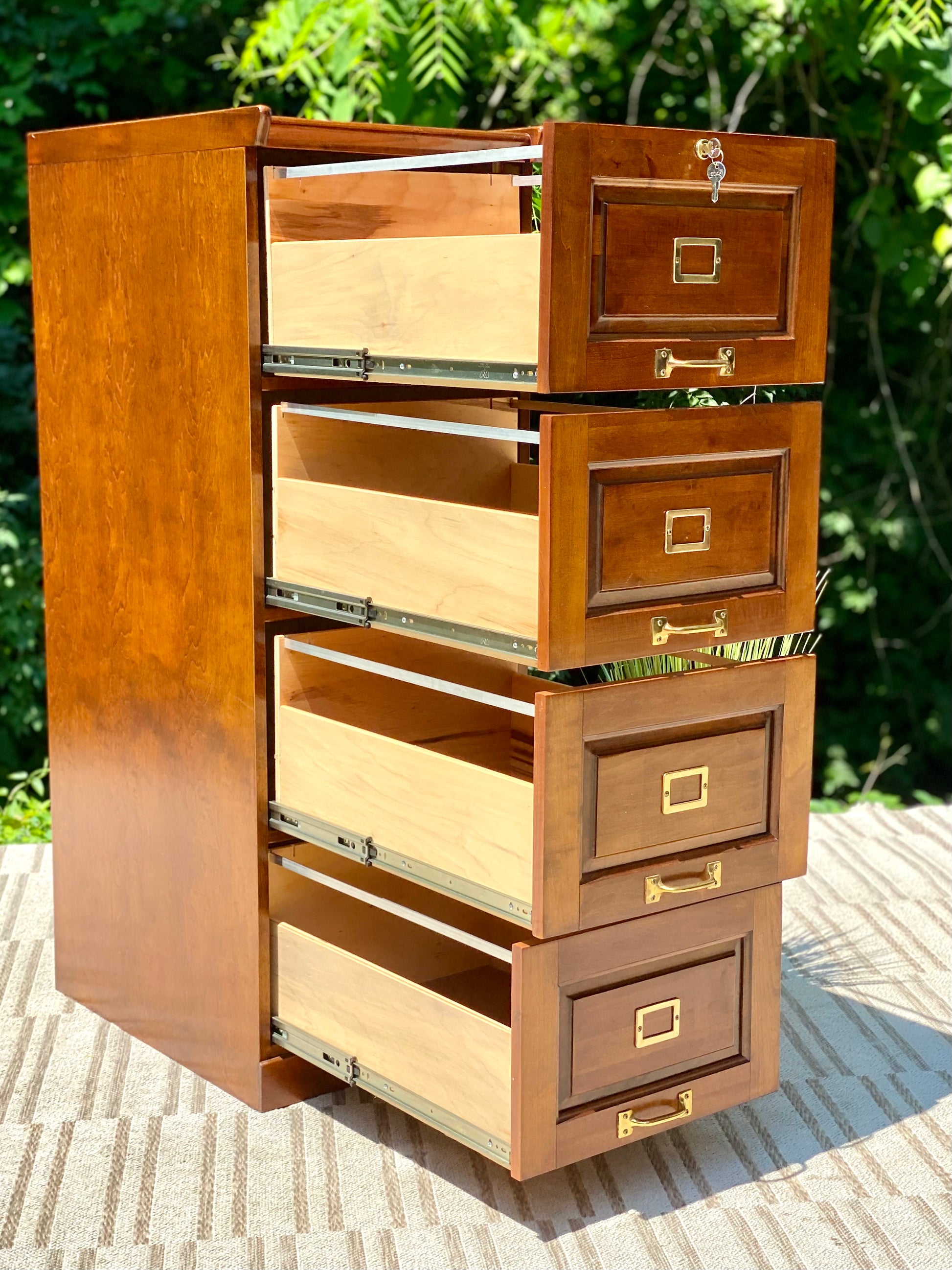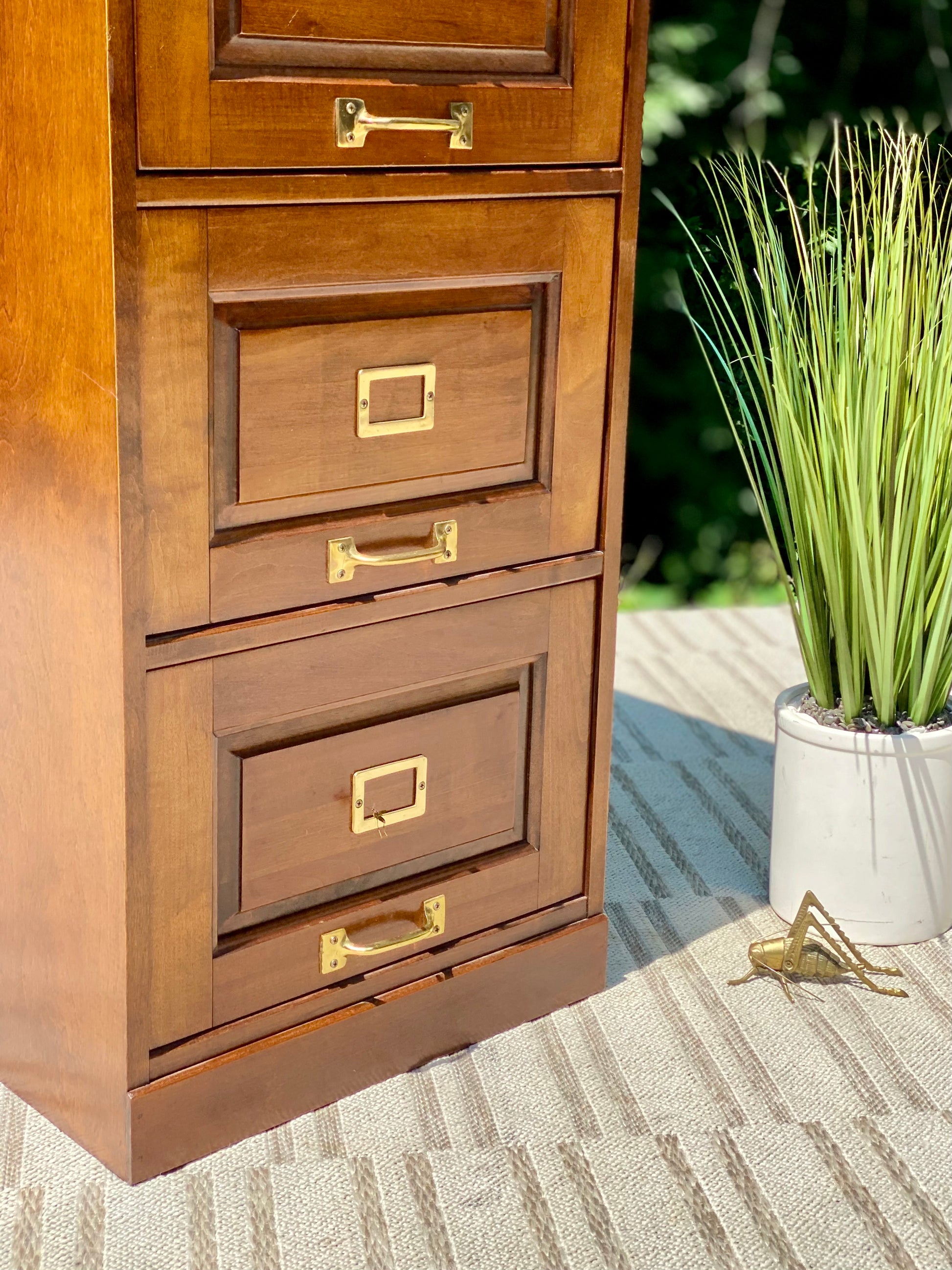 SOLD - New arrival! 🪴🌱 We love the look of this wooden four drawer filing cabinet. Nice classic design and comes with a key. 52” x 19” x 26” Good condition