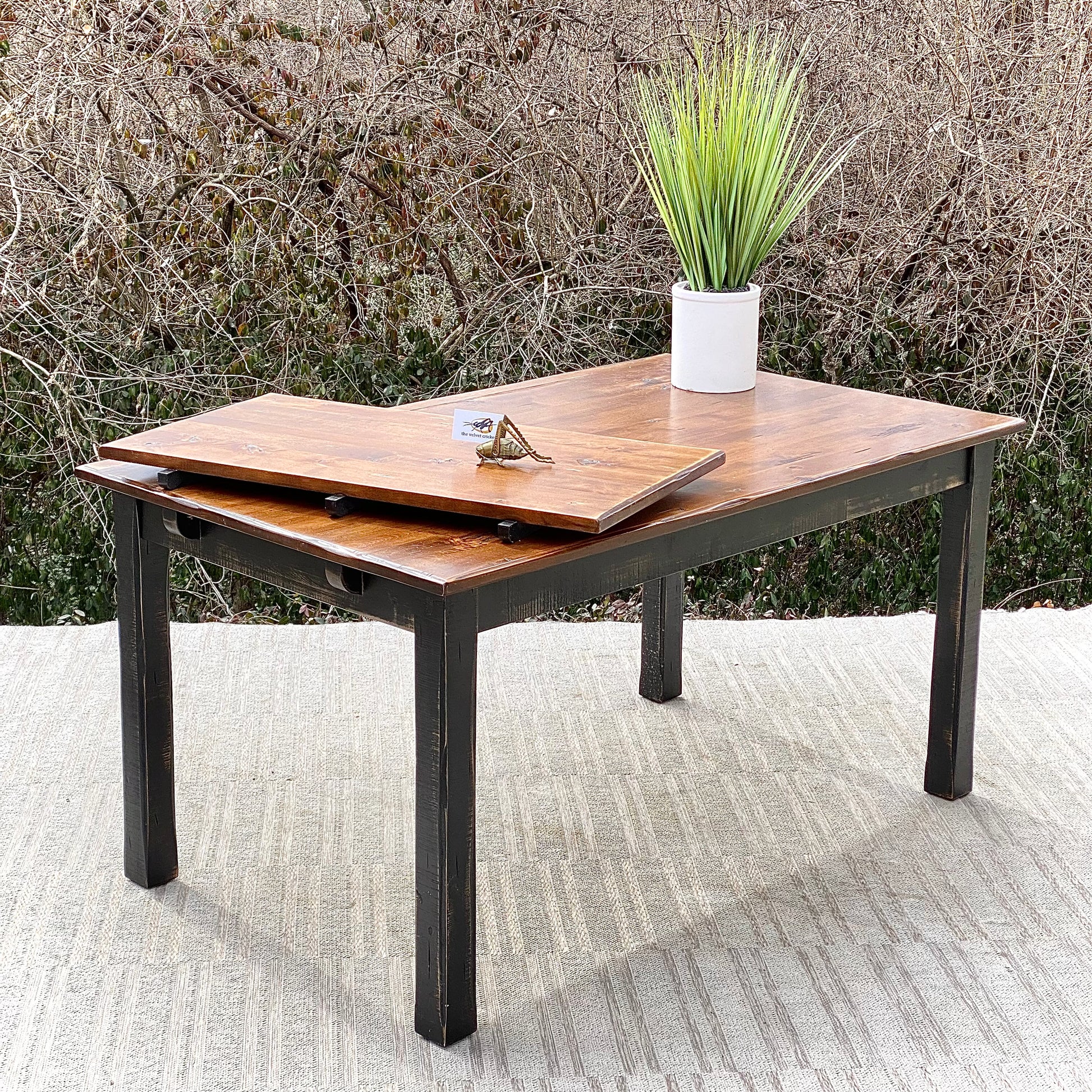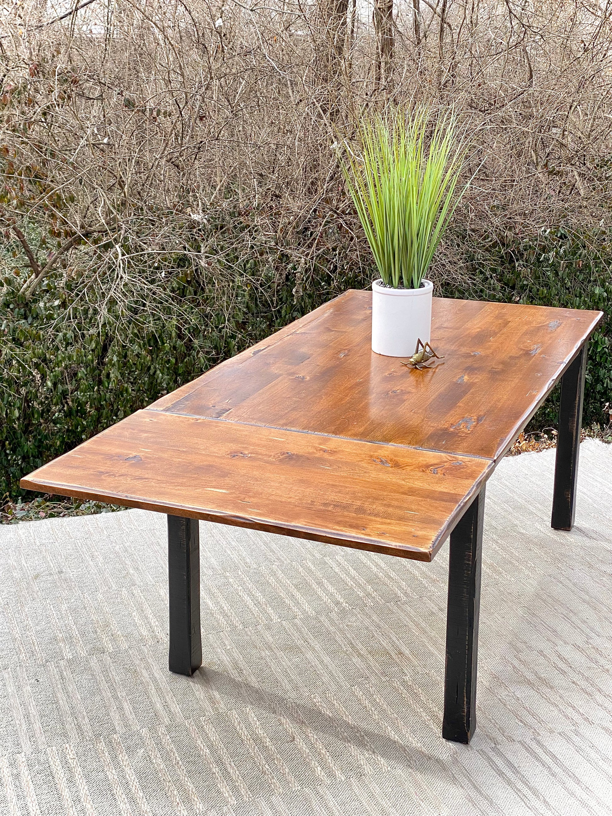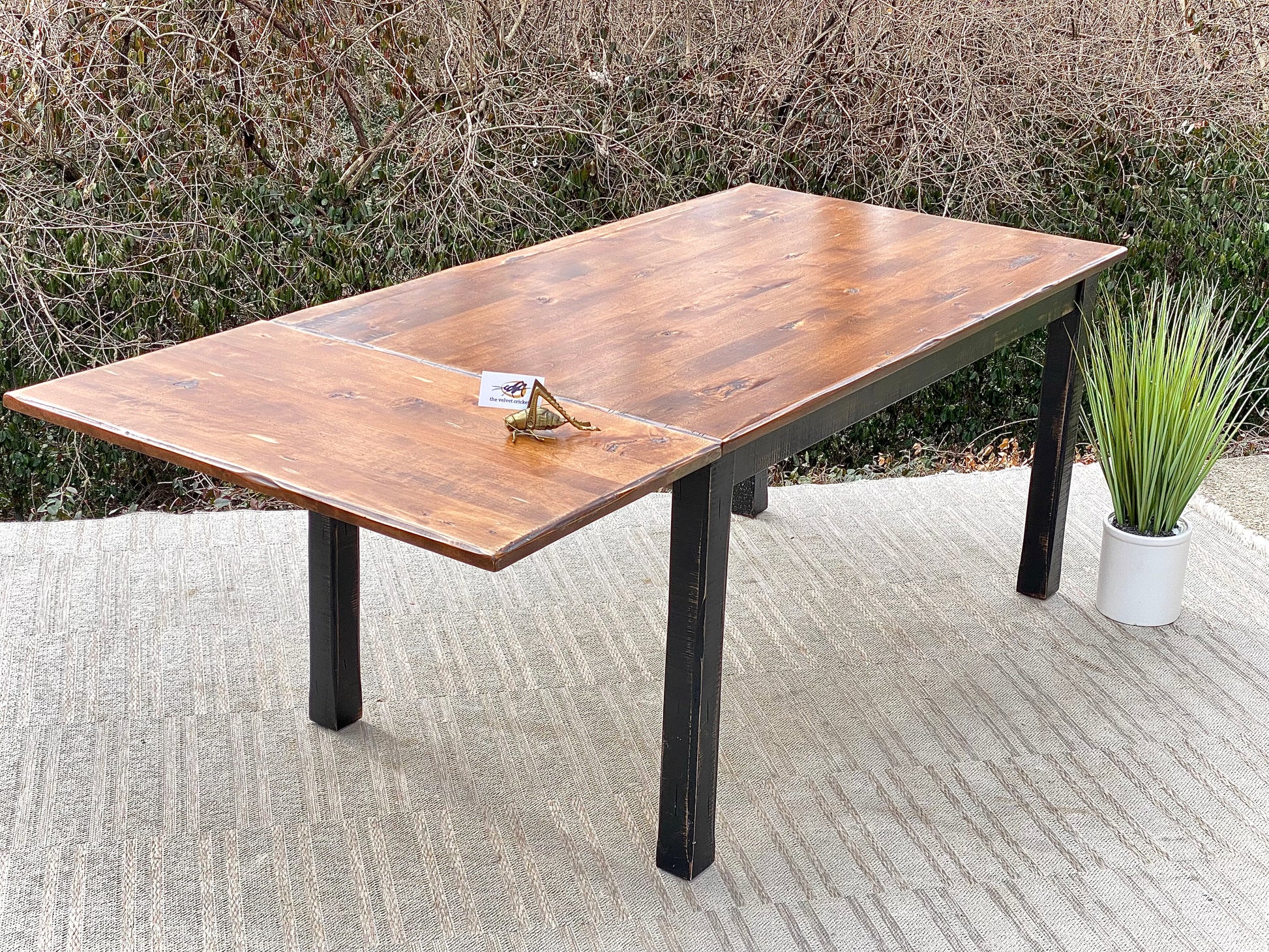 Fresh find! 🍁❄️ We love the distressed vibe of this wooden Canadel dining table with leaf. Sturdy construction and ready to use. 30”h x 60”/80” x 36” Good condition