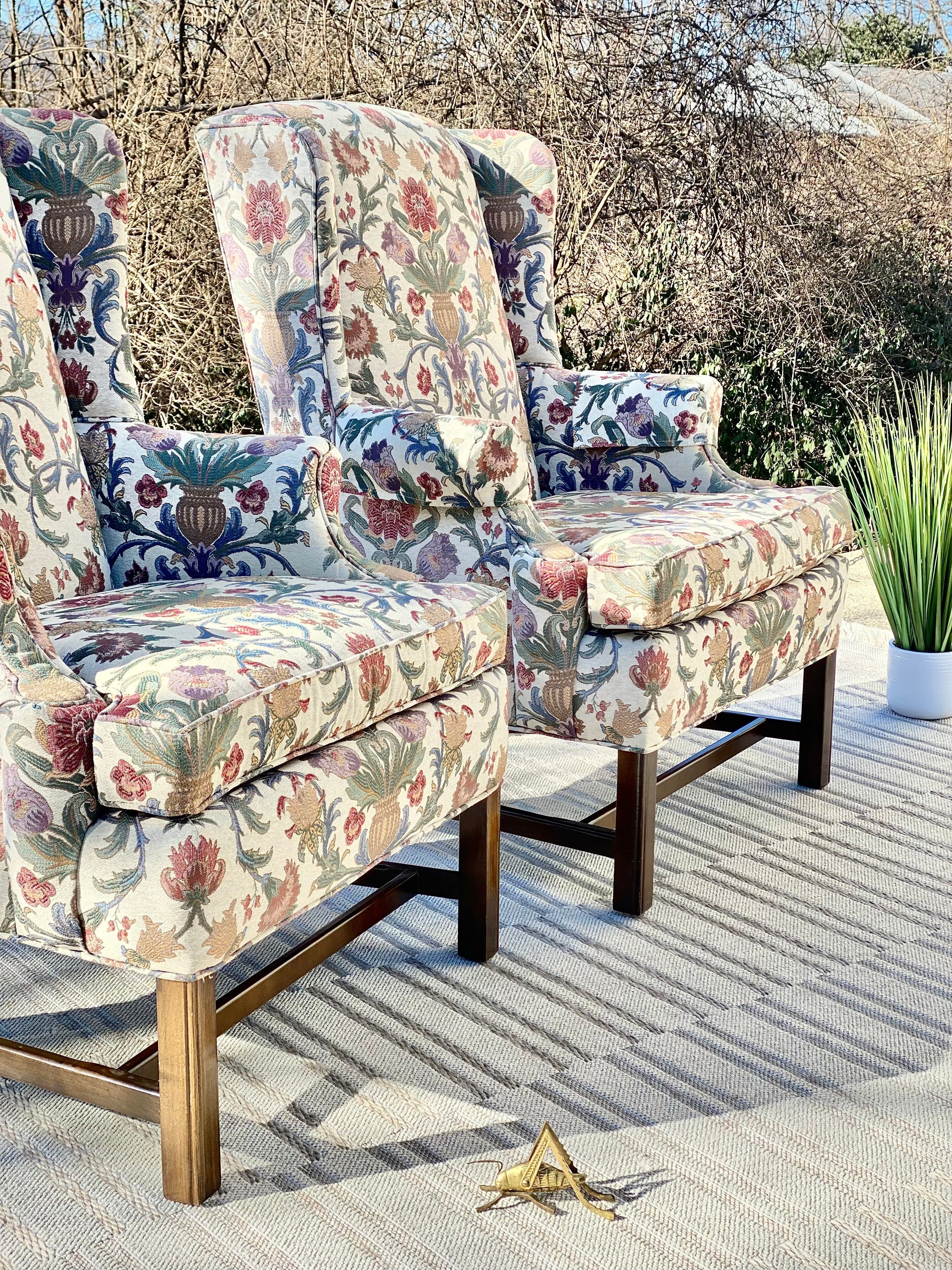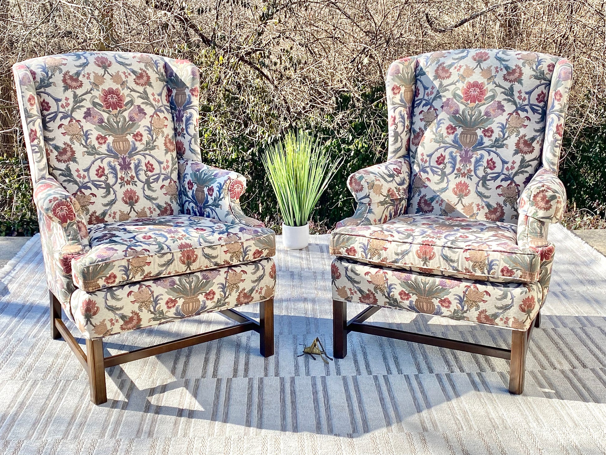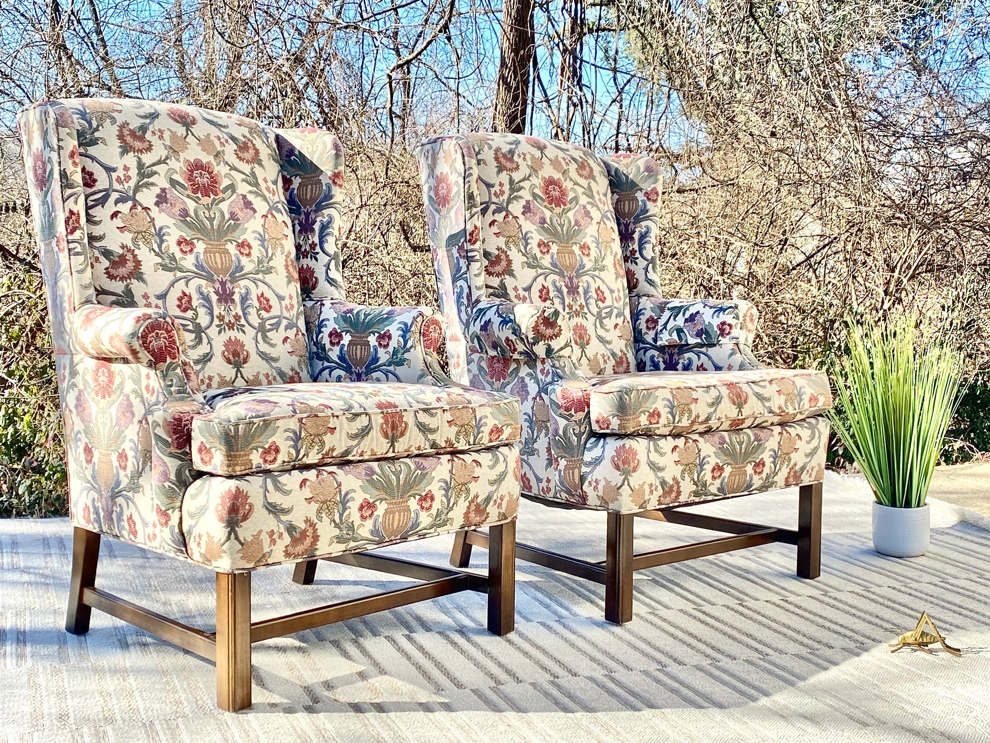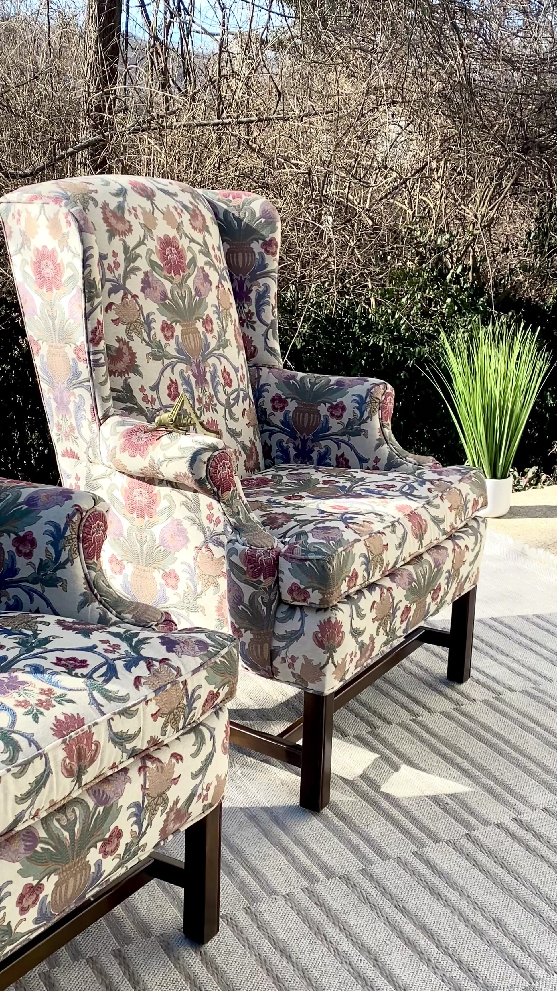 SOLD - New arrival! ❄️❄️ Check out this nice modern pair of upholstered wingback accent chairs. Great pattern design with vibrant colors and ready to place in your favorite spot. 44” x 30” x 31” Good condition