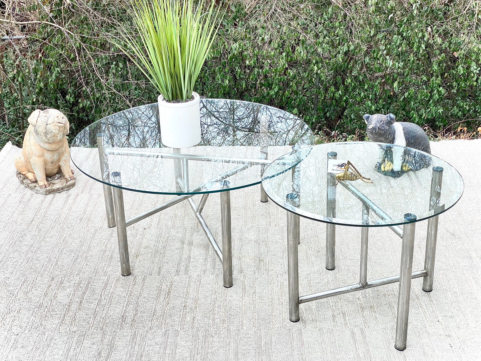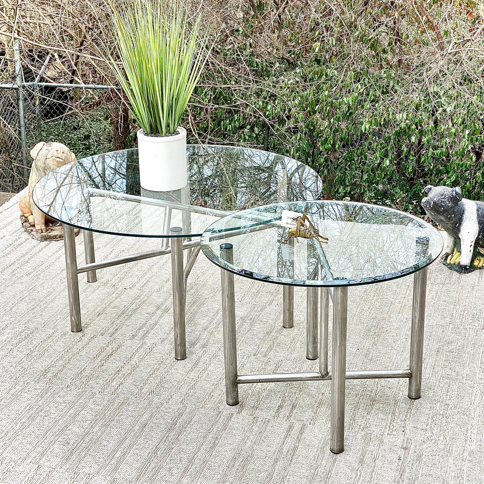 Fresh find! 🌱🪴 Check out this great pair of metal tubular base glass top tables. Nice pair with a great vibe! 19”h x 42”w and 21”h x 28”w Good condition