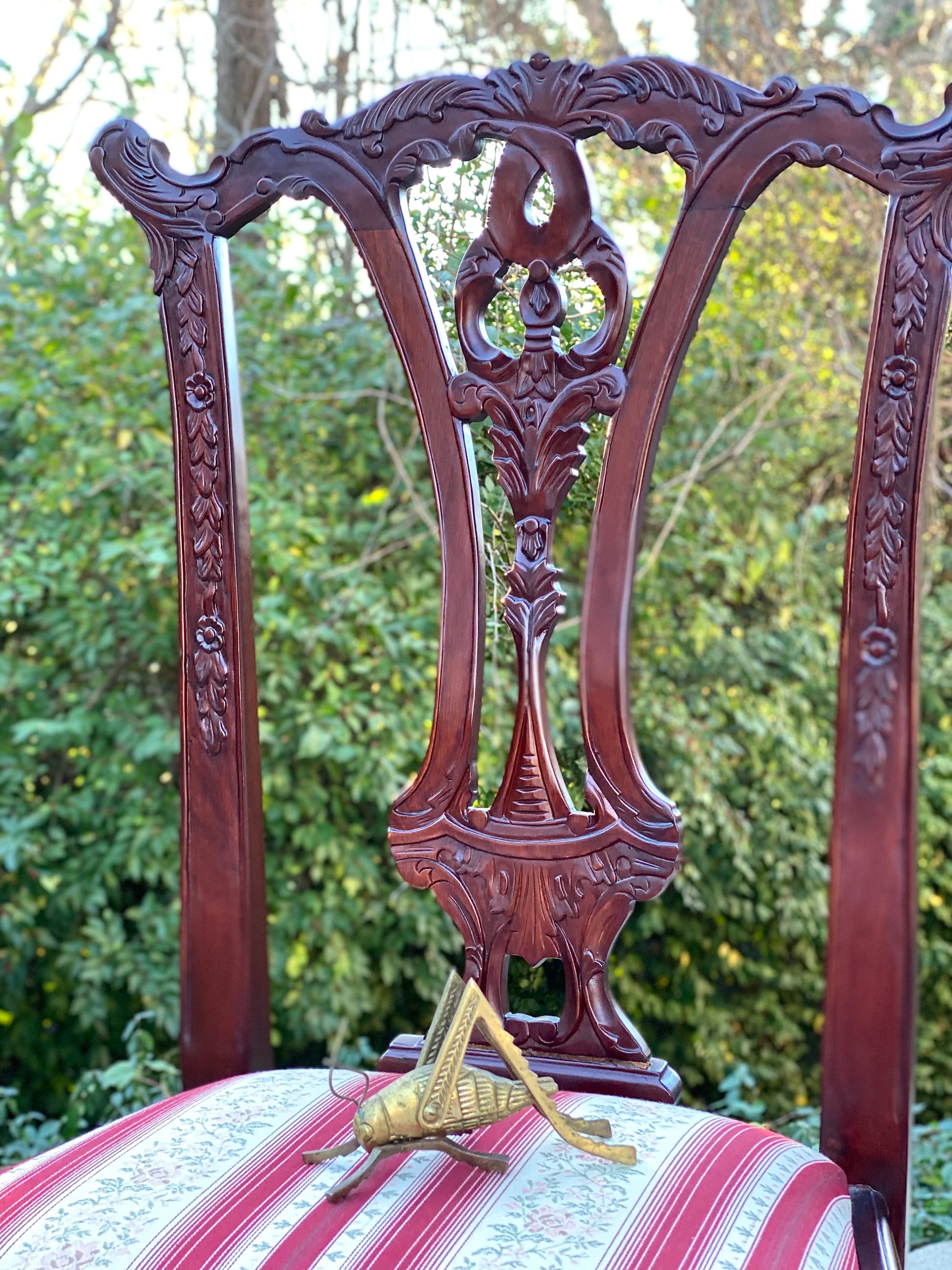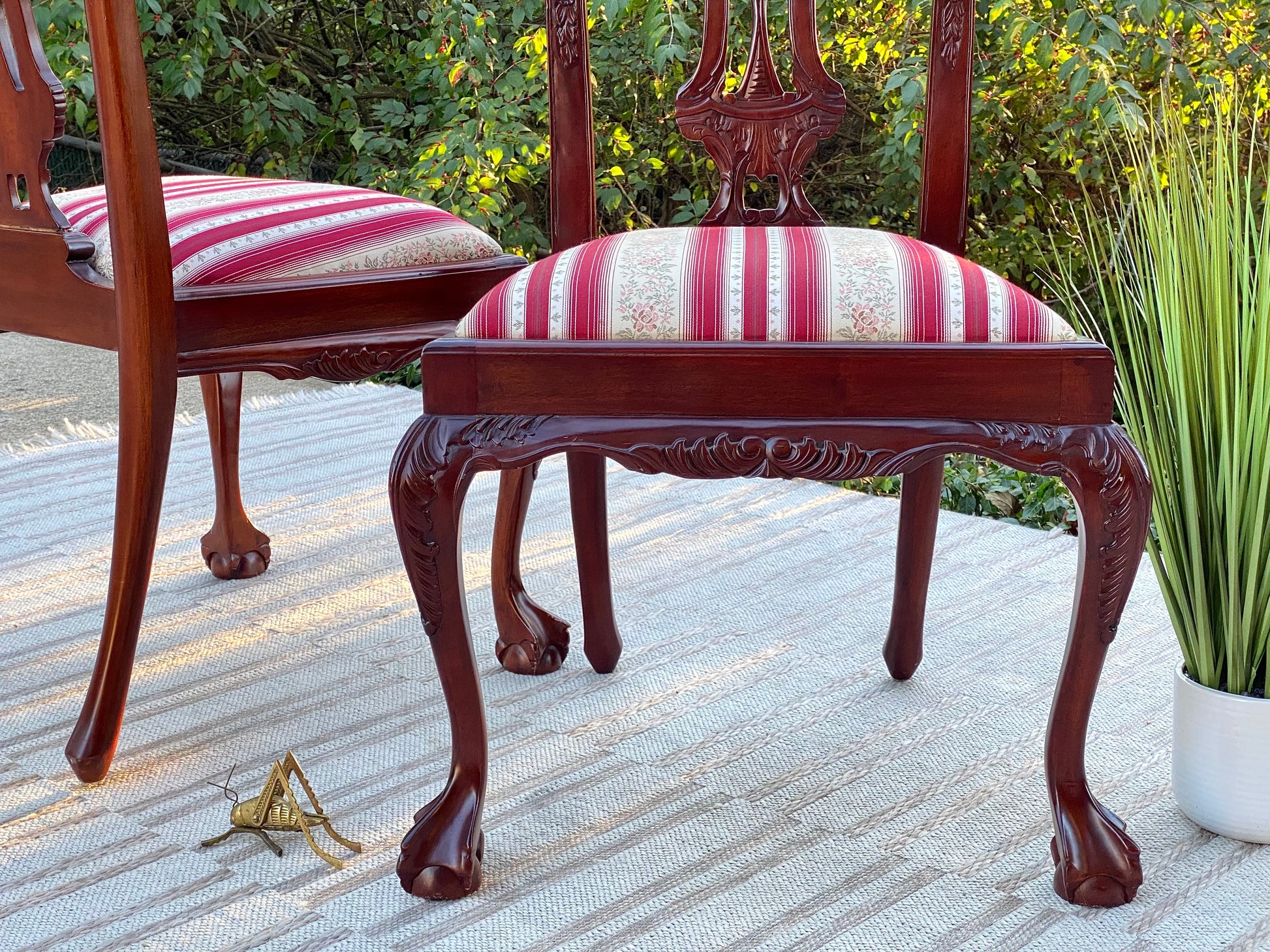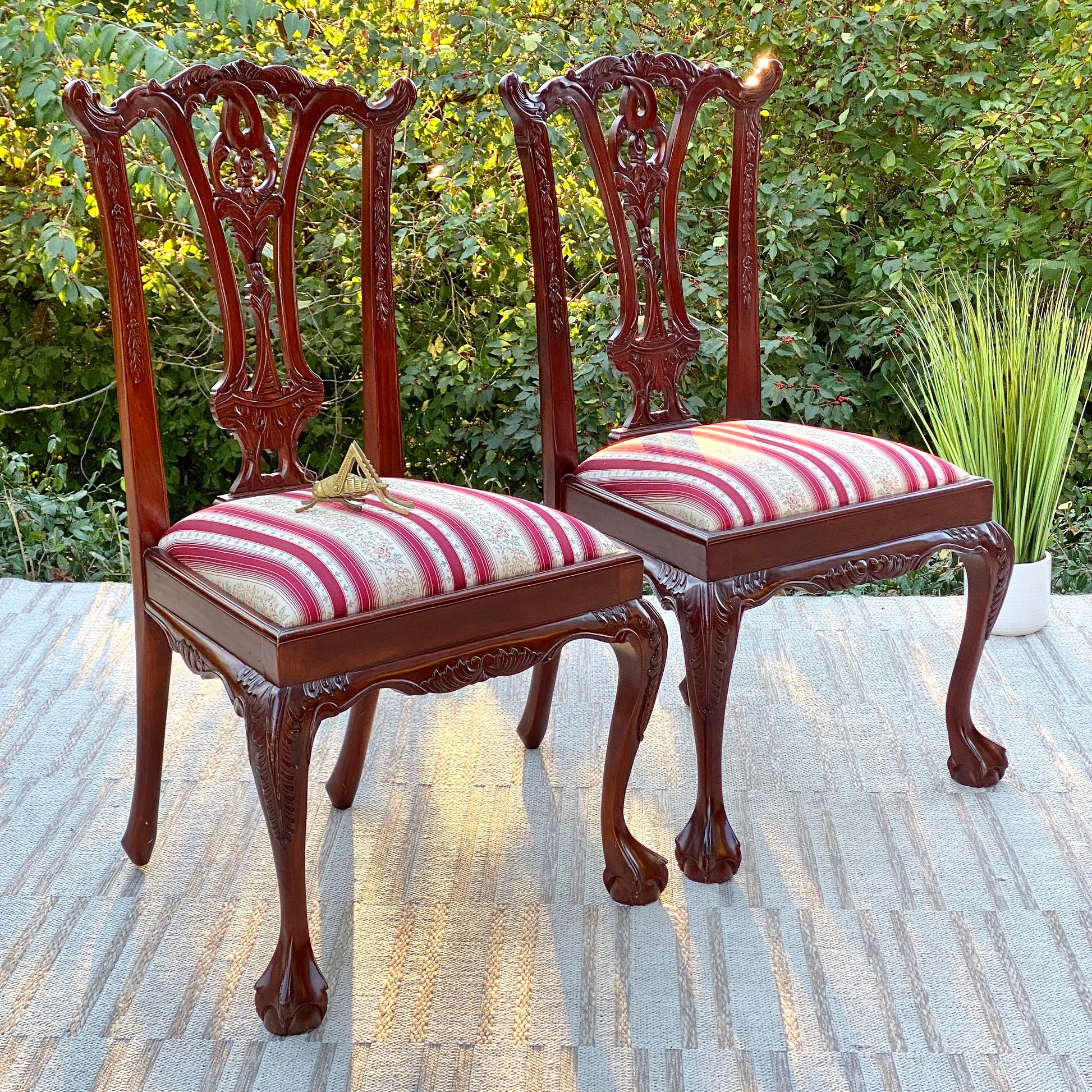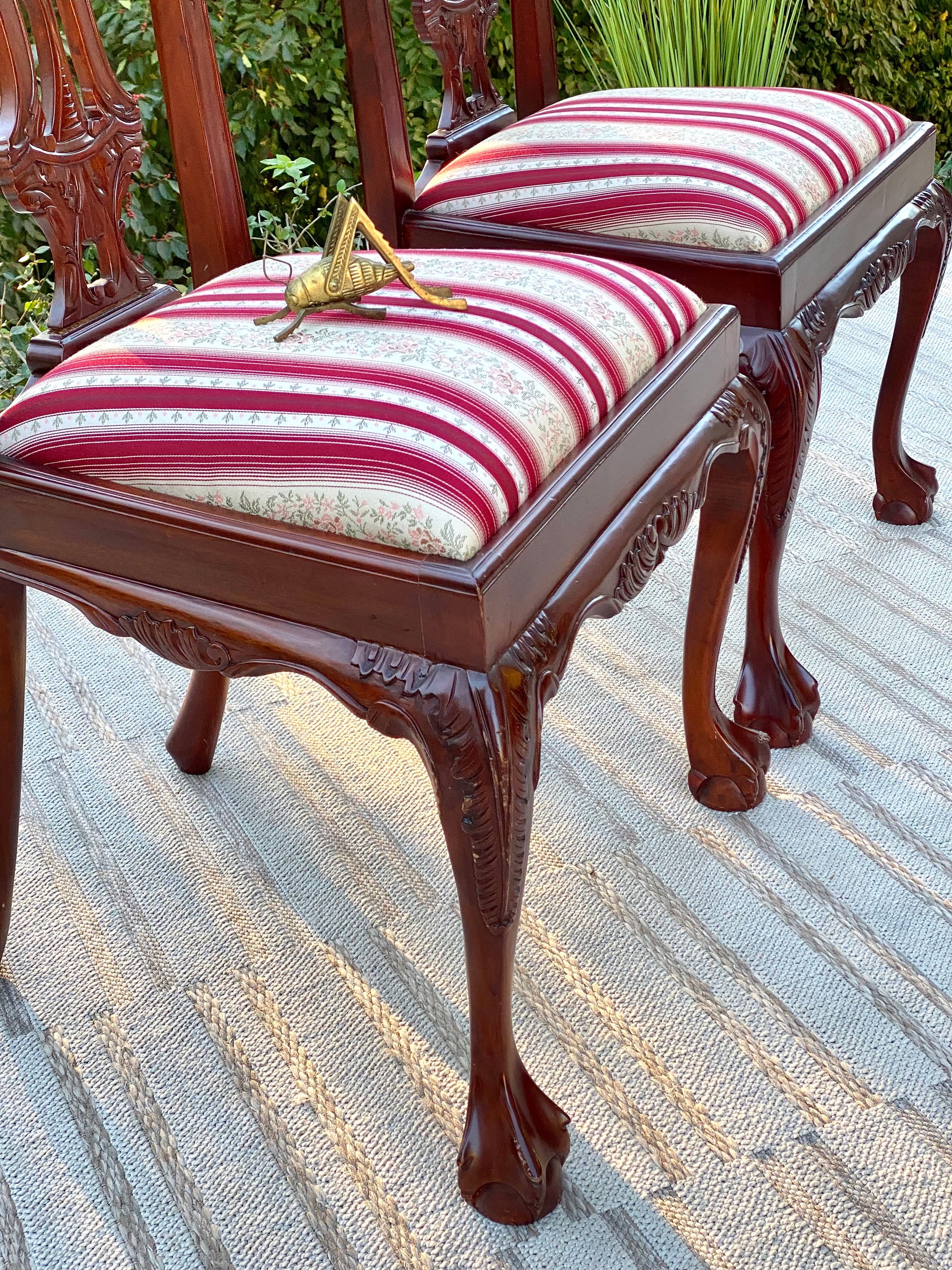 SOLD - Newest arrival! 🧡🍁 Check out this gorgeous pair of dark stained upholstered carved claw foot accent chairs. Beautiful vibe with a nice strike of color. 40” x 24” x 23” Good condition