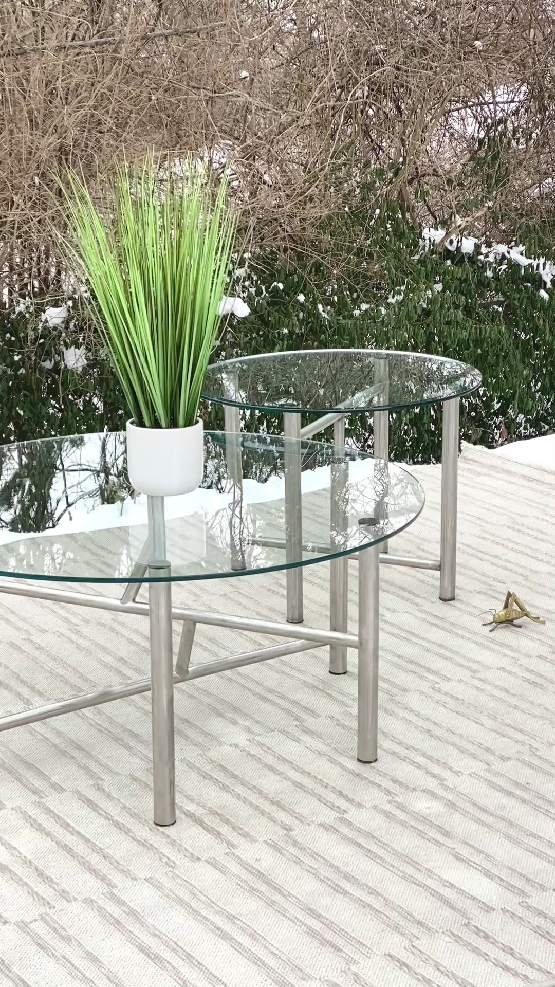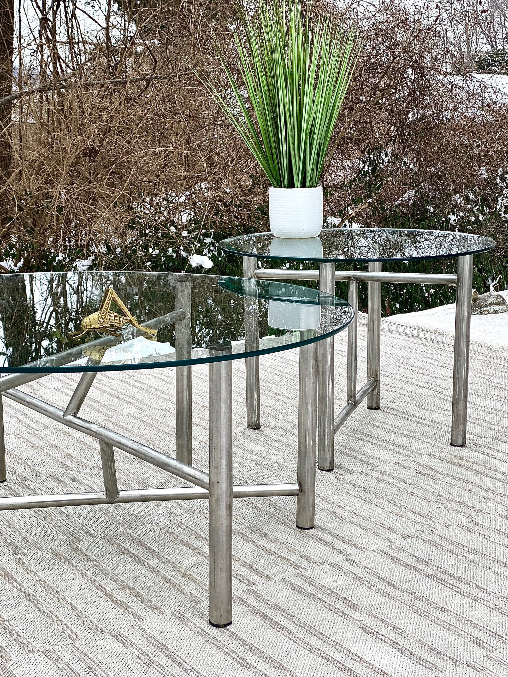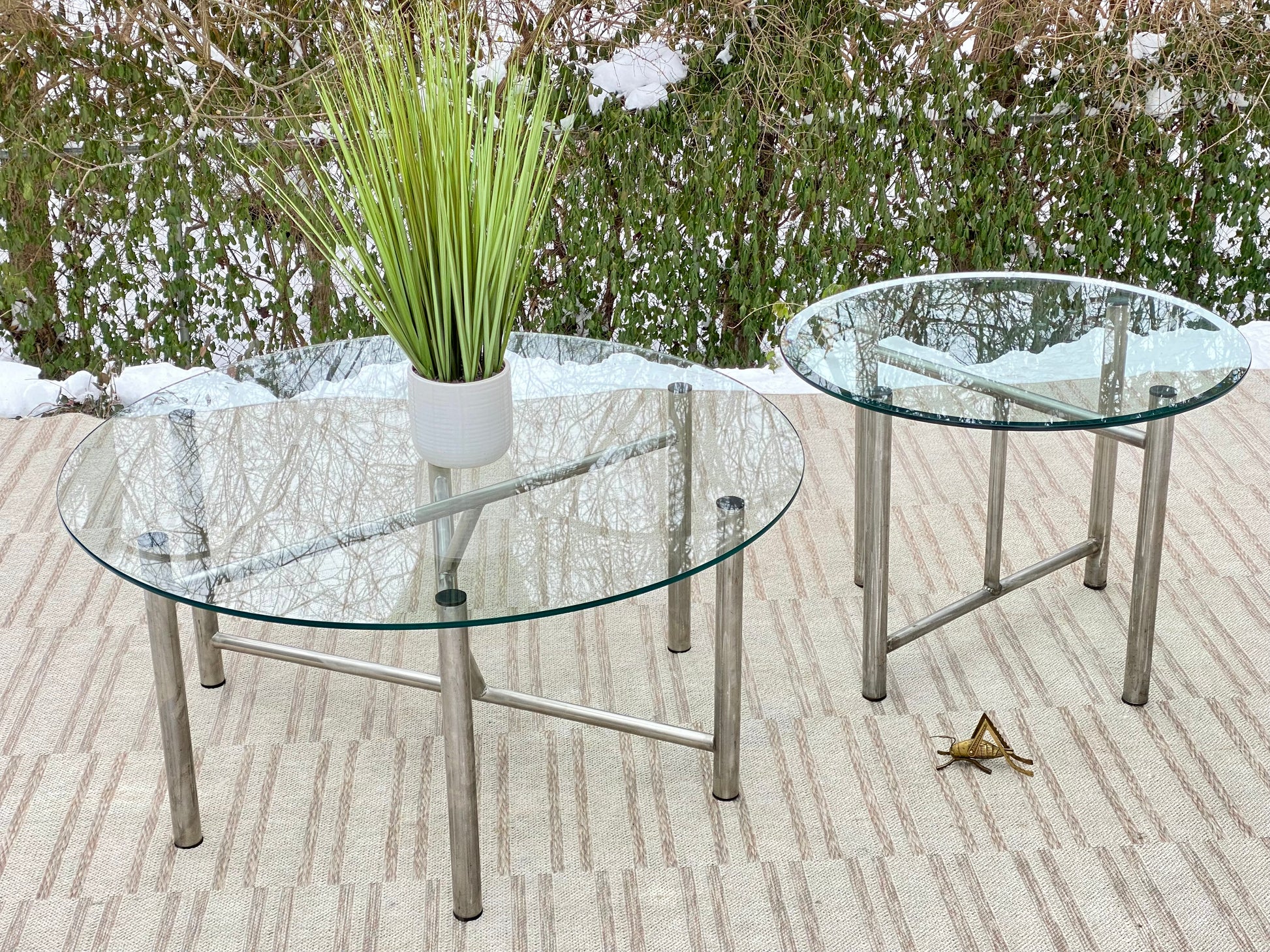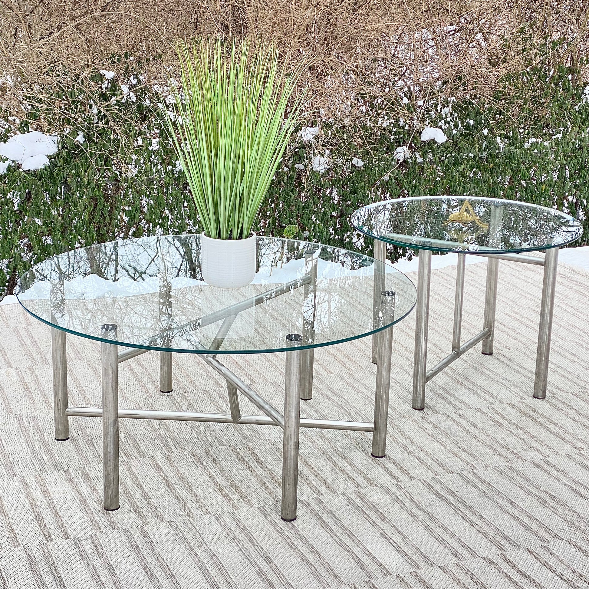 Fresh find! ❄️❄️ Check out this nice pair of metal tubular tables with round glass tops. Lots of different options for these two and a cool modern vibe. 42”w x 19”h and 28”w x 21”h. Good condition