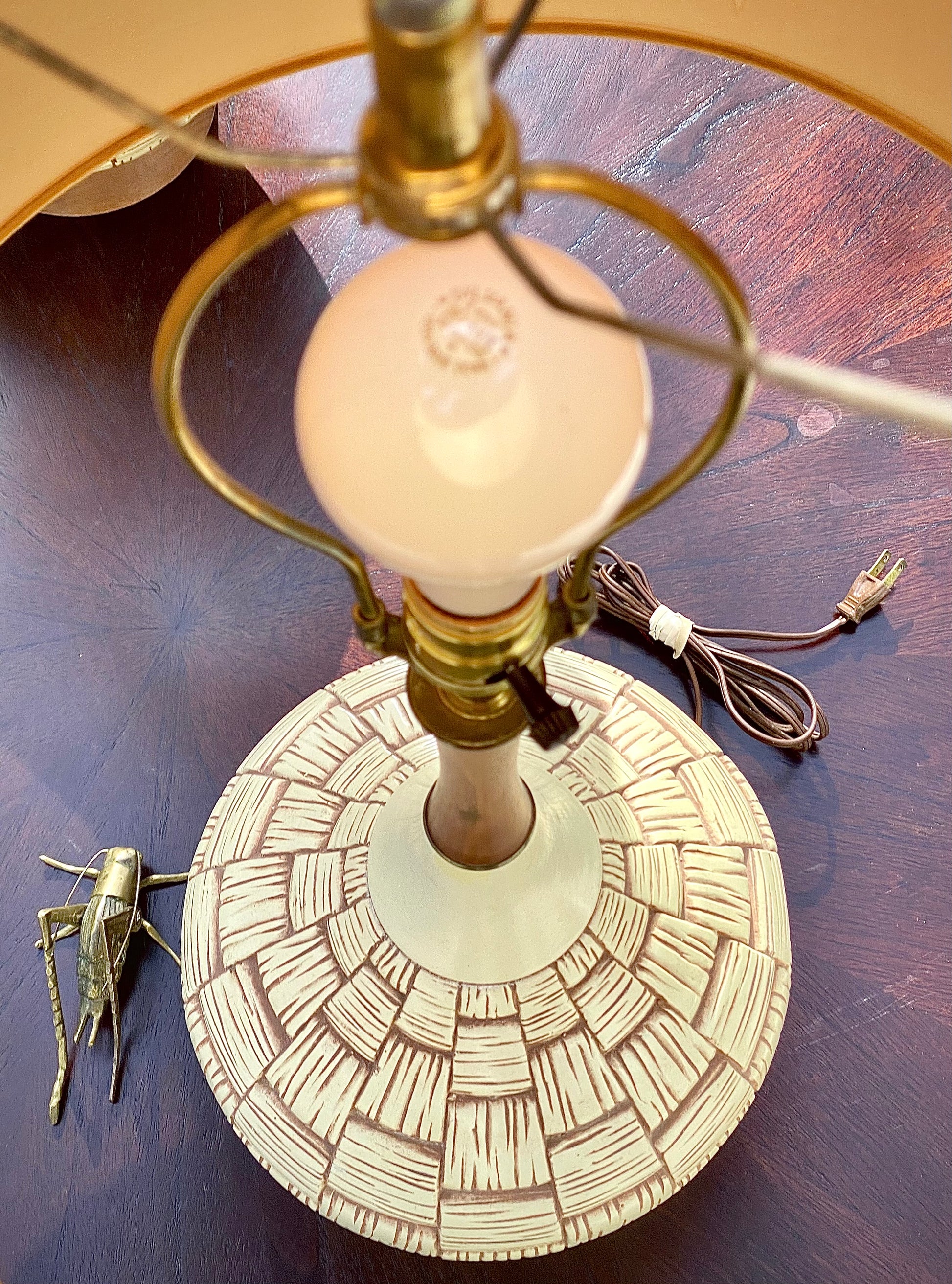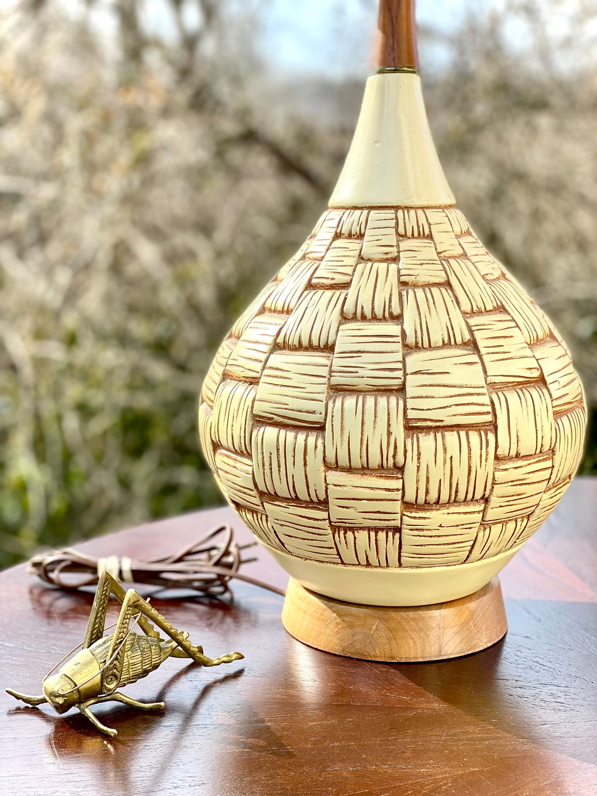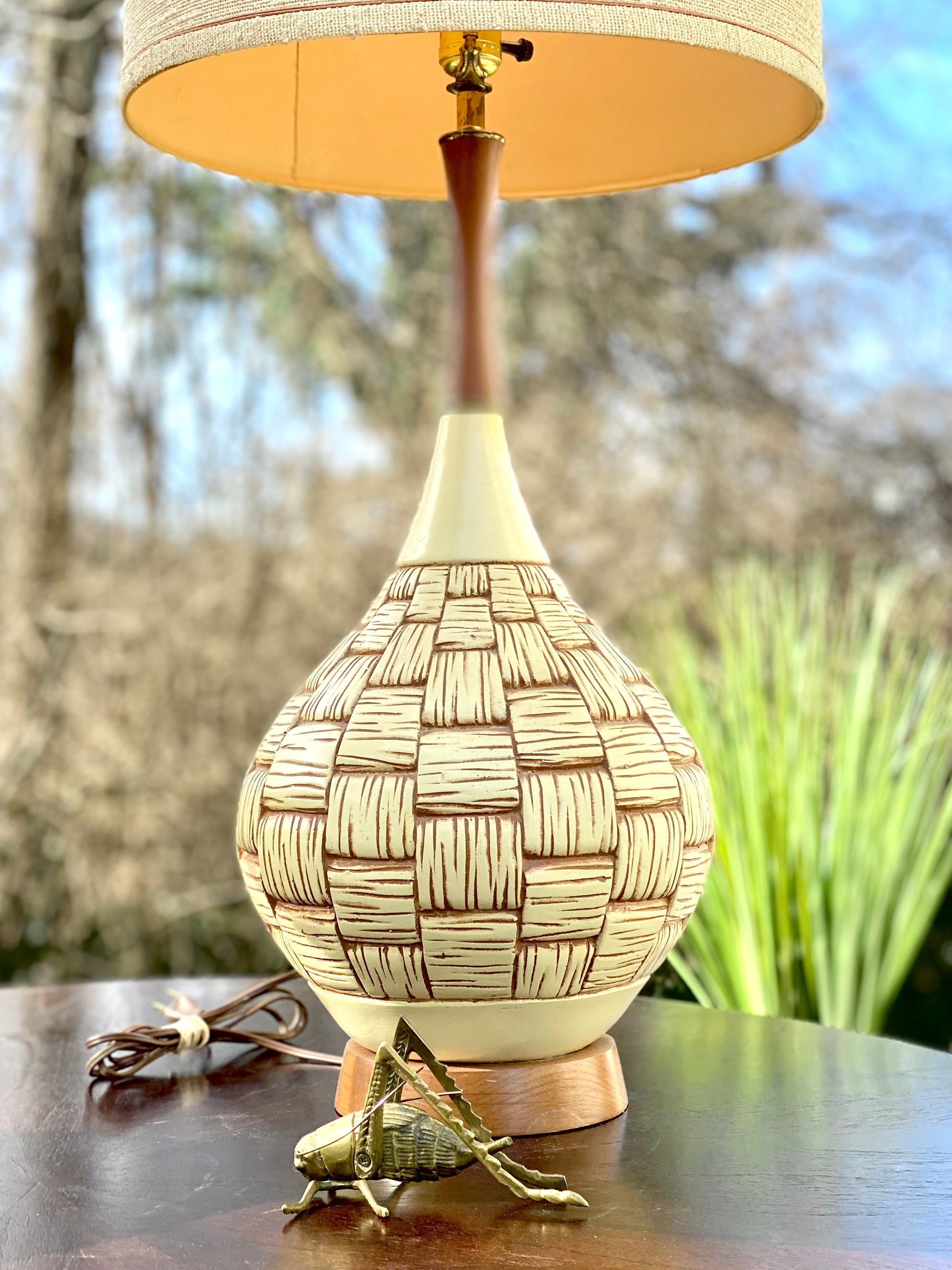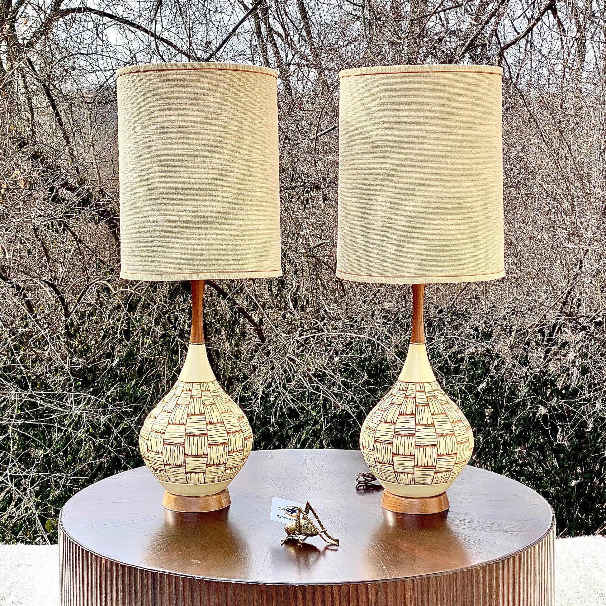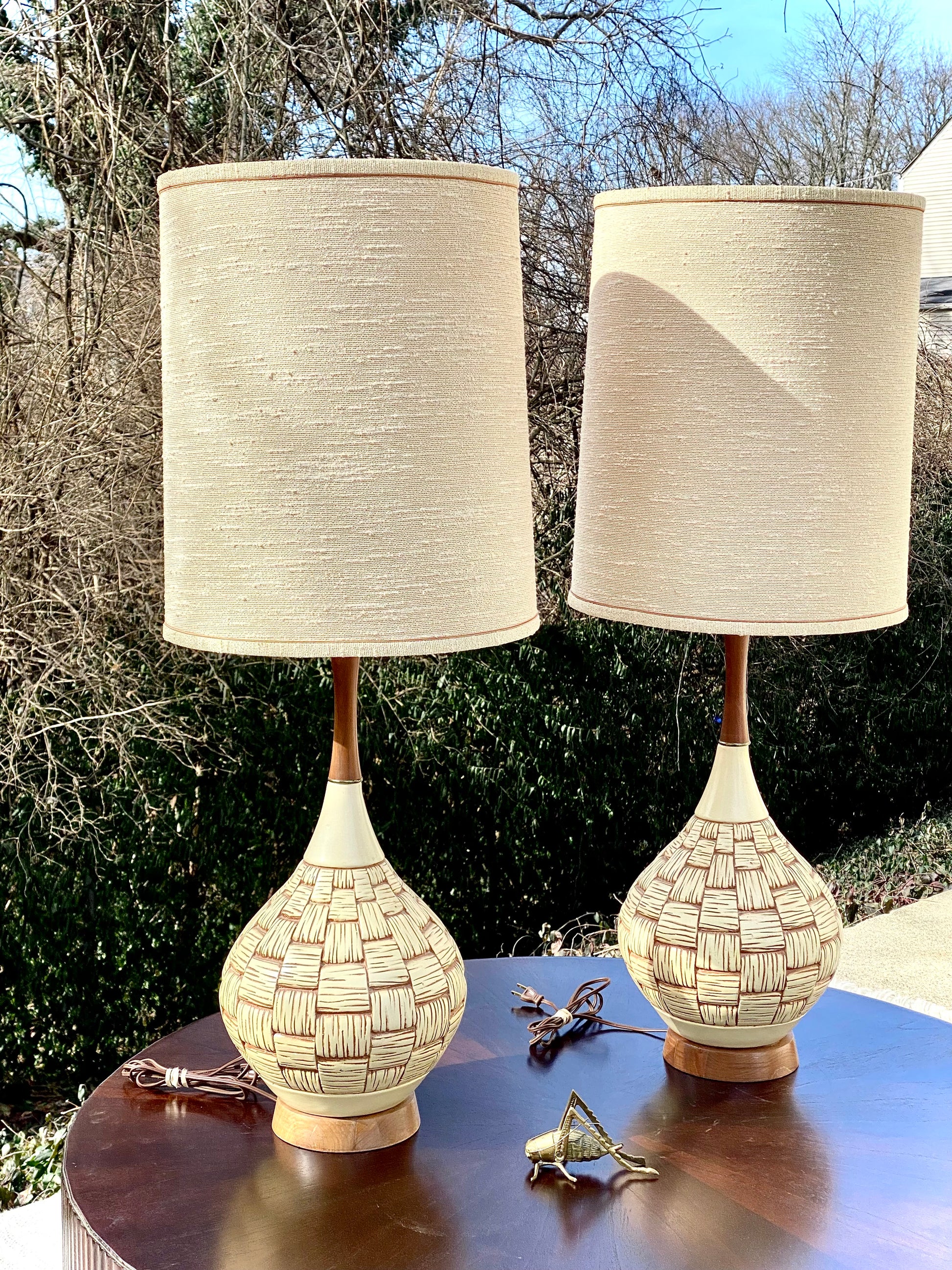 Fresh find! ❄️🍁 Check out this great pair of vintage MCM mid-century modern lamps. Original barrel shades with a basket weave design. Nice working condition on both lamps. 39”h x 14”w Good condition