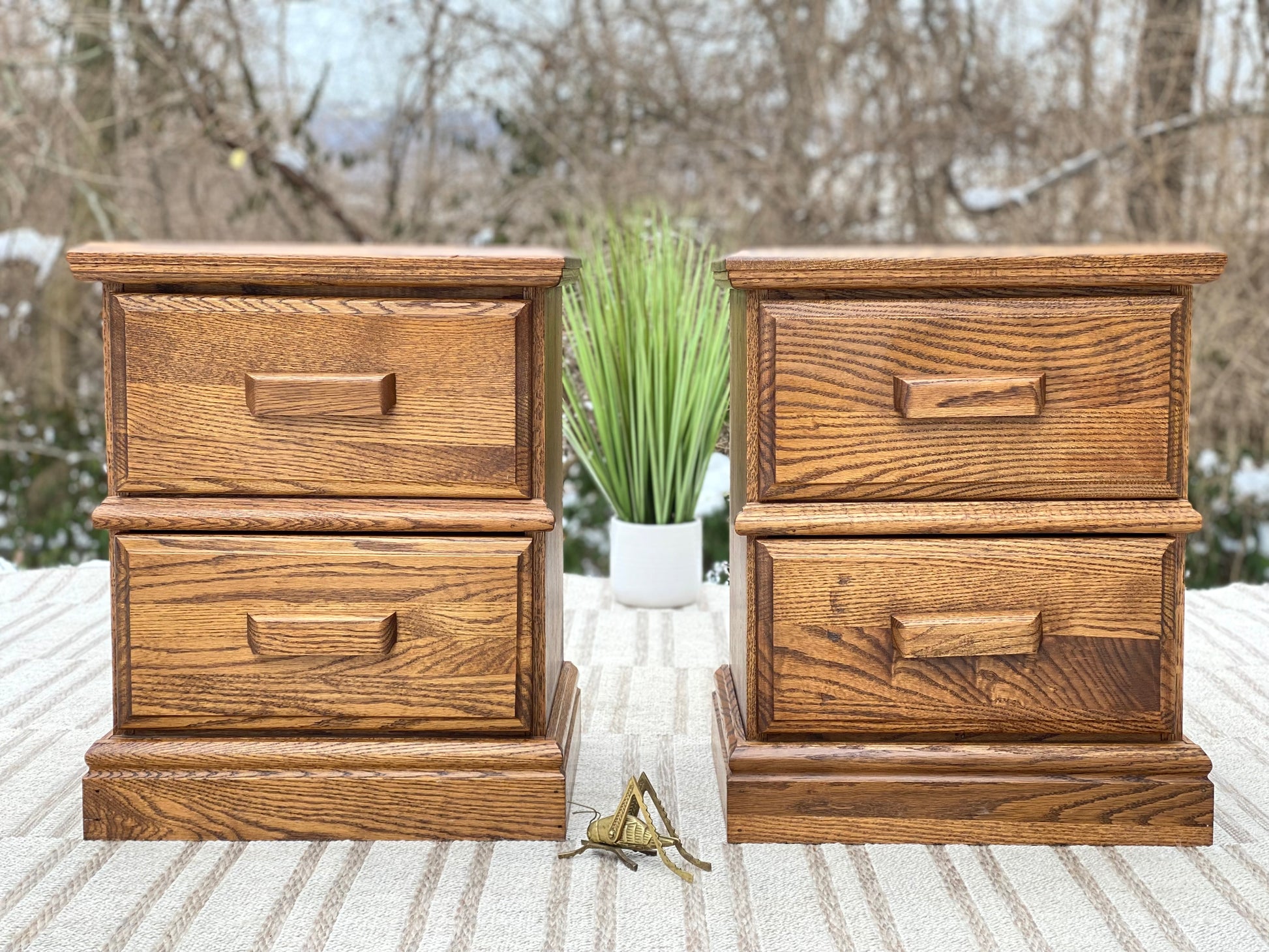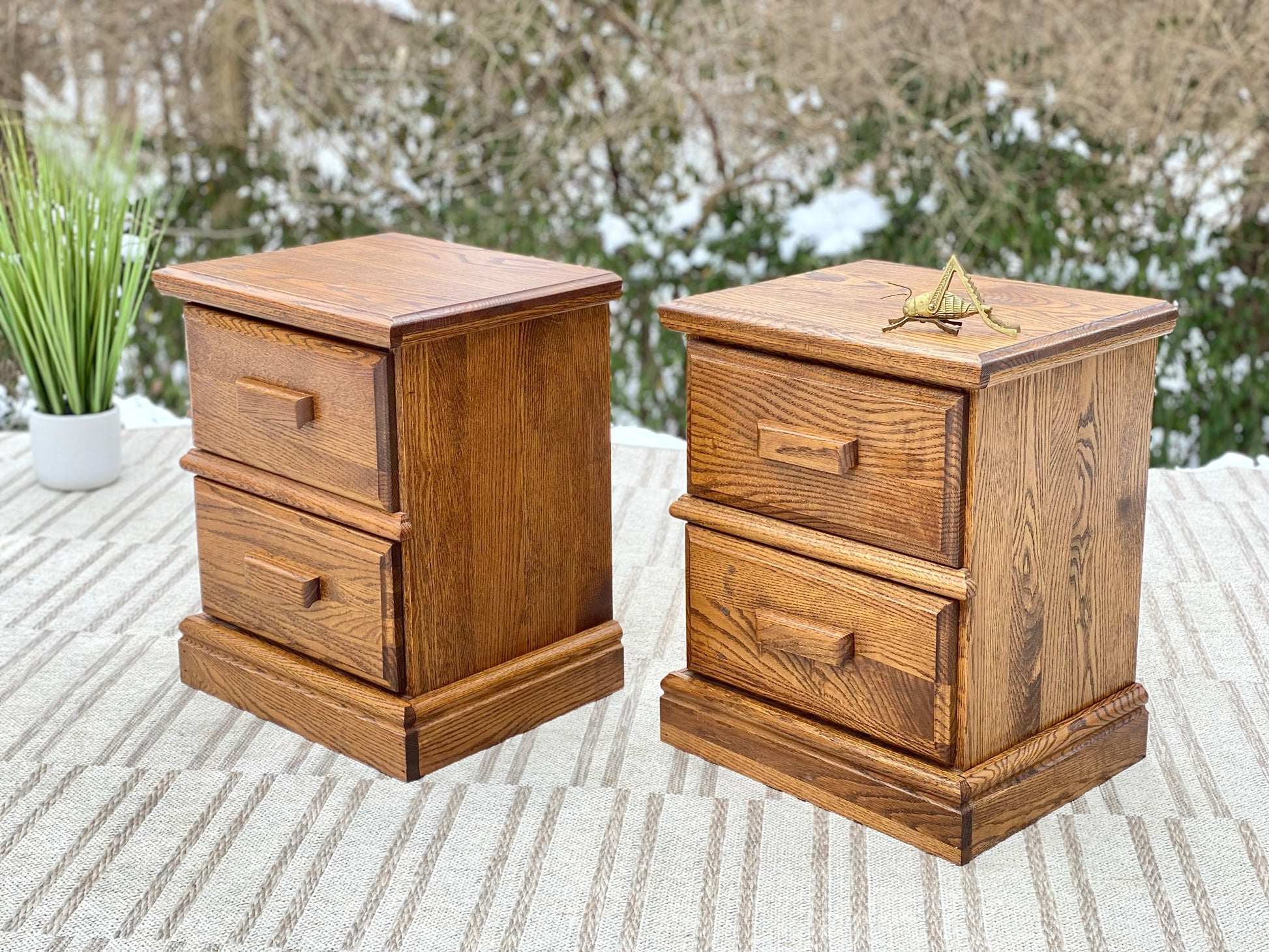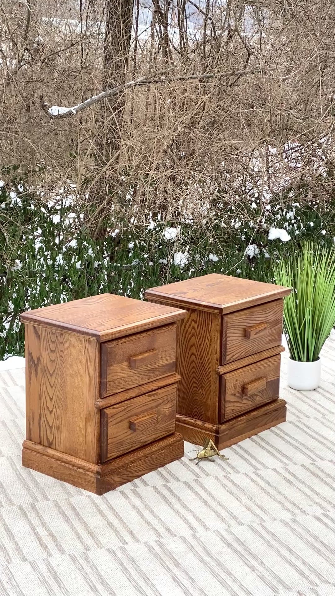 SOLD - New arrival! ❄️❄️ Check out this great pair of vintage oak nightstands. Both come with two drawers each, and have a medium stain with a classic design. 22” x 18” x 15”