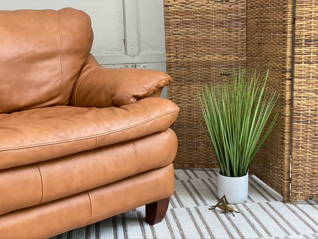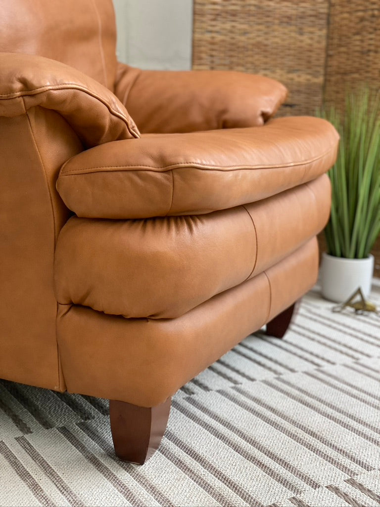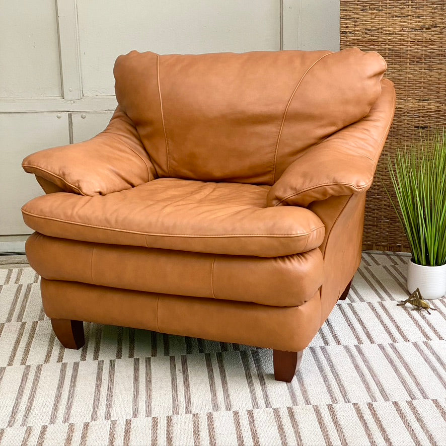SOLD - Classic tan leather armchair. Comfortable plush seating and a great fit! Good condition. 36" x 46" x 40" #leatherchair #leather #furniture #shoplocal #cincinnatismallbusiness #velvetcricket
