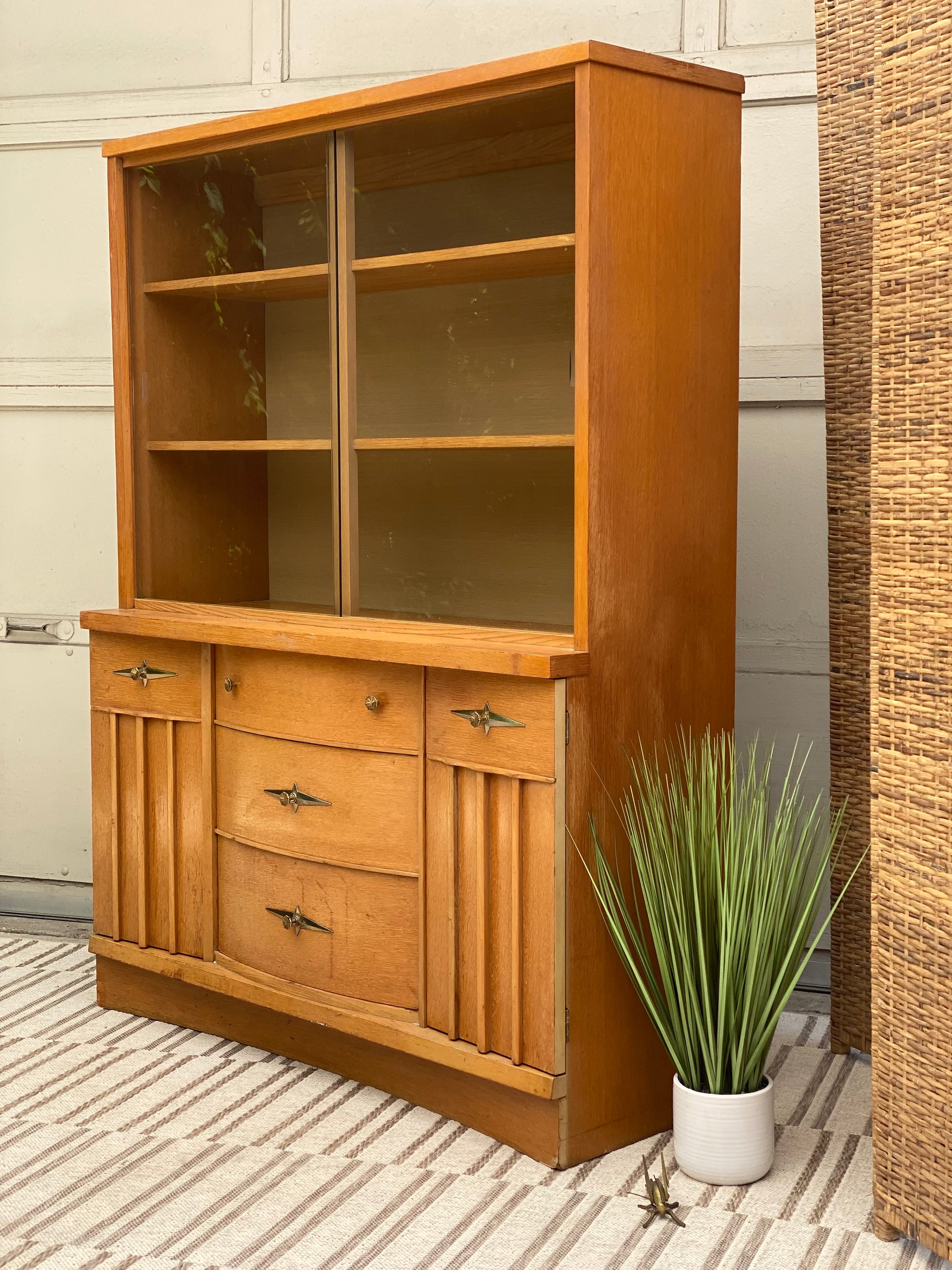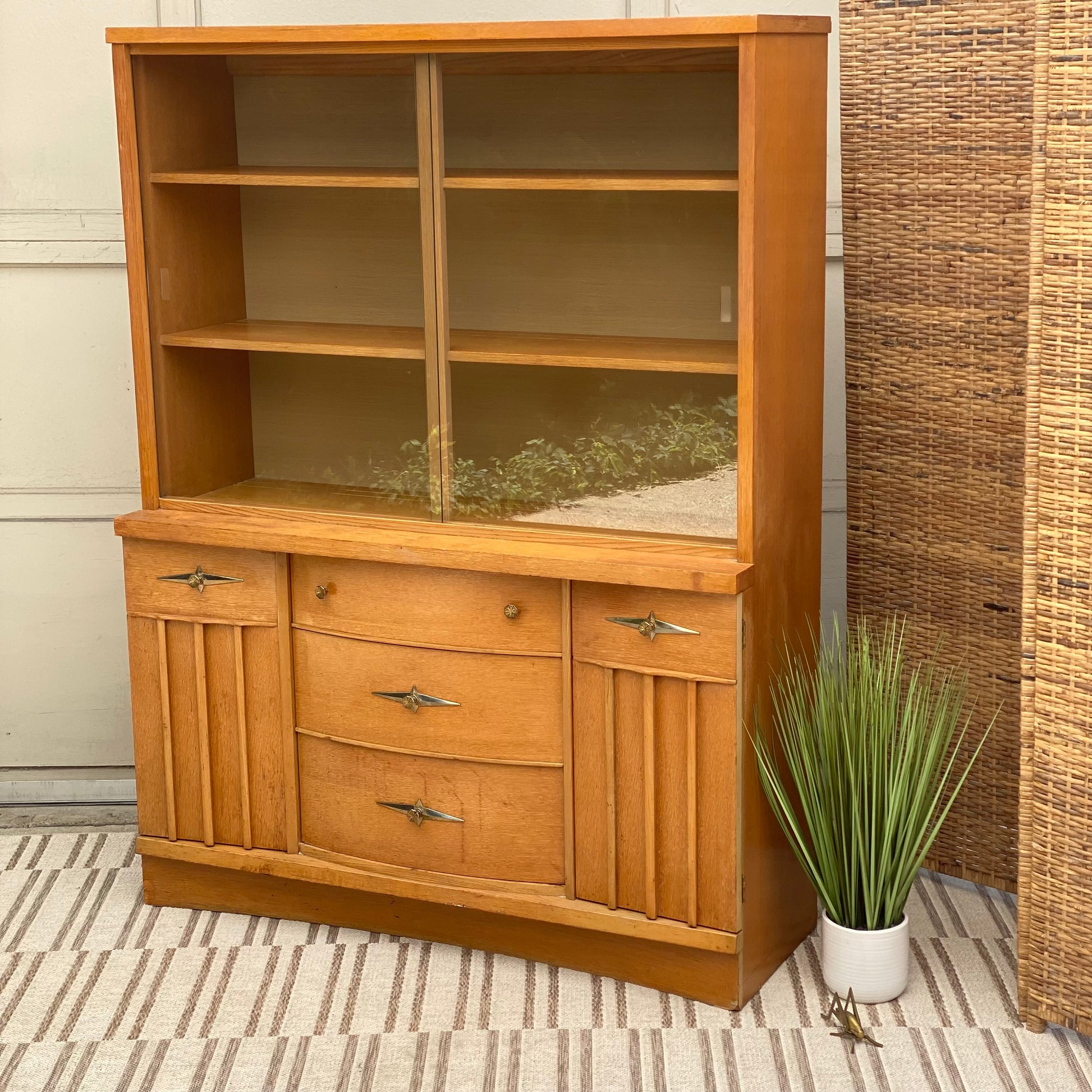 SOLD - Nice vintage MCM mid century modern light colored hutch. Lots of great storage with sliding glass doors. 64" x 48" x 17". Good condition