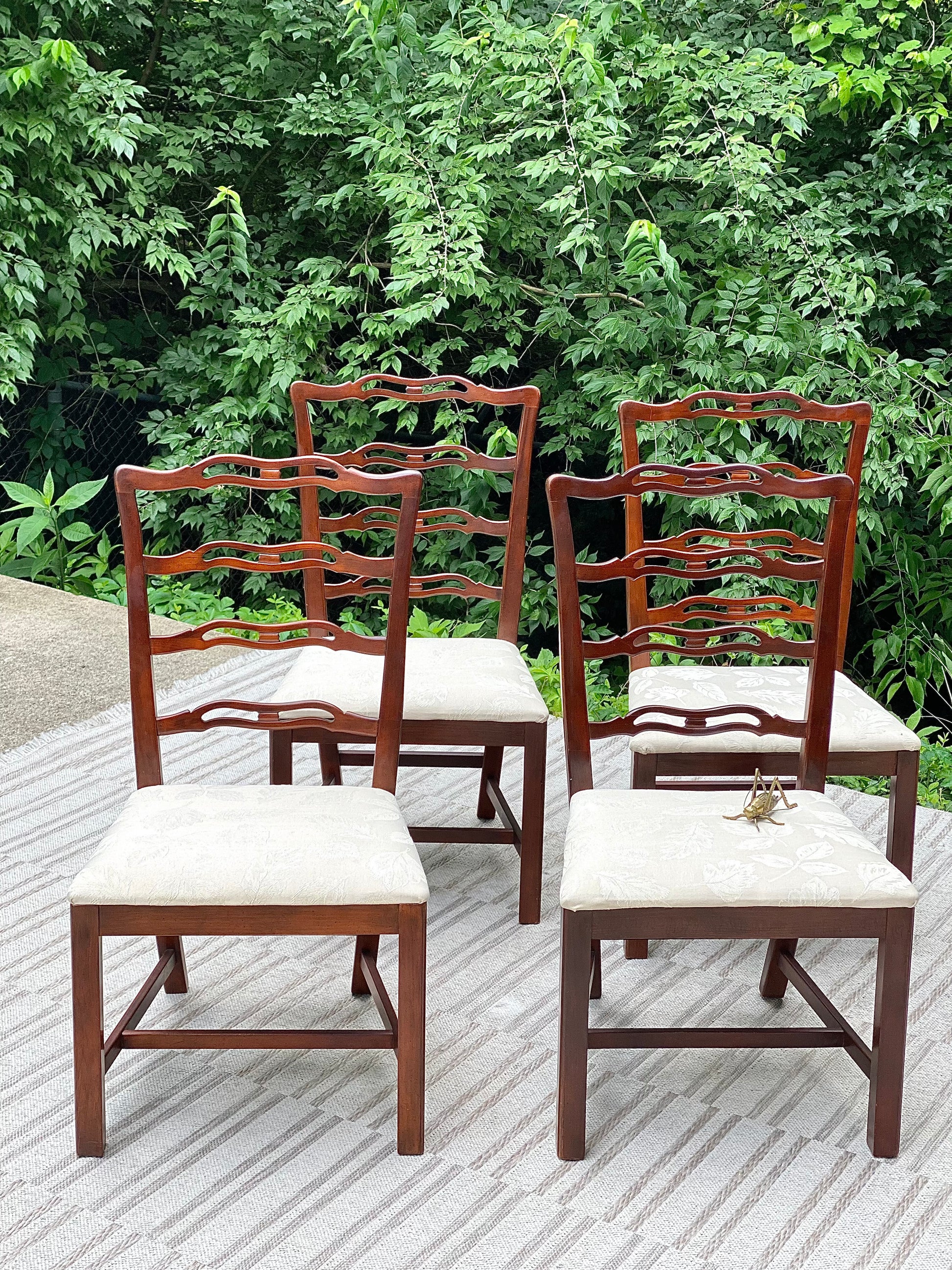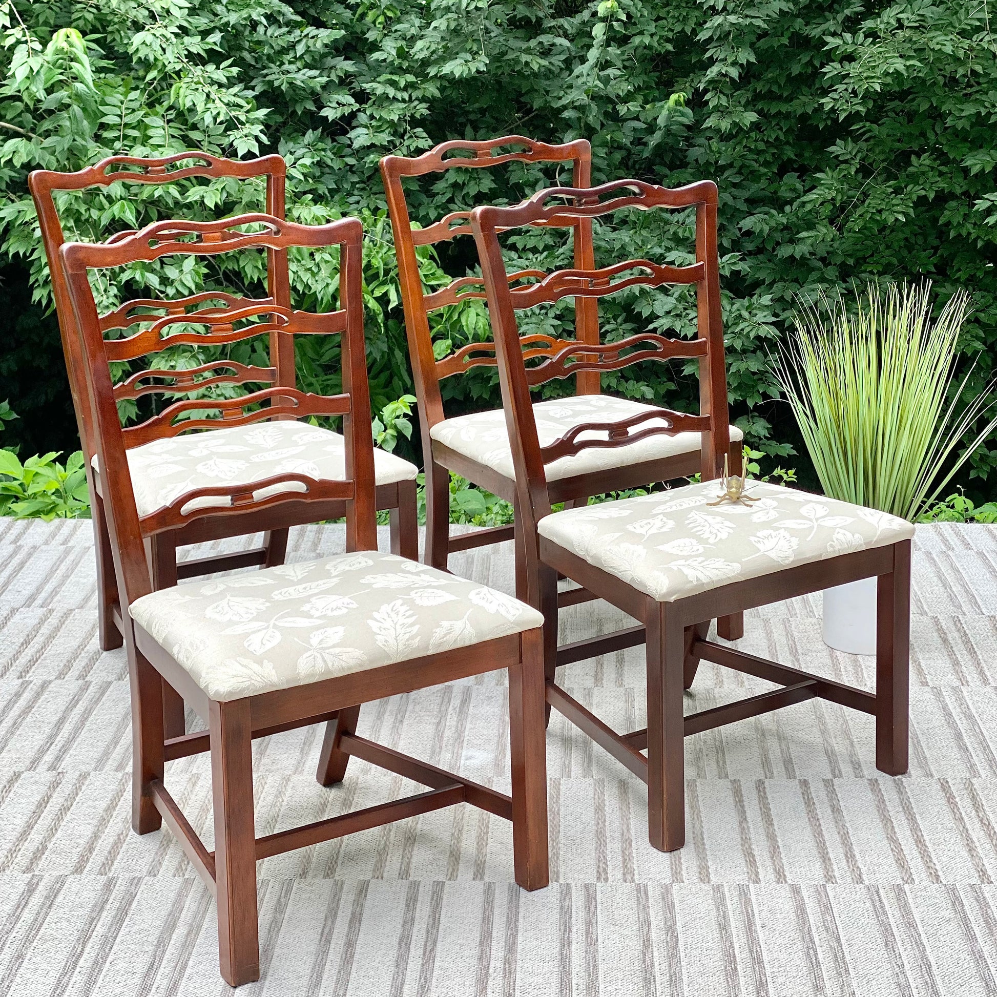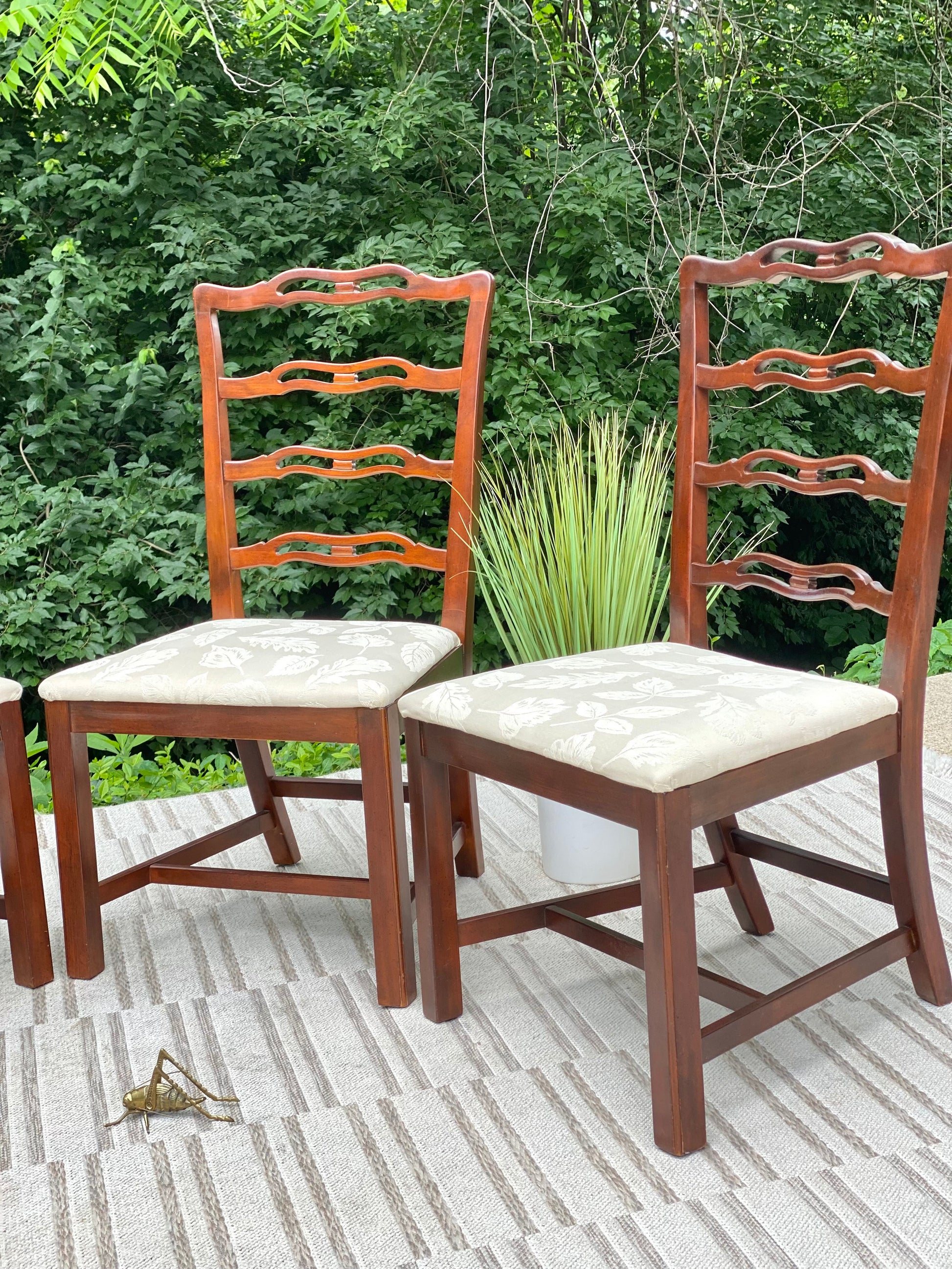 SOLD - New arrival! 🪴🌱 Check out this nice set of mahogany stained Drexel heritage dining room chairs. Beautiful upholstered pattern and ready to go! 38” x 20” x 21” Good condition