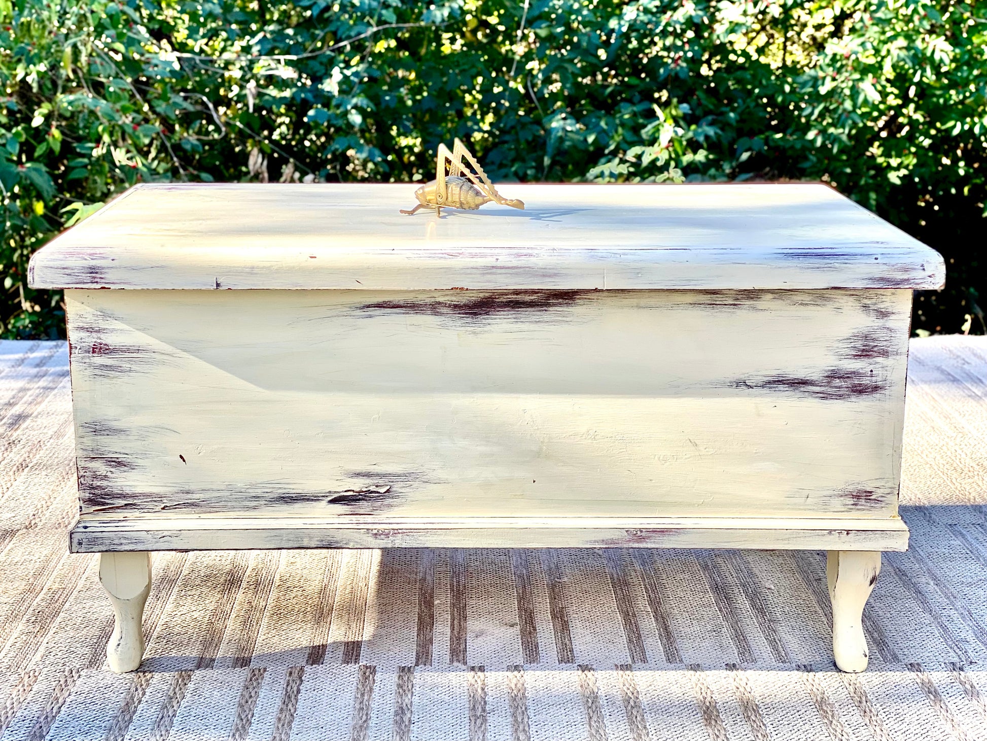 SOLD - New arrival! 🍁🍂 Check out this vintage footed cedar blanket chest with white distressed paint. Great little size for storage and a nice little decor piece. 18”h x 34” x 18” God condition