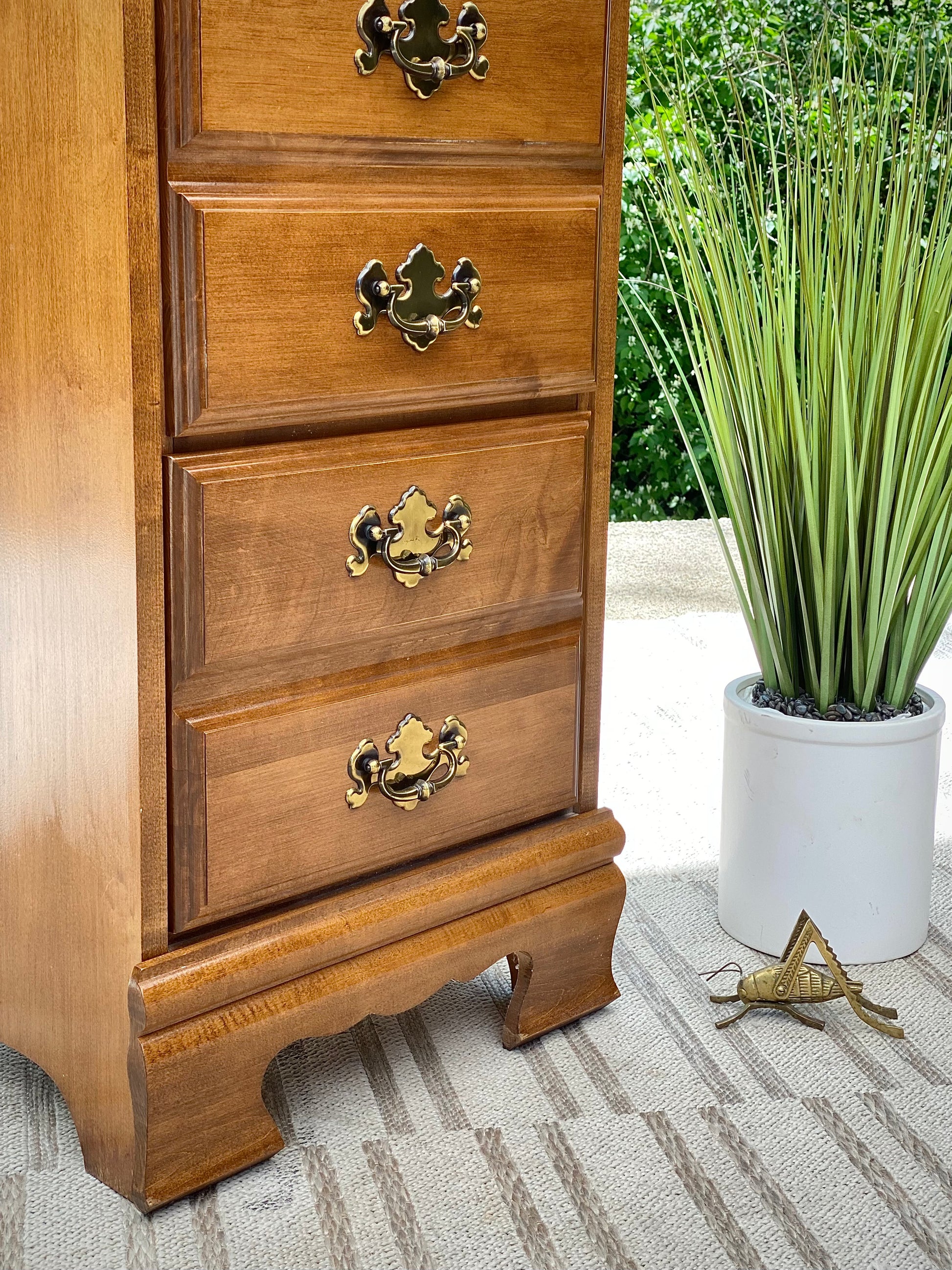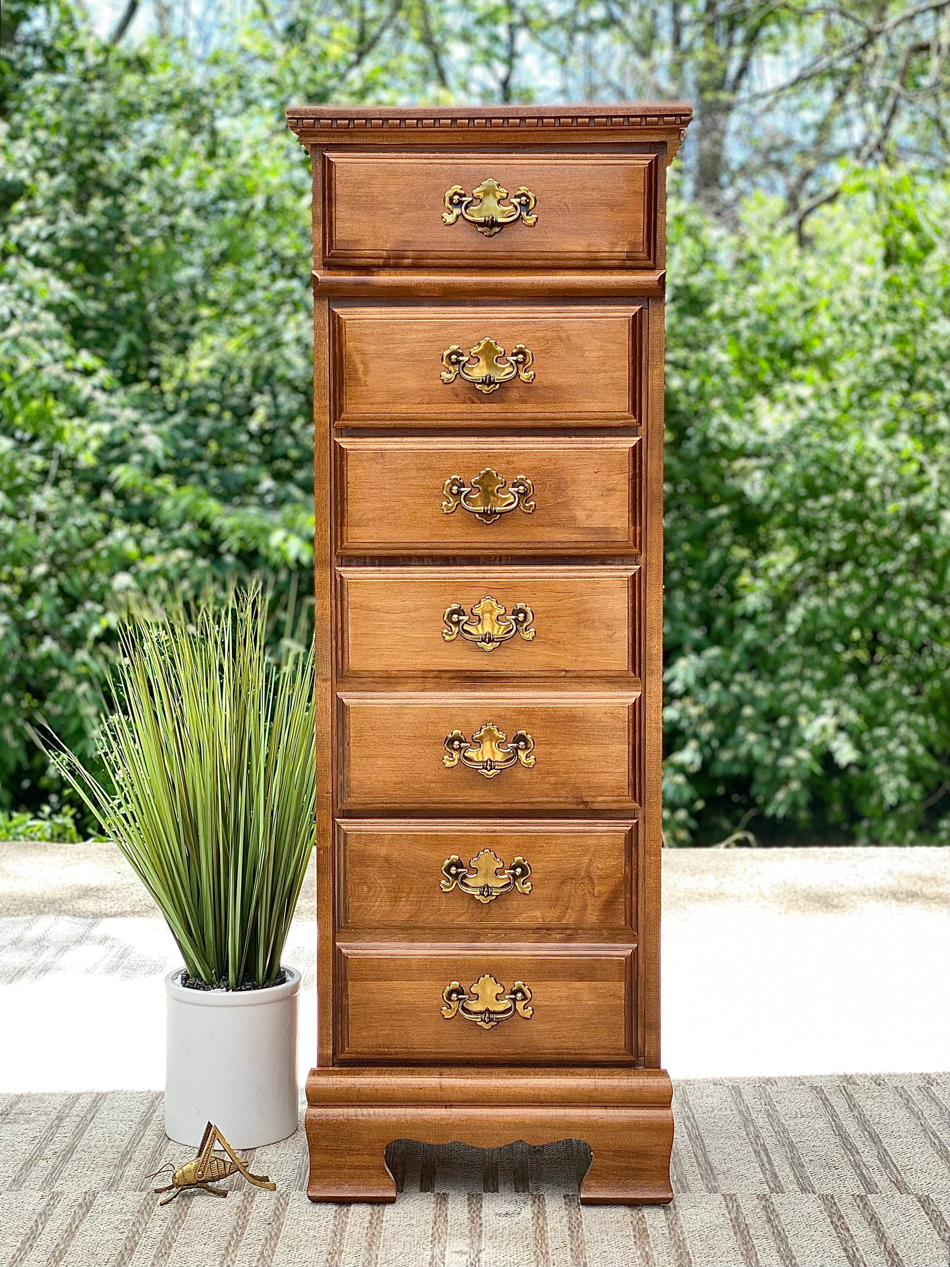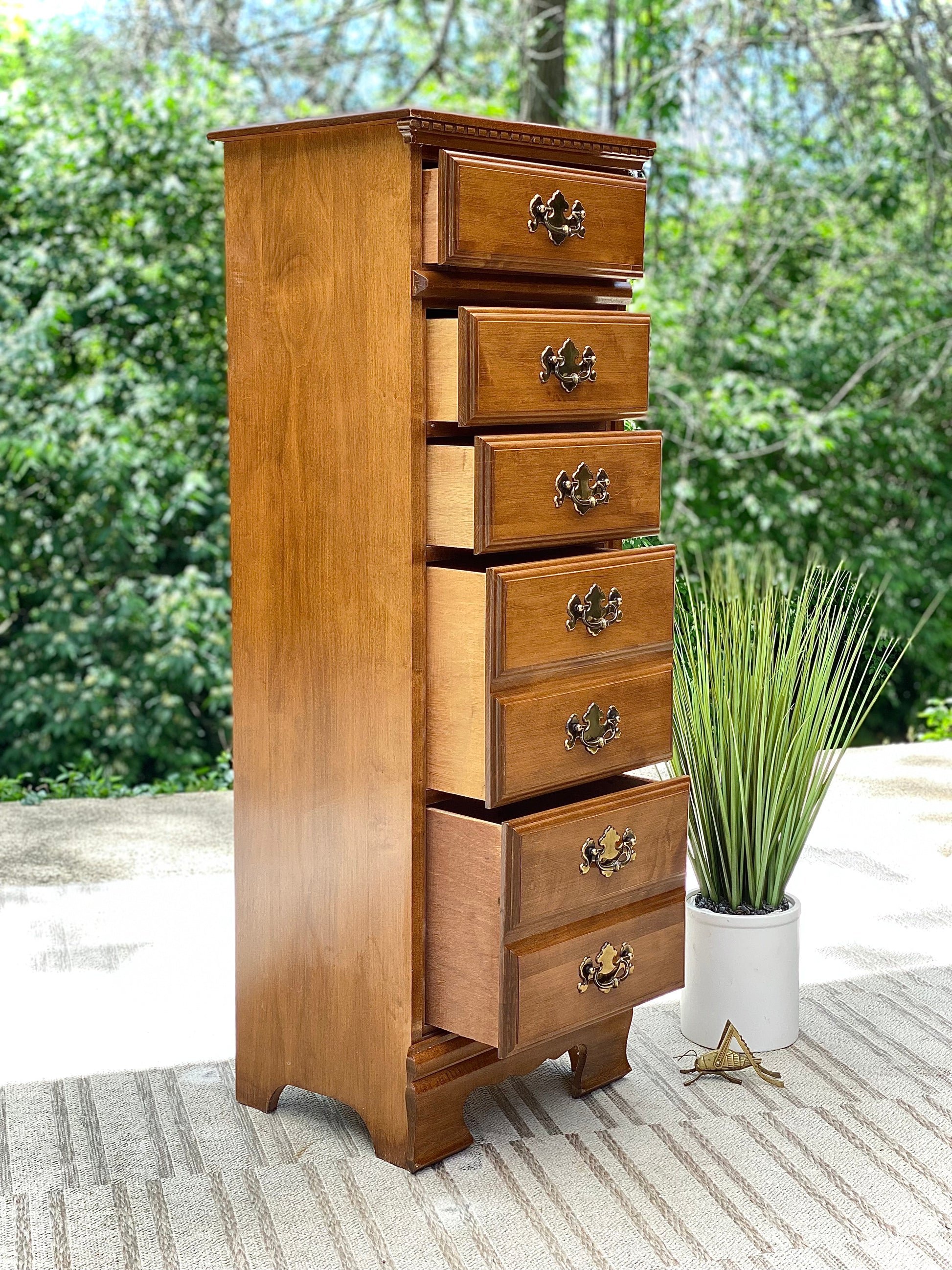 SOLD - Fresh find! 🪴🌱 Check out this unique chest of drawers. Tall, slender profile with five drawers and original hardware. 50” x 18” x 14” Good condition