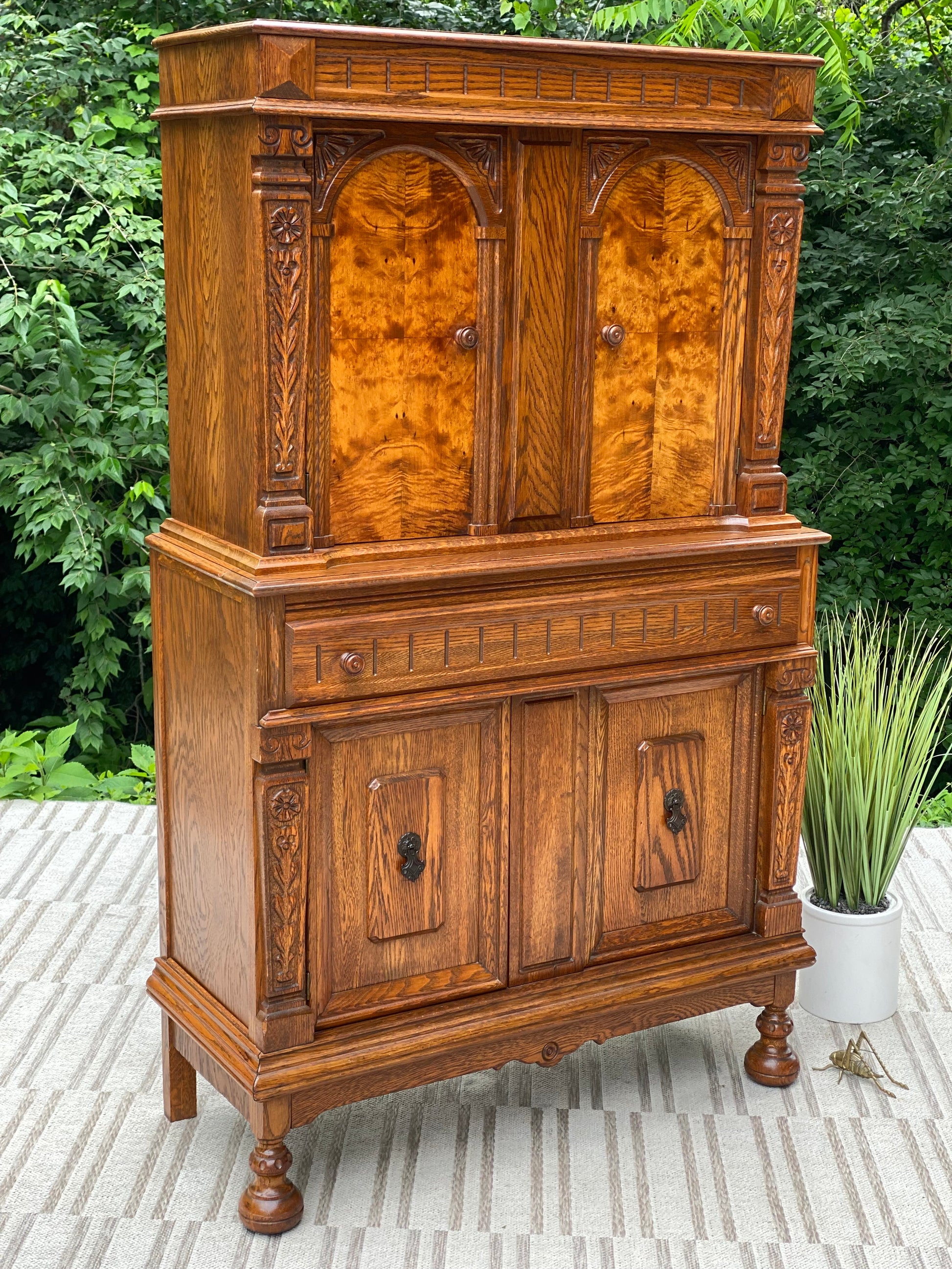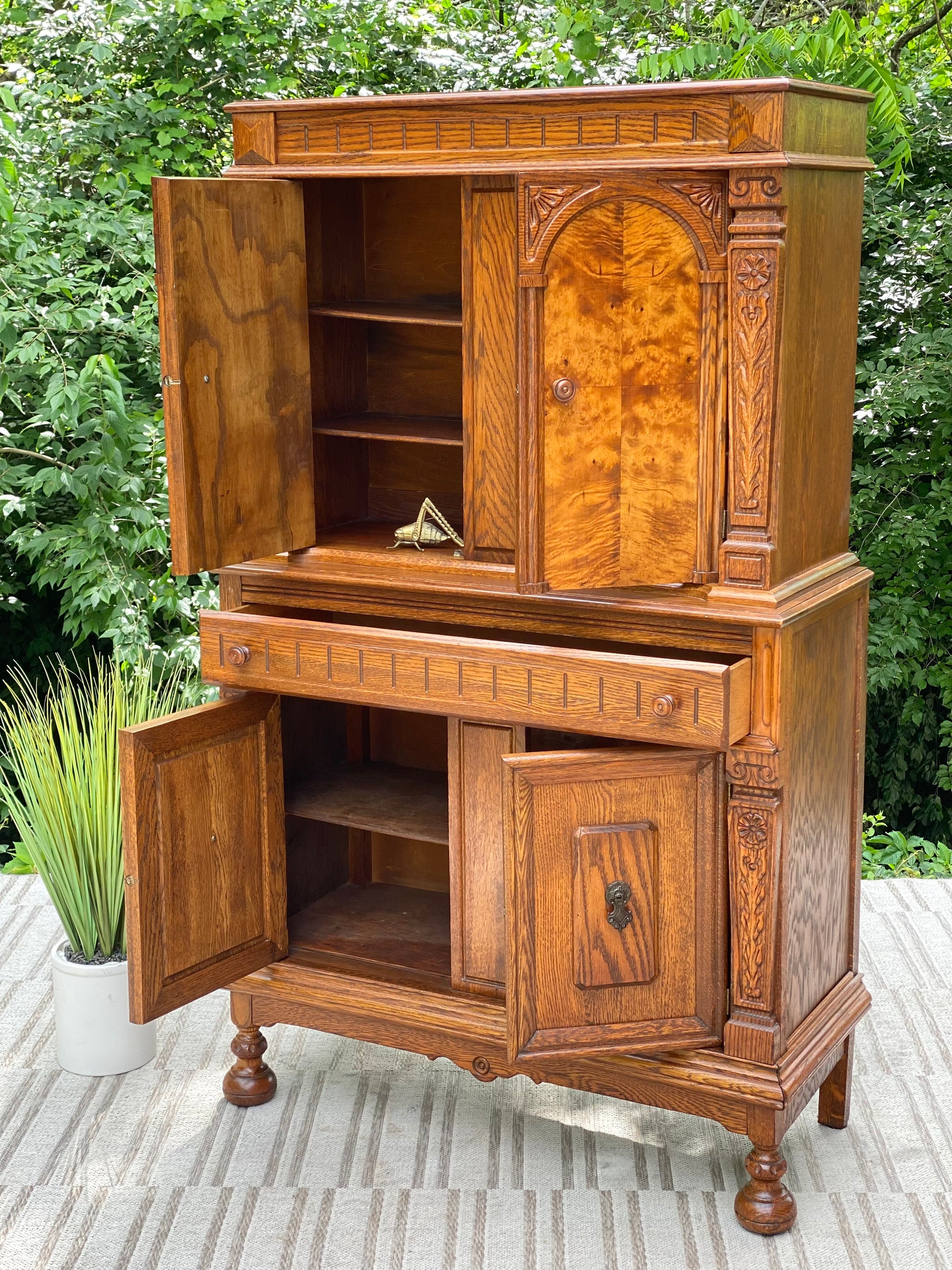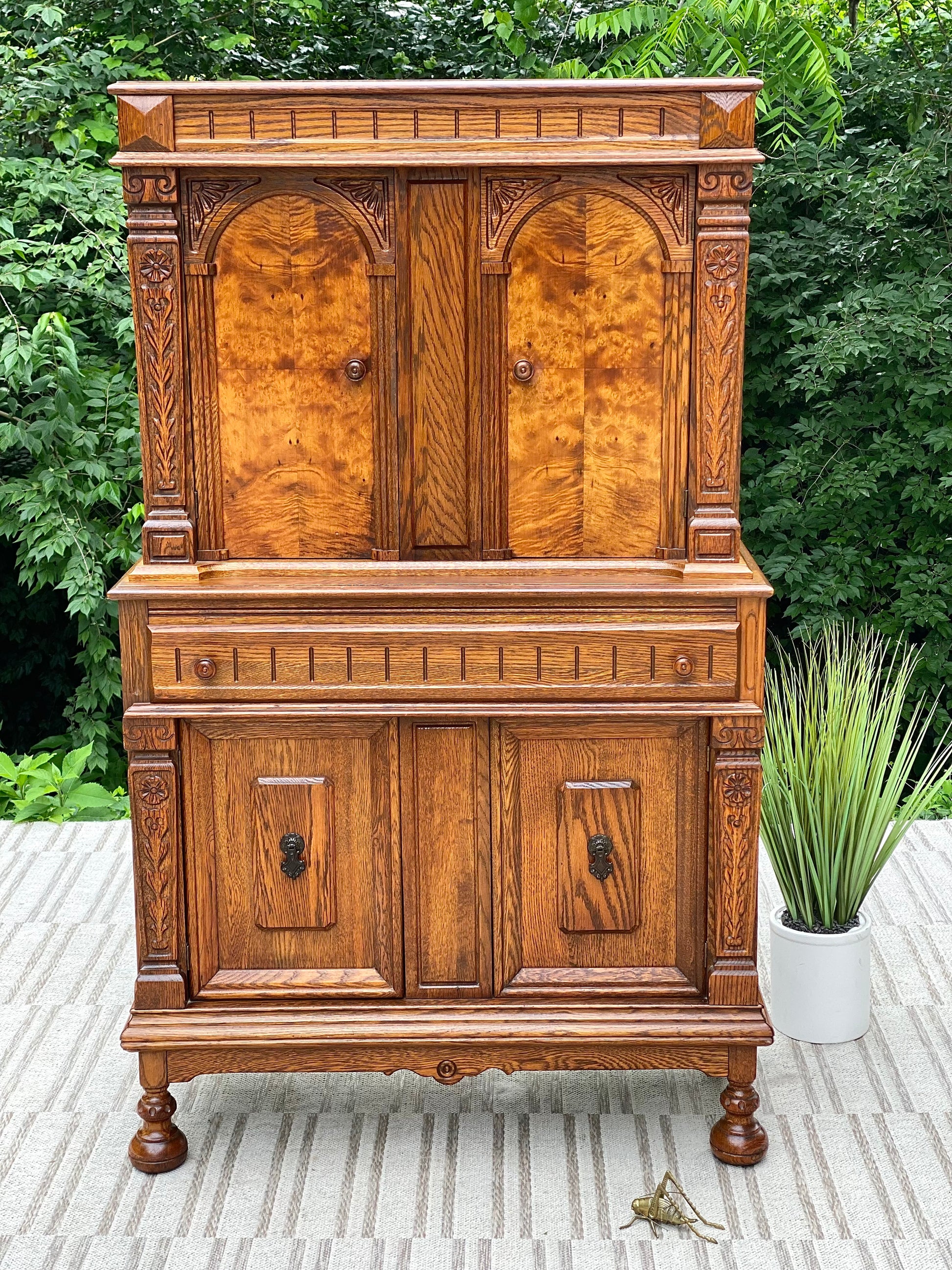 SOLD - Fresh find! 🌱🪴 We love the vibe of this antique walnut tall cabinet. Burlwood fronts and plenty of drawer and cabinet space. Very unique look! 64” x 38” x 17” Good condition