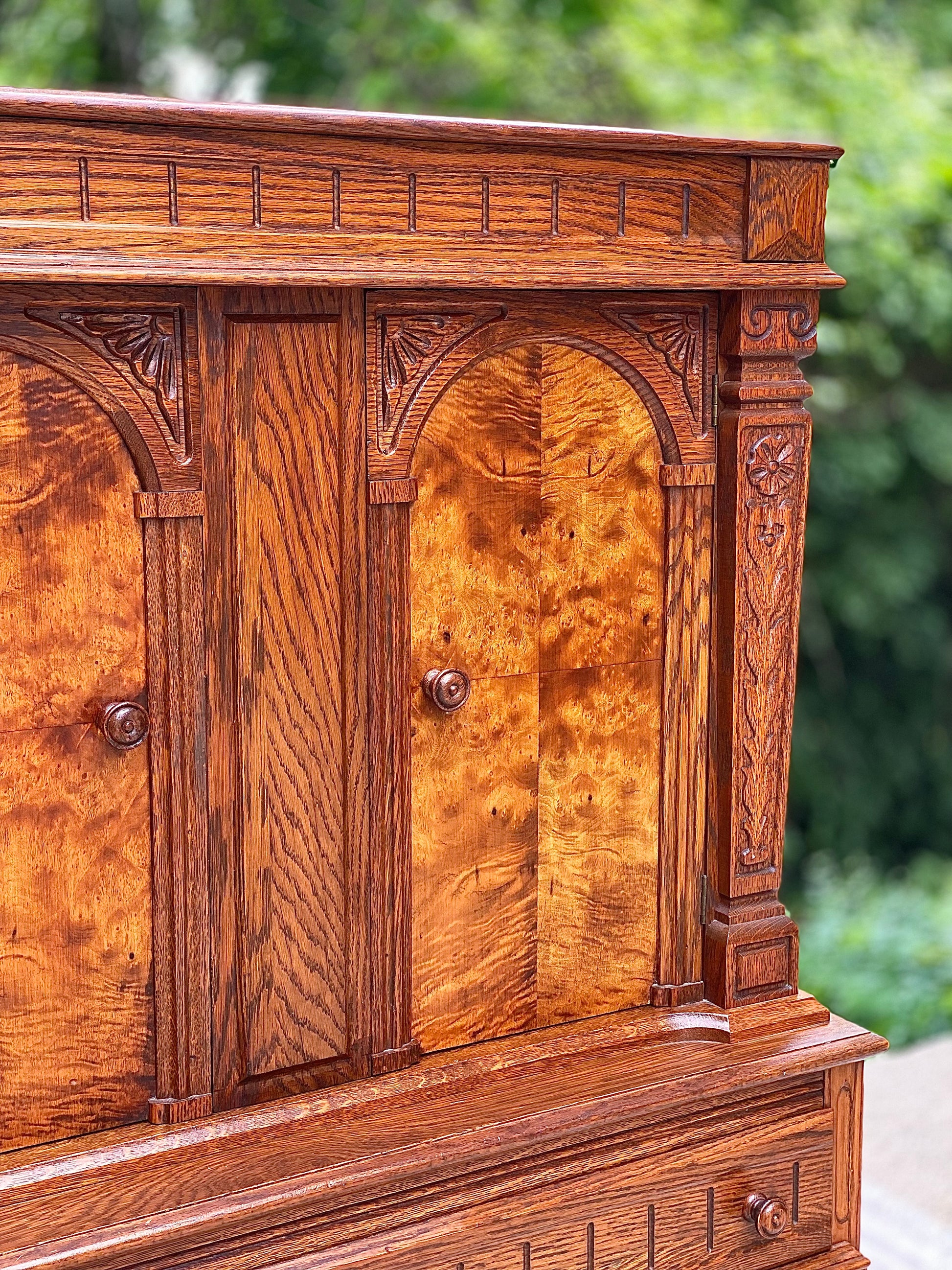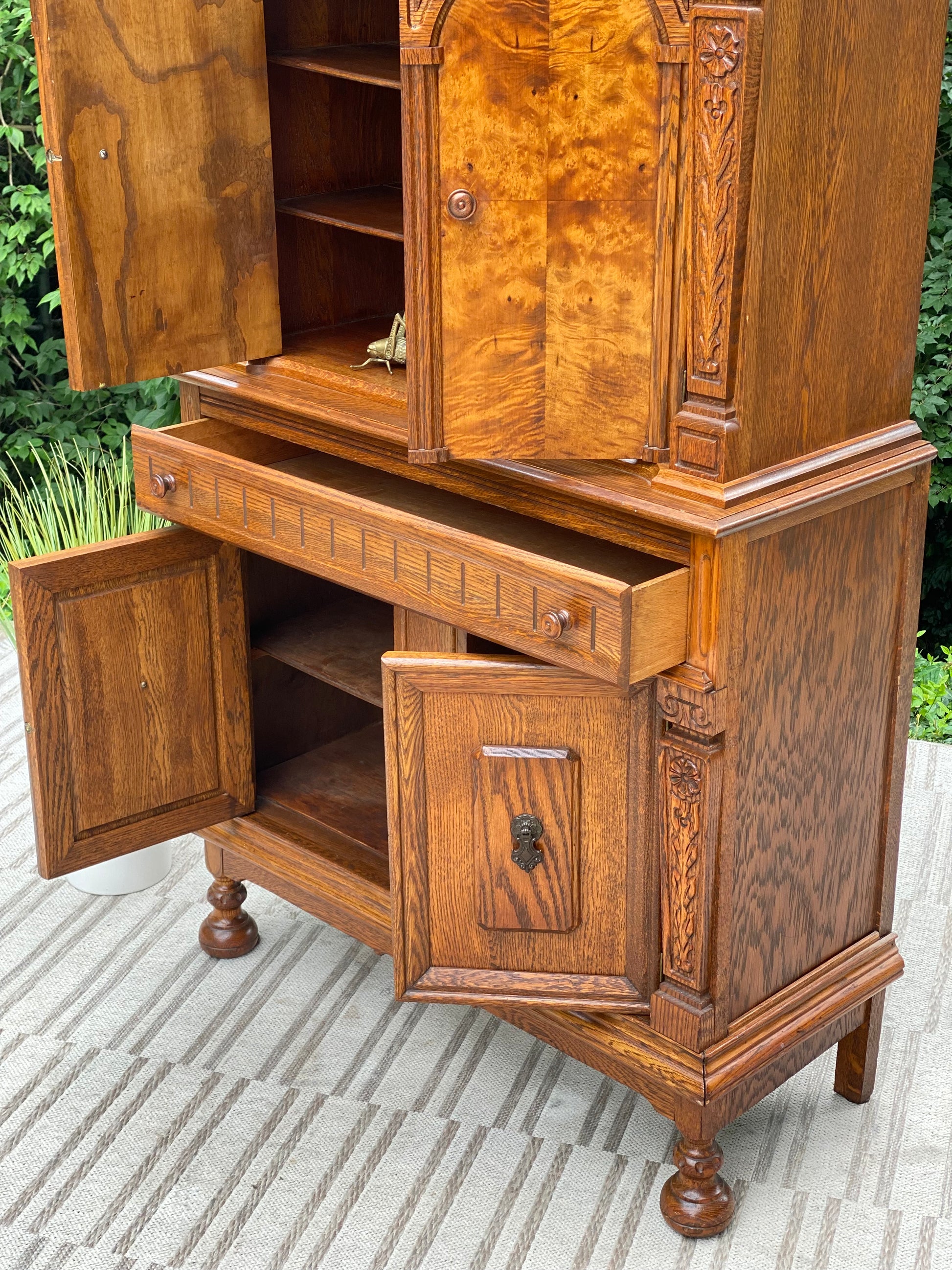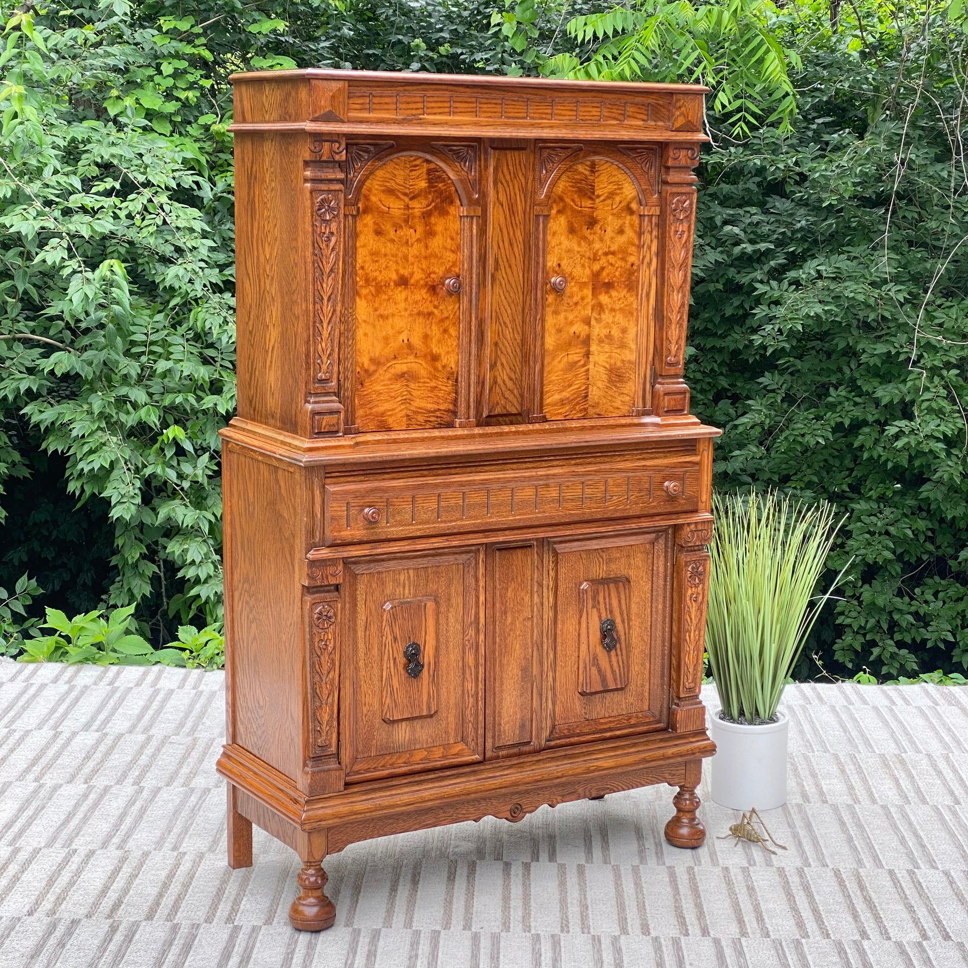 SOLD - Fresh find! 🌱🪴 We love the vibe of this antique walnut tall cabinet. Burlwood fronts and plenty of drawer and cabinet space. Very unique look! 64” x 38” x 17” Good condition