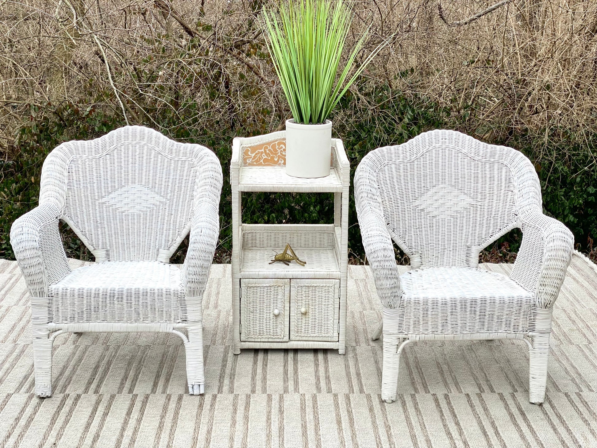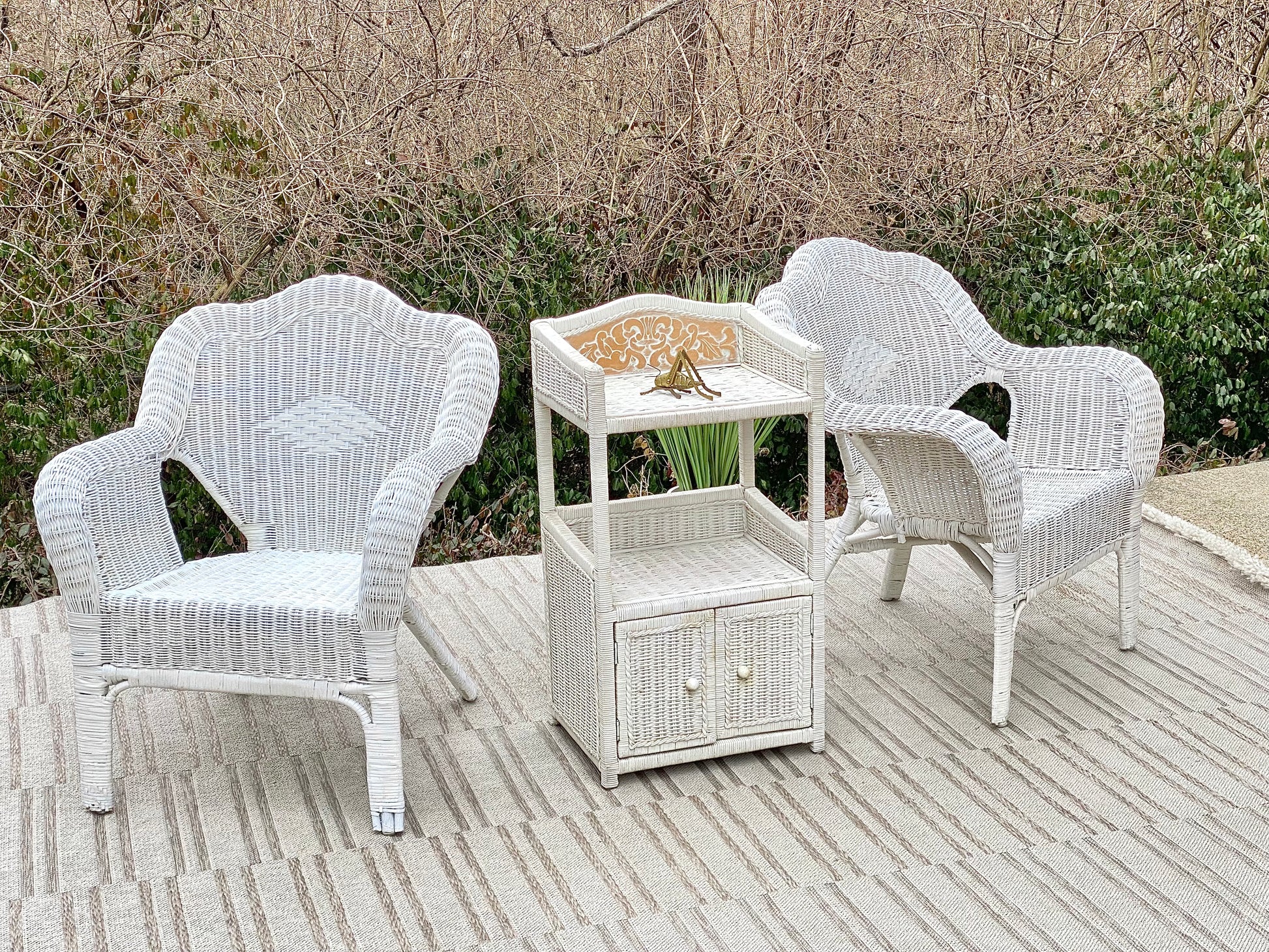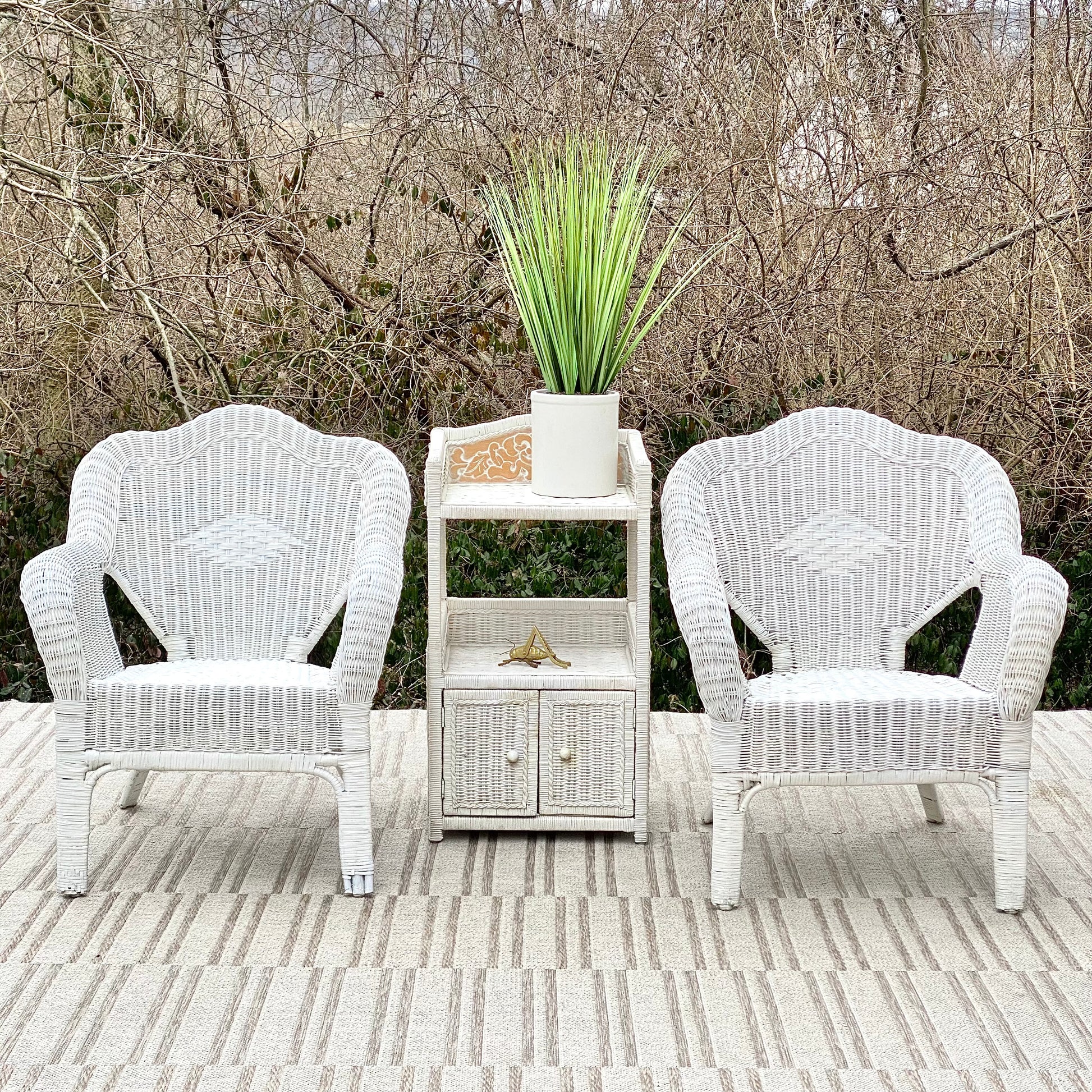 SOLD - Fresh find! 🌱❄️ Check out this vintage three-piece wicker set. Two chairs and a nice side table cabinet. 33” x 29” x 33” Good condition