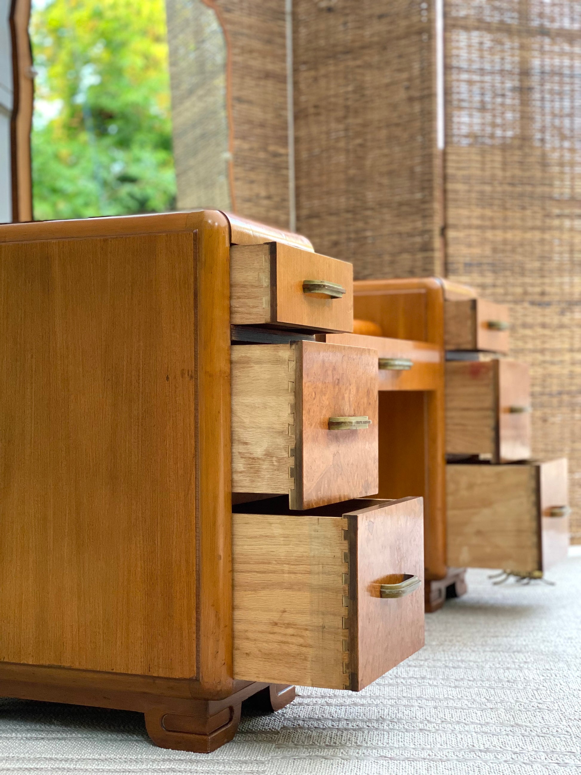 SOLD - New Arrival! Check out this Art Deco maple vanity with mirror. Great curved edges with lots of storage. Great accent piece! 53" x 50" x 20". Good condition
