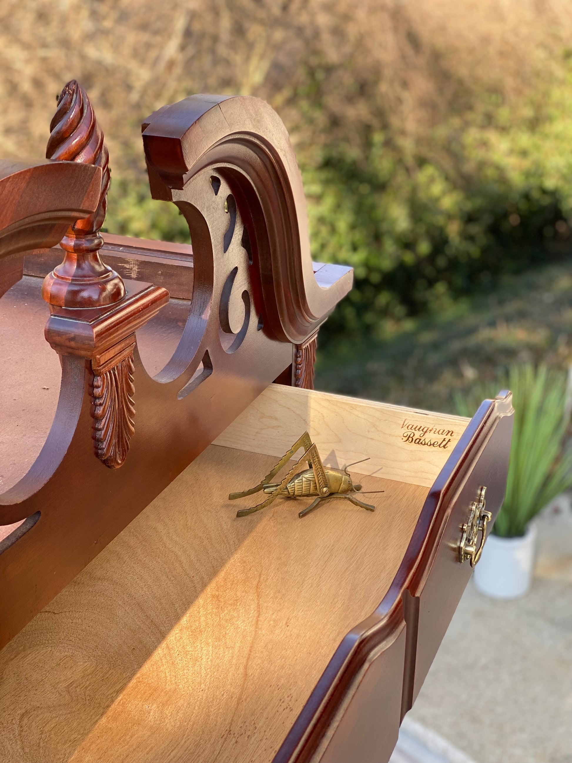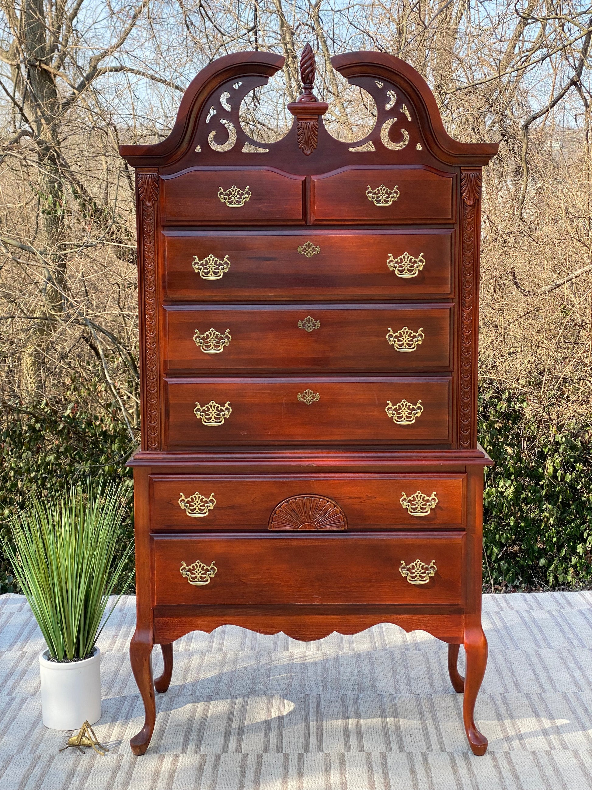 SOLD - Fresh find!! 🌱❄️ Check out this nice dark stain Vaughn Bassett 2 piece highboy dresser. This chest of drawers has a classic vibe with tons of storage. 76” x 36” x 19” Good condition